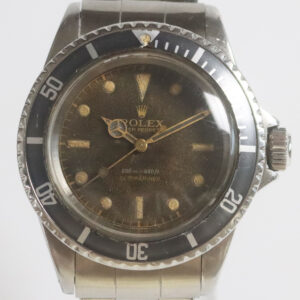 この時計は1954年に最初に作られた180m(後に100mに変更)防水モデル、REF.6204の後継機種REF.6205となります。6204からの変更点と言えばリューズが5.3mmから6mmに変更となりました。この時計は文字盤に防水表記がありませんのでもしかすると当初インストラクションブックで600ft防水(=180m防水)と書かれていましたが(1953年~1954年)、直ぐに330ft(=100m防水)に変更となりましたのでその間に作られた文字盤かと思われます。文字盤に若干の経年の劣化が見られますが、全体にブラウン系にの変色が見られ、大きなダメージのない当時のままのアンティークテイストに満ちたオリジナルコンディションとなっております。ケースは厚みの残ったとても良い状態で、ベゼルに関しましてはこの初期型の当時のベゼルディスクは15分の目盛りの無いものとなっておりますが、15分の目盛りのある恐らく形状から後継機種の6536、6538の後期、1950年代の終わりのベゼルディスクとなっております。ブレスレットはオイスターリベットブレスレットとなっておりとても良いコンディションとなっております。