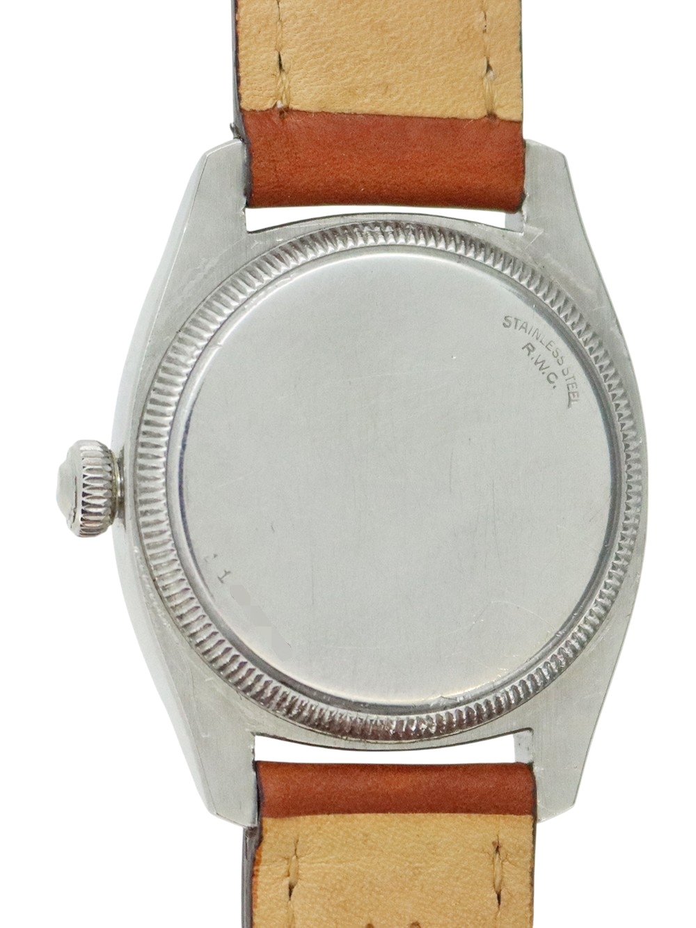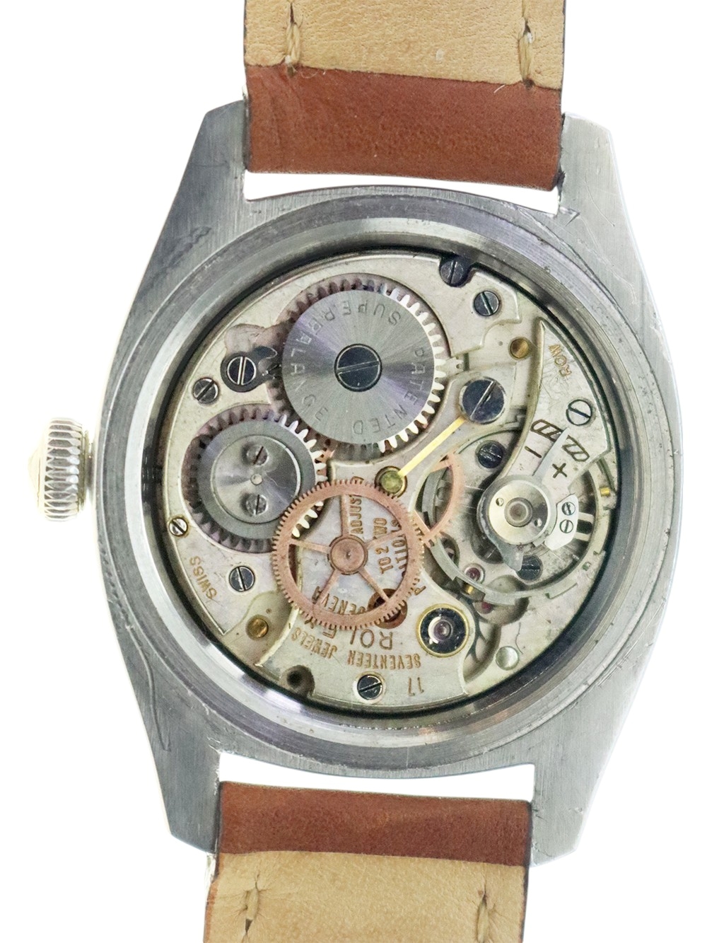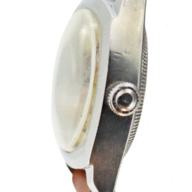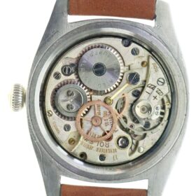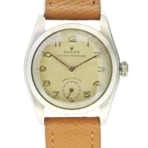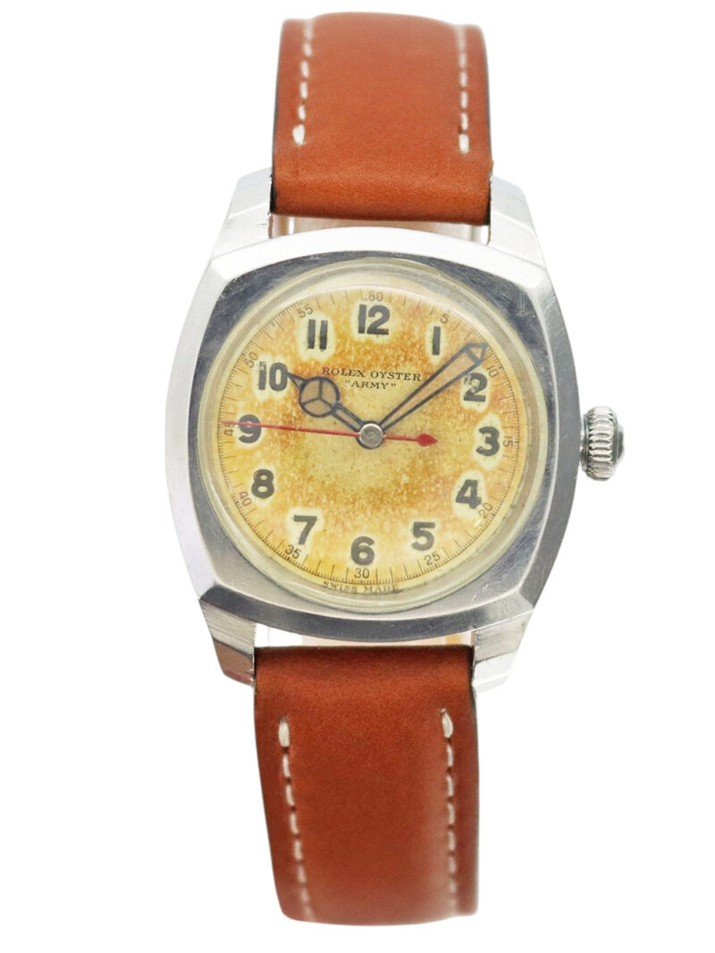 1920年代に中葉にロレックス社は防水時計のパテントを取得し、1930年頃までにほぼ初期型のオイスターケースが出そろいました。 最初期型のオクタゴンケース、最も多いスピードキングモデル、ROYALモデルに使われたオイスターケースを初めとして、トノー型のバイセロイケース、クッション型のアーミーモデルケース等特殊なモデルを除き主に作られたオイスターケースは手巻きモデルを中心に製造販売されていました。 このアーミーモデルの時計は文字盤にARMYのプリントが入れられた、クッション型を特徴とする主力モデルでしたが、次第にバブルバックと呼ばれた自動巻きモデルが主流になるに連れてこの手巻きアーミーモデルは1940年代で姿を消しました。 ですので、アンティークロレックスモデルの中で、比較的手巻きモデル初期型のみで生産完了をしてしまったアーミーモデルは数が少なく希少品となっております。