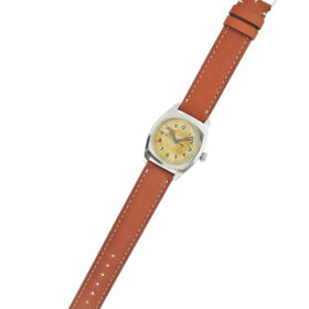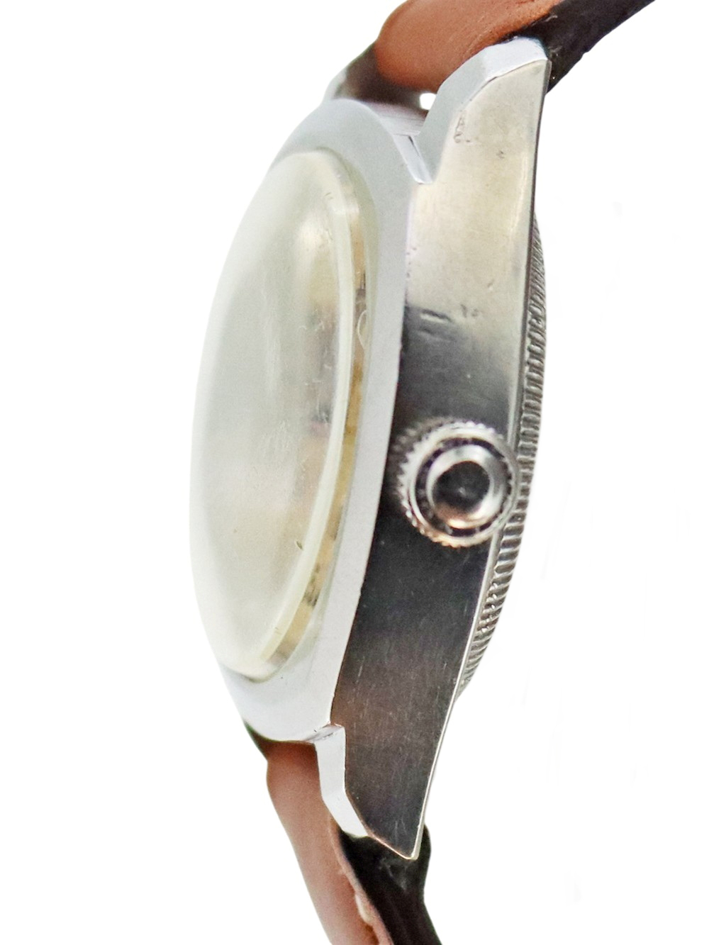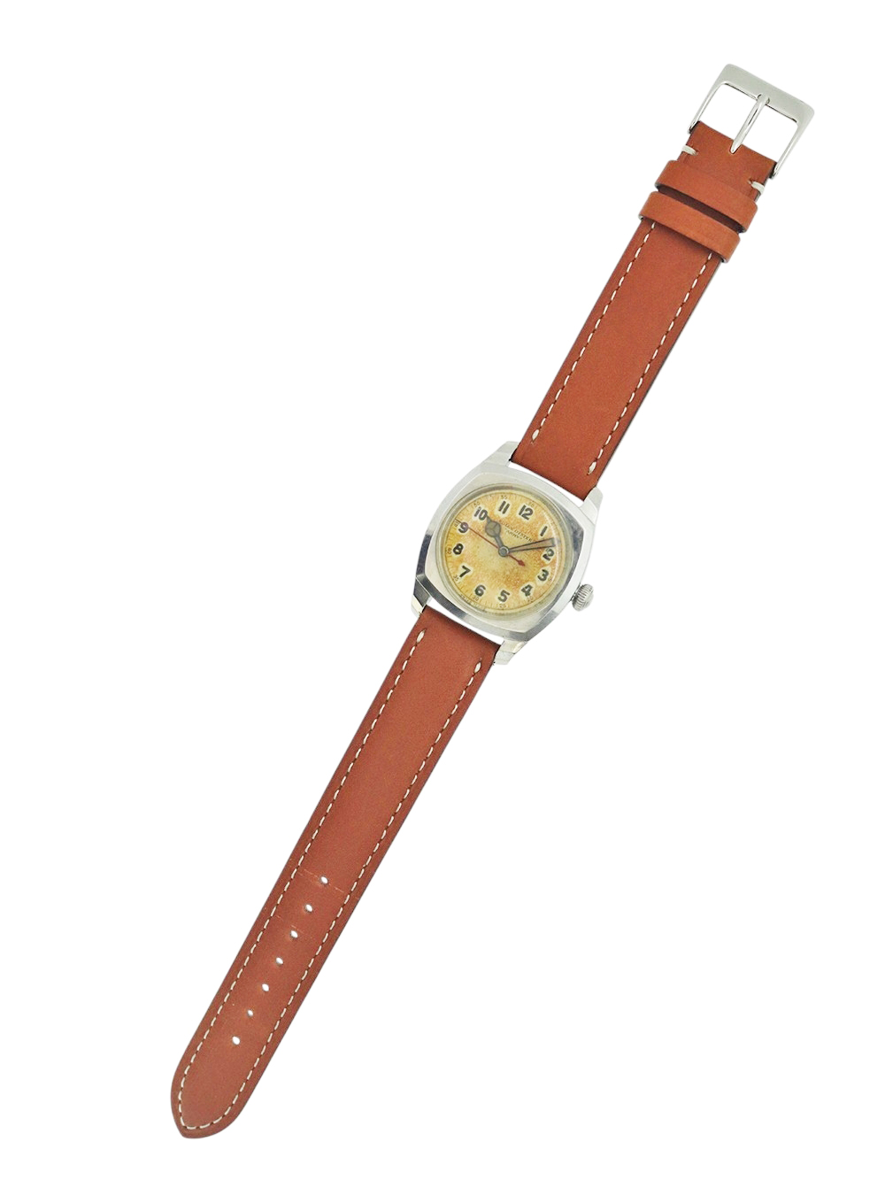 この時計は1940年初頭のARMYモデルです。 シルバーサテン仕上げでシンプルな夜光塗料のアラビア数字にブルースチールのメルセデス型針の組み合わせとなっておりロレックスらしいデザインとなっております。 文字盤全体がかなりパンプキン色に焼けており年代の経過を強く感じさせるとてもアンティーク感の感じられる状態となっております。ケースもほぼ磨きの掛かっていないエッジがシャープな状態で当時のままのオリジナルコンディションとなっております。