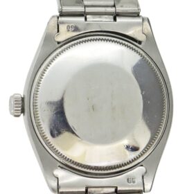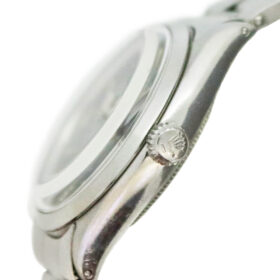 何れにせよこのモデルは珍しいサークルミラーダイヤルモデルの一つでライトゴールドとシルバープリントの仕様となっており殆どダメージの無い強い光沢感のある文字盤となっております。 ロレックス社の場合プリントの色が違う場合はその仕様(防水性能、クロノメーターか否か)に因って後からプリントを加える工法で文字盤表記と仕様を合わせる手法を取っていたのでそのような文字盤が多々存在致します。ブレスレットも同年代のオイスターリベットブレスレットでクラスプ刻印がビッグロゴと呼ばれる大き目のエンブレム刻印のブレスレットとなっております。