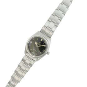 時期的にはほぼエクスプローラー1 REF.1016の製造時期と同じ為、この5500はミラーサークルダイヤルが最初期、サークル無しのミラーダイヤルがセカンドで後にマットダイヤル仕様と製造が続き、1970年代まで製造されました。 但しマット(艶消し)ダイヤルに関しましては2000年前後に日本のヴィンテージ市場には沢山のいわゆる”上質な書き換え”ダイヤルが出回った為本物である物まで警戒されて現在でもマットダイヤルは厳しい査定対象となっております。 このモデルはラッカーミラー(鏡面光沢)仕上げのミニッツサークル入りの最初期ダイヤルとなります。 最初期が故に文字盤の製造行程に於けます夜光塗料は文字盤に溝が彫られ埋め込みの夜光インデックスとなっております。 このモデルはシルバープリントでSUPER PRECISION 及び サークル内にSWISS MADEとプリントが成されてますが、これはこのダイヤルが恐らく1016用仕様のダイヤル仕様として1016用の版が使われた為、少し小さめの5500用ケースに入れた場合サークル外のSWISS表記がほぼ見えなくなる為に敢えて見える位置に入れなおしたか、このモデルが主にイギリス仕様として作られた為、一時期イギリスの海外輸入品に関しては独自の規定があった様でパテックフィリップの時計でさえも一時期イギリス販売用にはダイヤルボトムにSWISS MADEとプリントされていましたのでその関係でこのモデルにはSWISS表記とSWISS MADE表記のダブルサインとなっているようです。 このダイヤルのボトムのSWISS、 SWISS MADE表記は文字盤製造過程でプリントされますが、実はとても大切な表記でいわゆるホールマークに匹敵する規定があったようです。 年代と共に変遷はありますが未だにスイス製品である証となっております。 *ここまでのご説明でキャリバー1530の変遷及びダイヤルSWISS表記に関しましての考察は私共のあくまでも経験値からの推測でのご説明となりますので、ロレックス社の正規の記述や書物等に因る物ではございません。万一不適切な記述がありましたらお許し下さい。