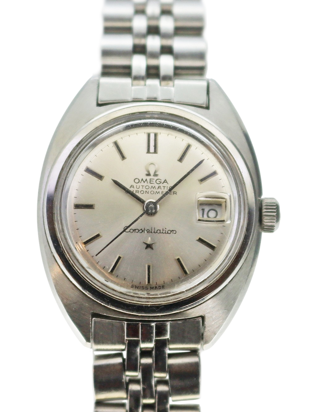 このモデルは1960年代後期のクロノメーター婦人用コンステレーションカレンダーモデルとなります。 婦人用でありながら5ポジションアジャスト及び温度変化補正のテスト済み 24石の自動巻きクロノメーターキャリバーとなっております。当時のオメガ社のレディース自動巻きモデルで一番高精度キャリバーとなります。 オメガ社らしい厚みのあるクッション型のケースで文字盤もオメガ社が多用しましたアップライドブラックマーカー付きバトン型インデックス仕様にブラックマーカー付きポインテッドバトン型針の組み合わせとなっております。 ブレスレットも含め全て当時のままのとても良いオリジナルコンディションとなっております。