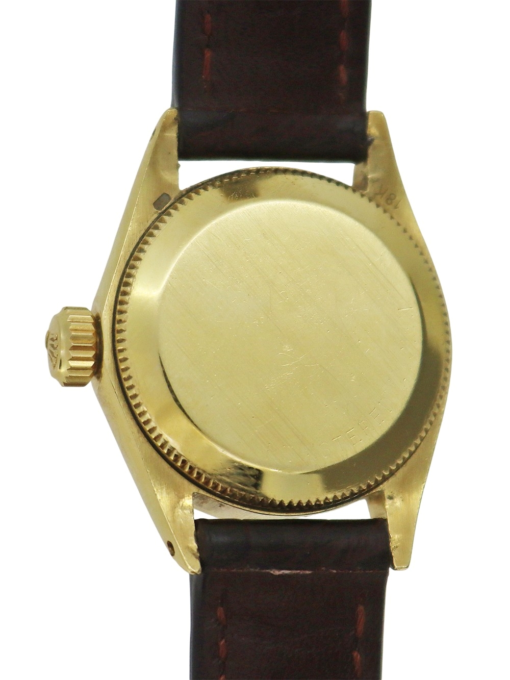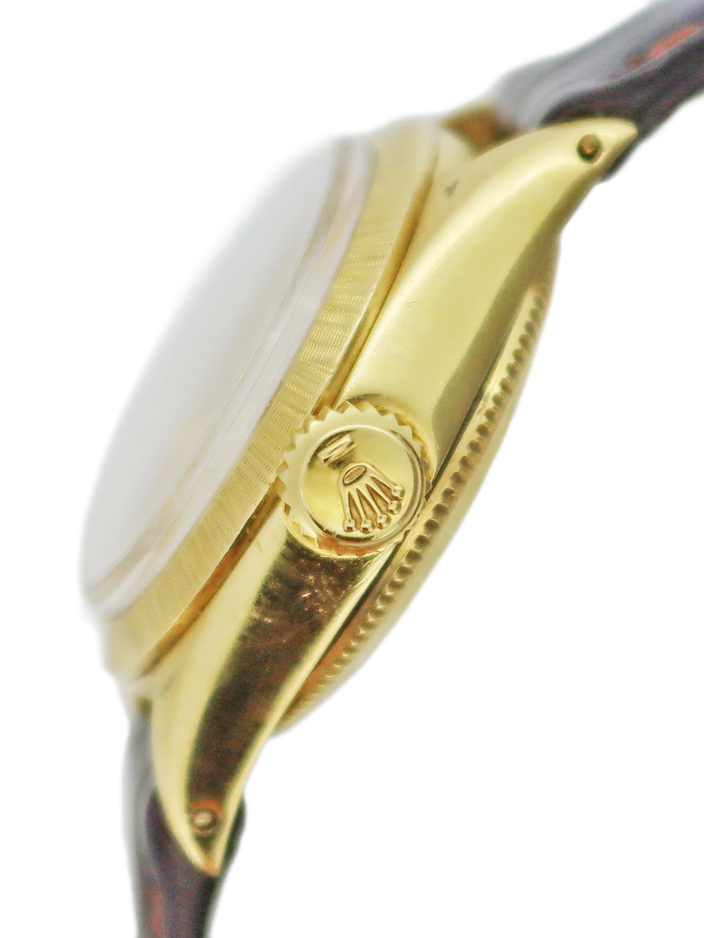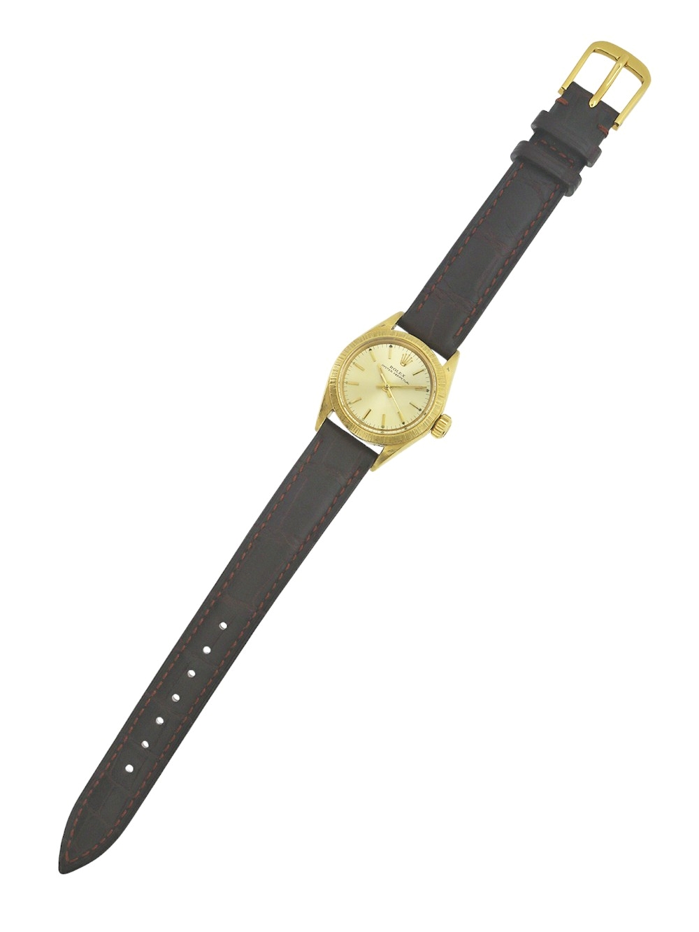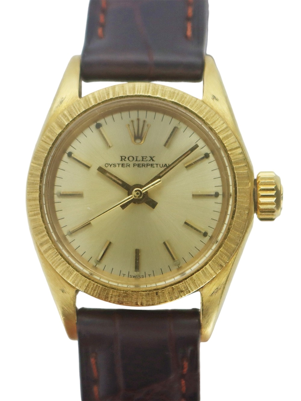 この時計はロレックス社の1960年代後期から文字盤デザインが限りなくシンプルに成って行った時代の婦人用自動巻きです。 但しこのオイスターケースはベゼルが通常の仕上げと違ってバーク仕上げと呼ばれます元々手仕事で模様を彫っていたベゼルデザインの一つでとても珍しい部類のベゼル仕様となっております。文字盤のデザインの変遷で言いますと1900年代の初頭のアールデコデザインの時代から機能重視でシンプルなデザインへと全てのものが移行していった時代の時計です。 文字盤はシャンパンゴールド地にアップライドバトン型インデックス仕様となっております。ケースは若干の使用傷はありますが、大きなダメージの無いとても良いコンディションとなっております。全て当時のままのオリジナルコンディションとなっております。