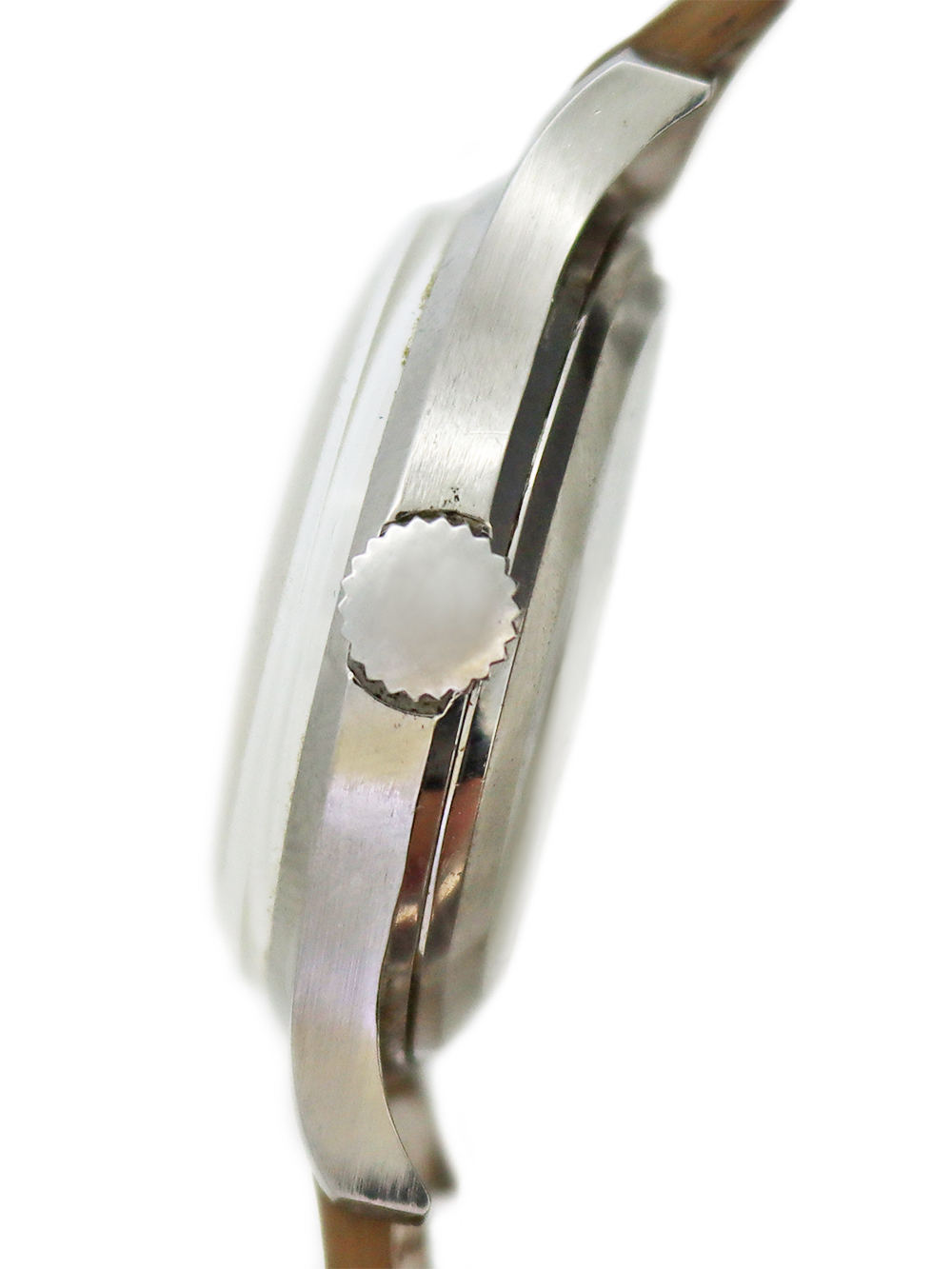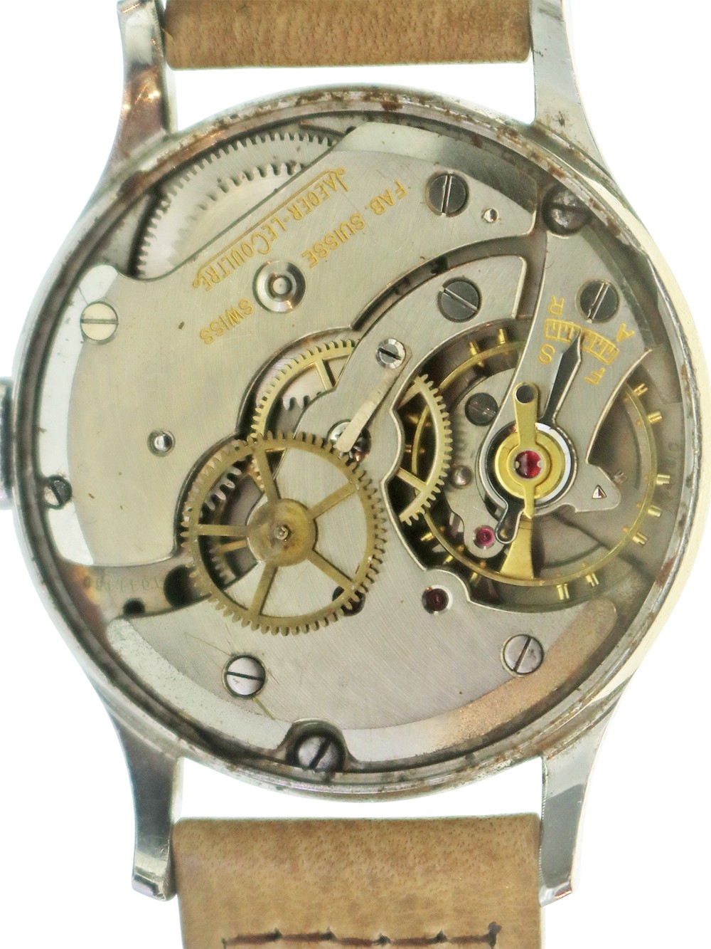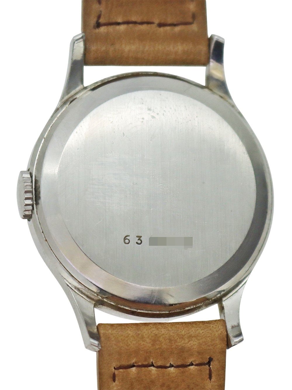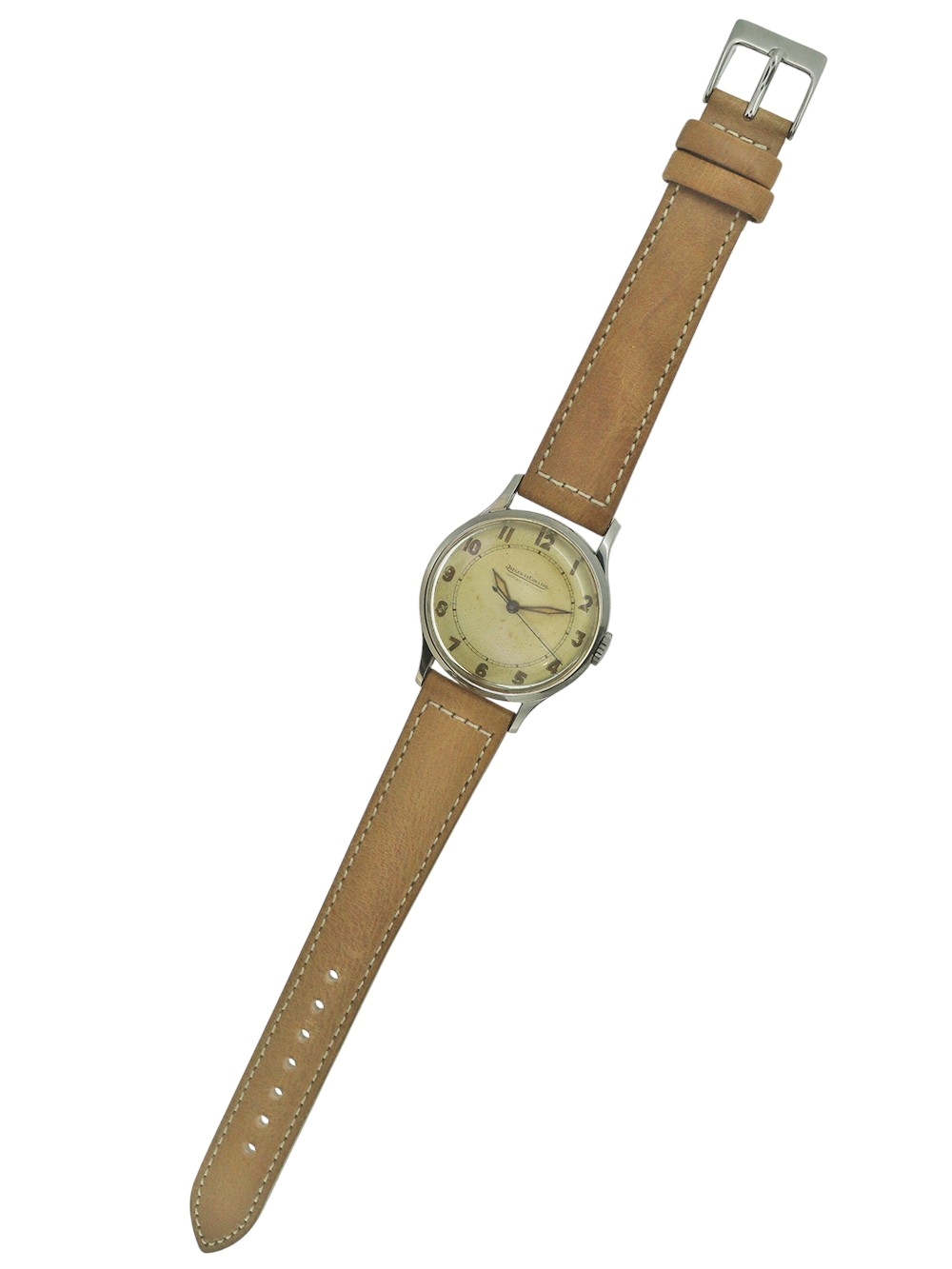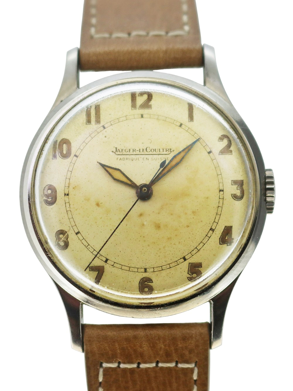この時計はジャガールクルト社のなかでもラウンドケースの定番デザインの視認性を最重視したダイヤル仕様モデルとなっております。 同モデルのラウンドケースではセンターセコンド針モデル、スモールセコンド針モデルがありますが、センターセコンド針仕様モデルとなります。 搭載キャリバーは1945年より製造で後にジオフィジッククロノメーターキャリバーのベースキャリバーとなった478となります。文字盤はこれも定番の夜光アラビア数字インデックスにブルースチールのロジンジ(菱形)型針とセンターセコンド針の組み合わせとなっております。 ケースに使用傷、ダイヤルにも経年変化の変色部分は有りますが年代の味わいのある全て当時のオリジナルコンディションとなっております。