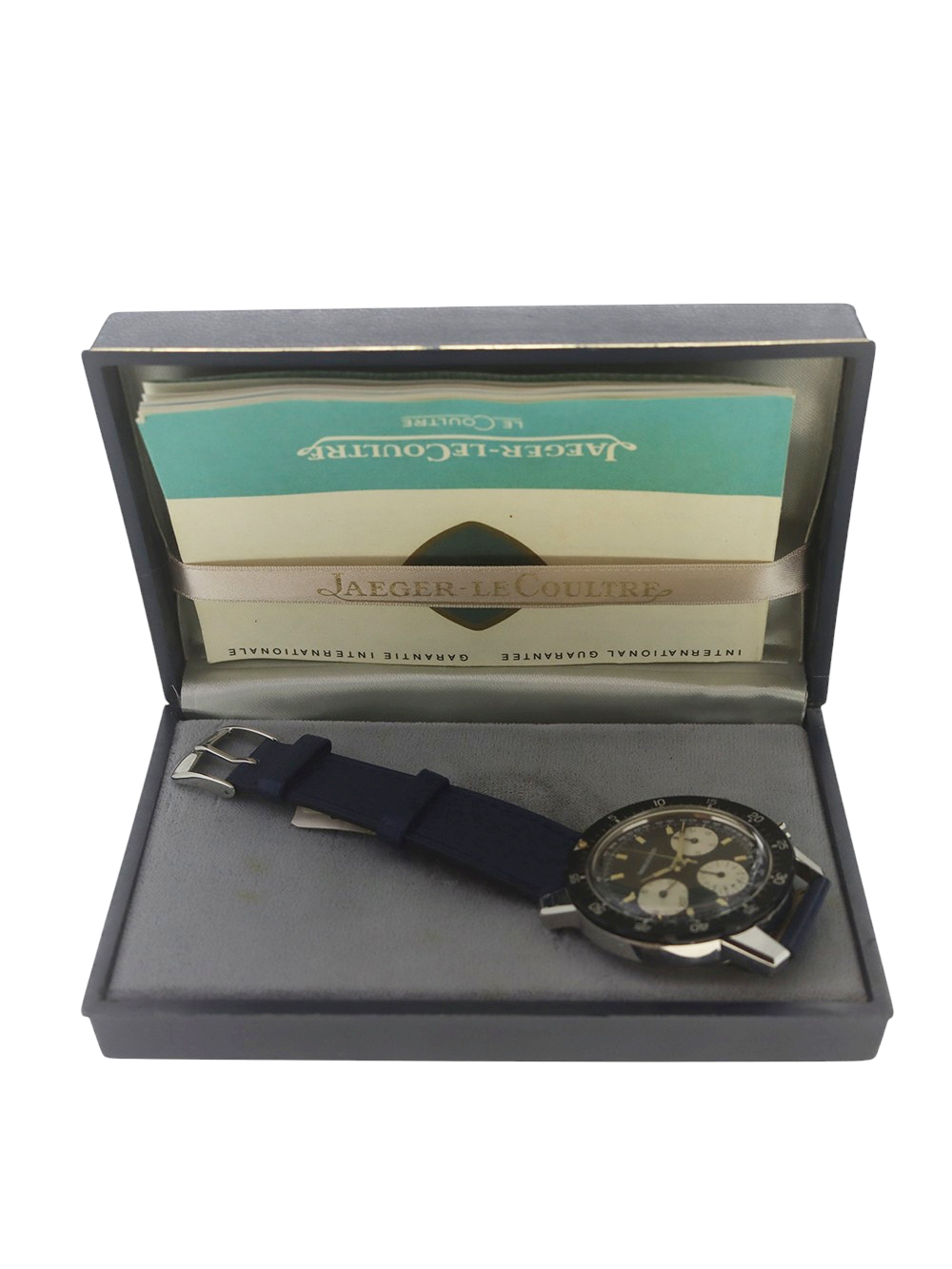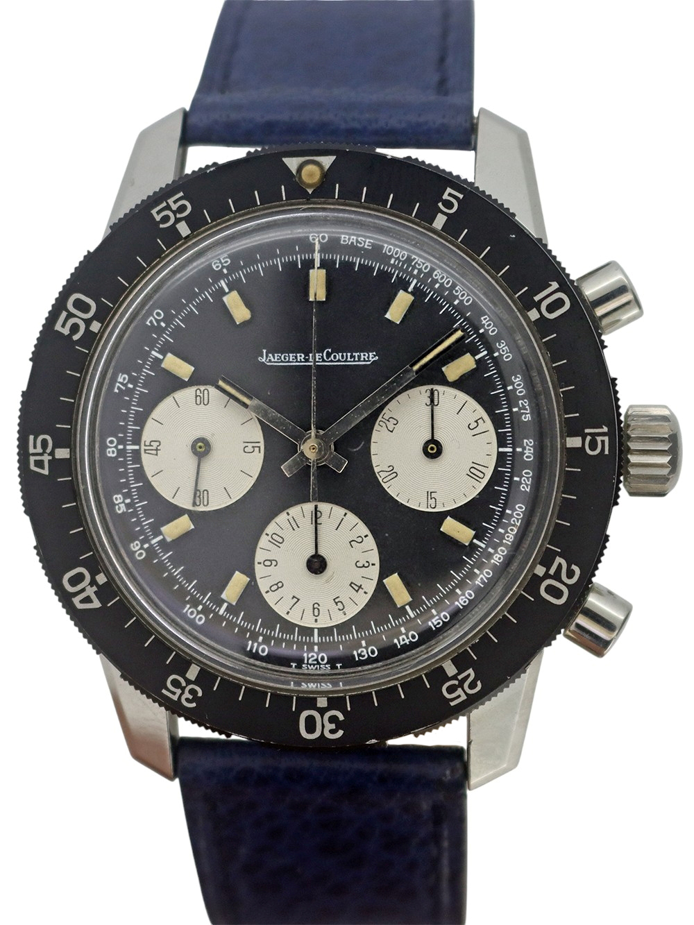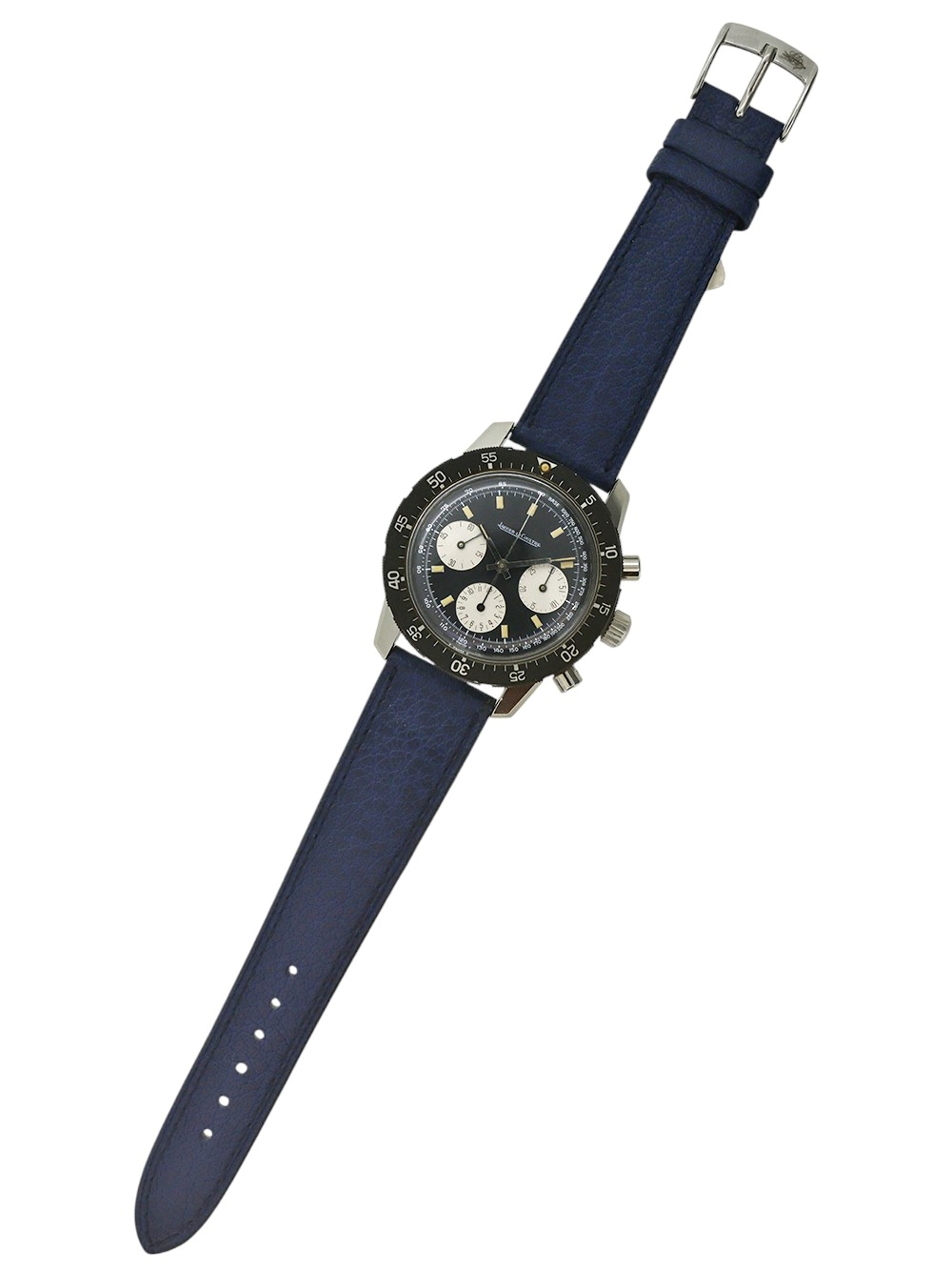 さてこの時計に関しましてですが、ジャガールクルト社は決して多くは有りませんが1950年代以降もクロノグラフの製造をヴァルジュー社のキャリバー22、23をベースにミニッツレコーダー(分積算計)クロノグラフを、72をベースにアワー(12時間積算計)及びミニッツレコーダー(分積算計)のクロノグラフの製造をしておりました。この時計はダイバーズクロノグラフと呼ばれるモデルでワールドタイム表記ベゼル仕様とこの通常のミニッツマーカー付き回転ベゼル仕様のモデルの2種が作られました。キャリバーはヴァルジュー社72をベースにした726搭載で文字盤外周にタキメーターサークル付きの夜光インデックス仕様のブラックマットダイヤルで太めのフラット夜光ポイント針の組み合わせとなっております。 ケース、文字盤、機械全てとても良い状態で 全体に当時のままのとても良いコンディションでオリジナルボックスと保証書付きとなっております。
