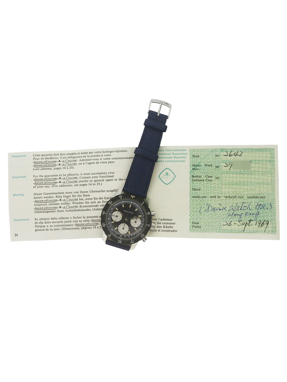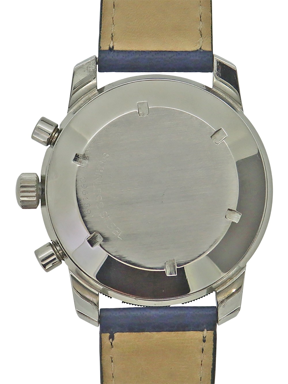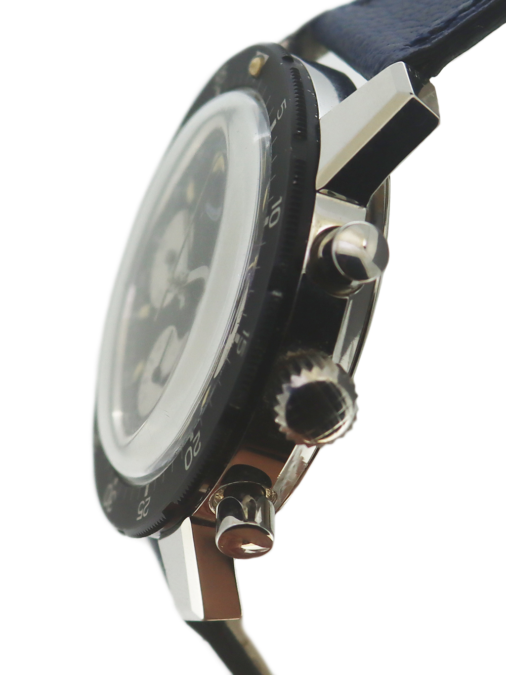 さてこの時計に関しましてですが、ジャガールクルト社は決して多くは有りませんが1950年代以降もクロノグラフの製造をヴァルジュー社のキャリバー22、23をベースにミニッツレコーダー(分積算計)クロノグラフを、72をベースにアワー(12時間積算計)及びミニッツレコーダー(分積算計)のクロノグラフの製造をしておりました。この時計はダイバーズクロノグラフと呼ばれるモデルでワールドタイム表記ベゼル仕様とこの通常のミニッツマーカー付き回転ベゼル仕様のモデルの2種が作られました。キャリバーはヴァルジュー社72をベースにした726搭載で文字盤外周にタキメーターサークル付きの夜光インデックス仕様のブラックマットダイヤルで太めのフラット夜光ポイント針の組み合わせとなっております。 ケース、文字盤、機械全てとても良い状態で 全体に当時のままのとても良いコンディションでオリジナルボックスと保証書付きとなっております。