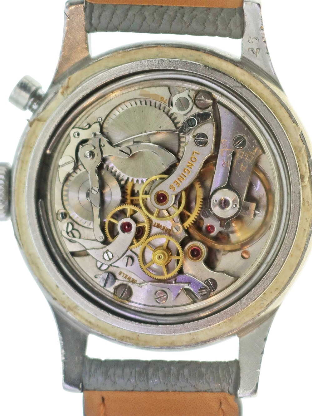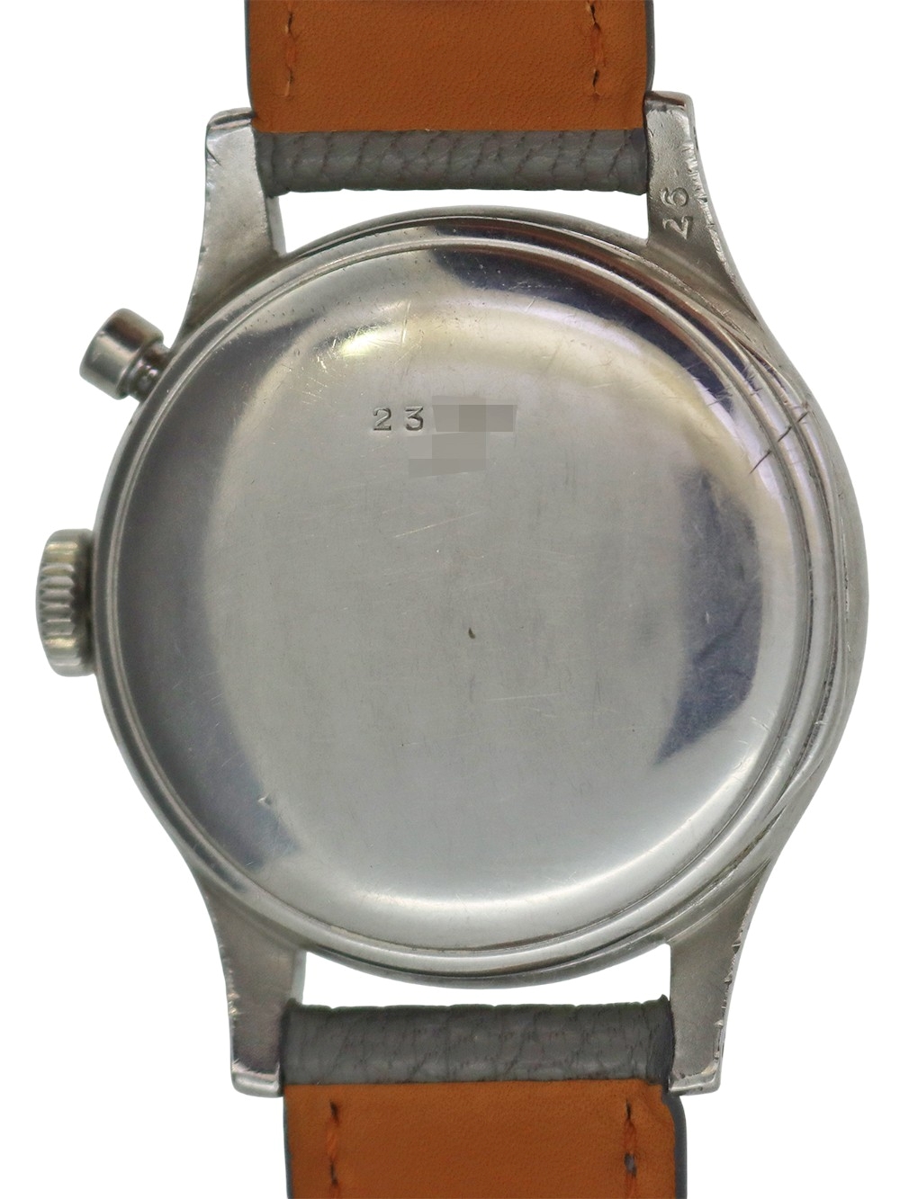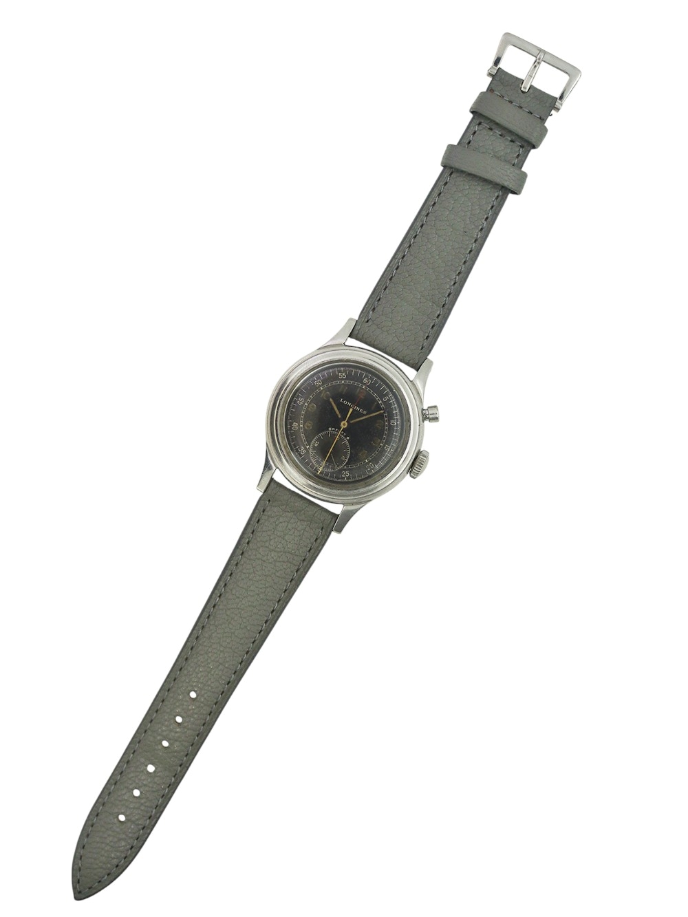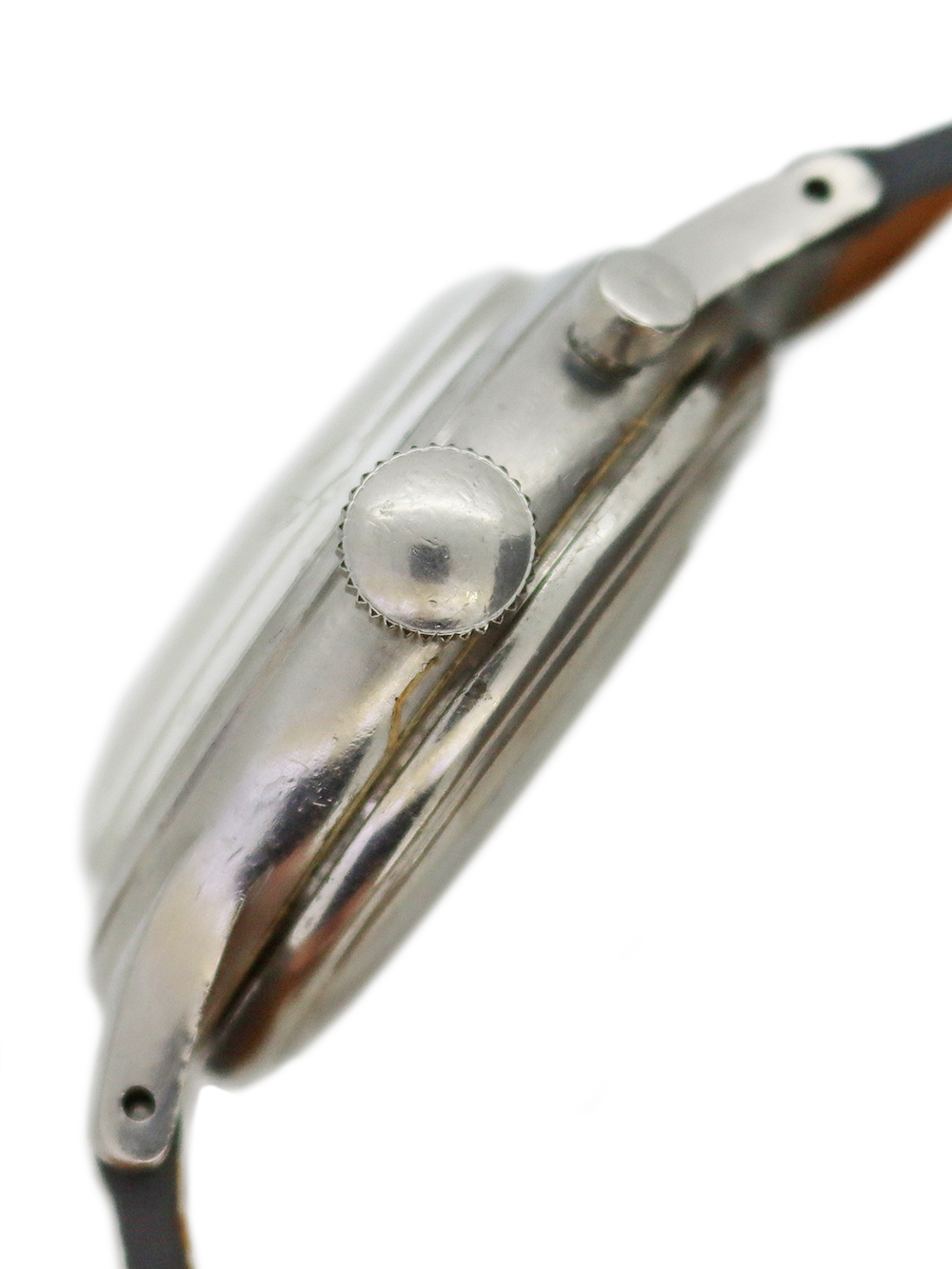 この時計は1945年に製造されたストップセコンドフライバッククロノグラフです。 このキャリバーは1929年に開発された12.68Zを改良してクロノグラフ機能を加え1938年に誕生しました。実際のところ当時初期型とはいえ本格的クロノグラフ機能を製造するにはかなりのコストが掛かったようで、このキャリバーはそういった点でいえばアワートータライザー(時間の積算計)は付いておりませんが、スモールセコンド針とは別のセンターセコンド針(白)をプッシャーボタンで0秒にリセットする事が出来、同時に赤いセンターミニッツ針(積算分針)が同じく0セットとなり白い針は経過秒を、赤い針は積算分を表示するような構造となっております。 当時としての簡易なクロノグラフ機能としてあらゆる分野で計測時計として重用されたようです。ケースも使用傷はありますが磨き等痕が見られない状態で文字盤もそれなりの経年変化は見られますが長く使われてきた時間の経過を感じさせる程よい年代のテイスト感のある当時のままのオリジナルコンディションとなっております。