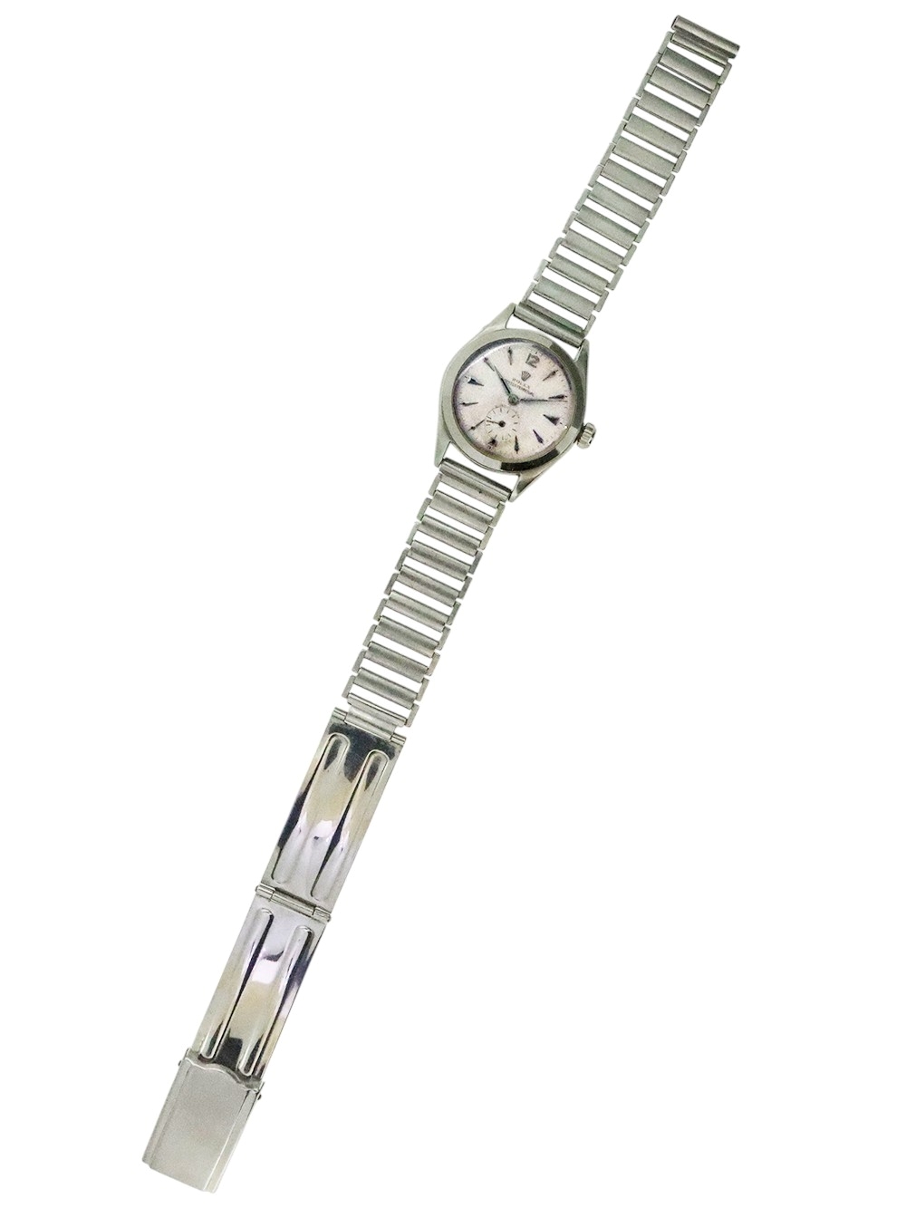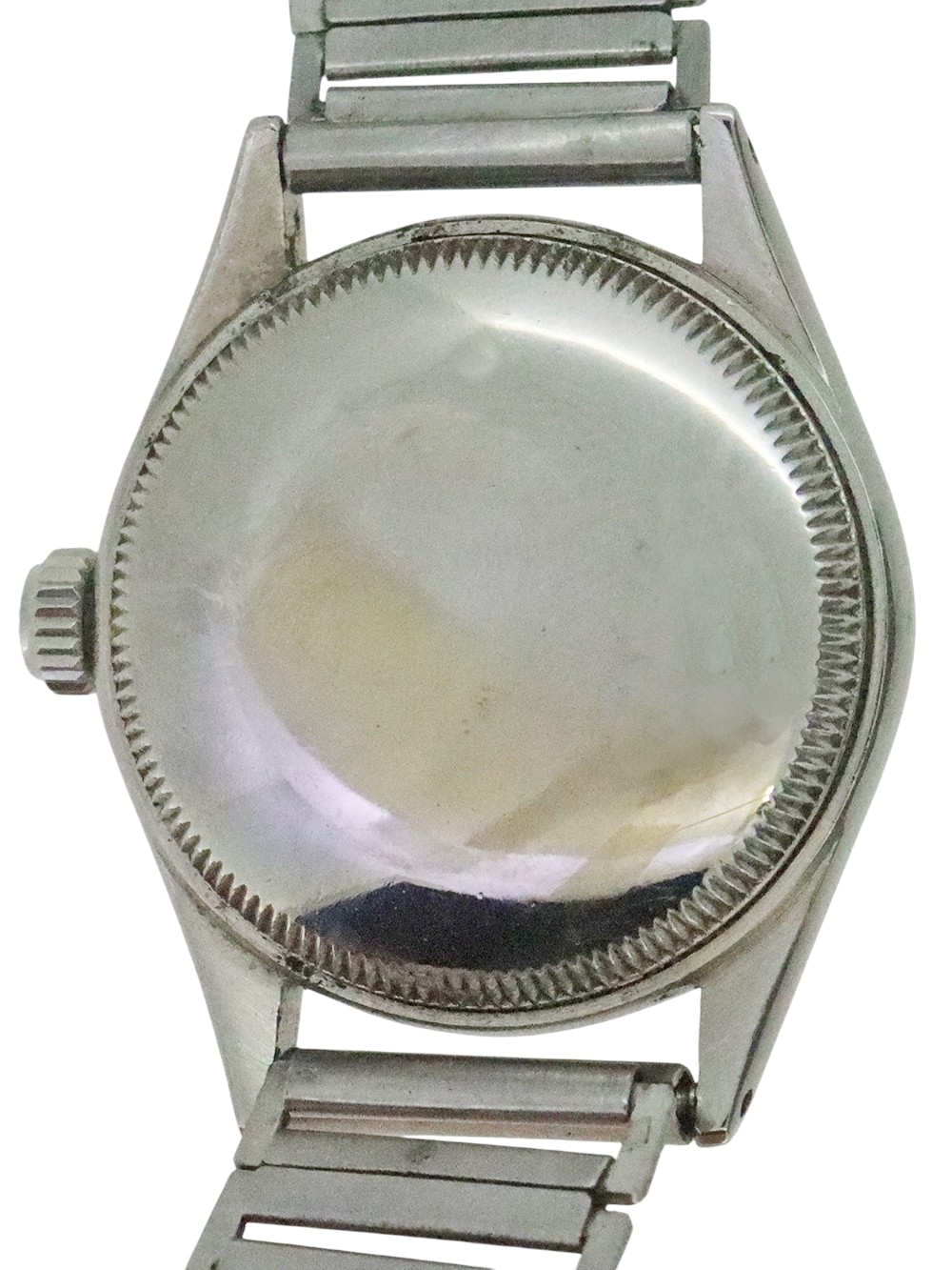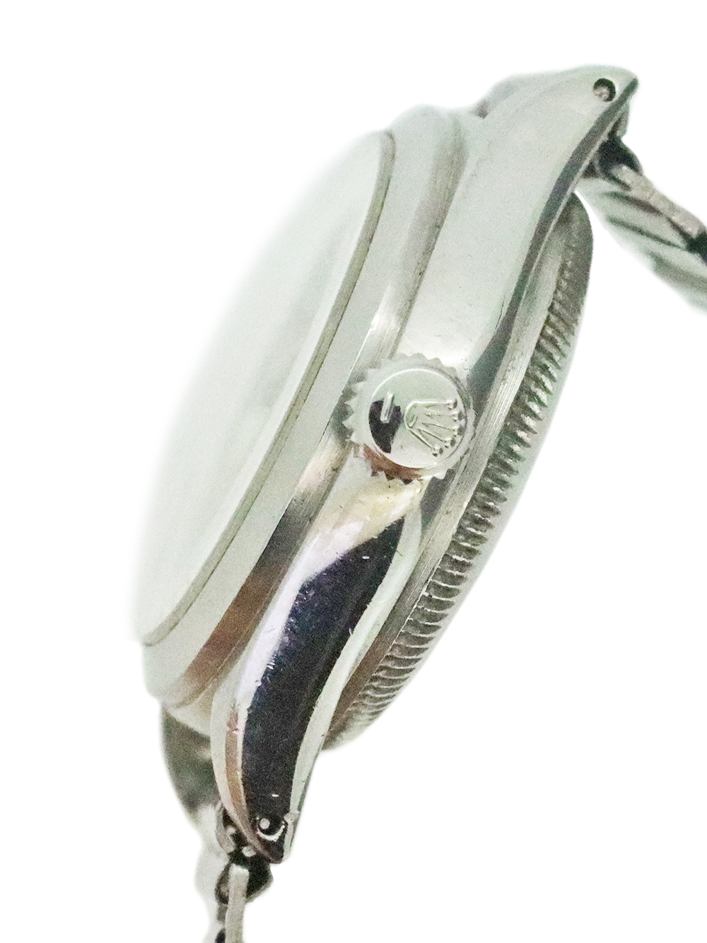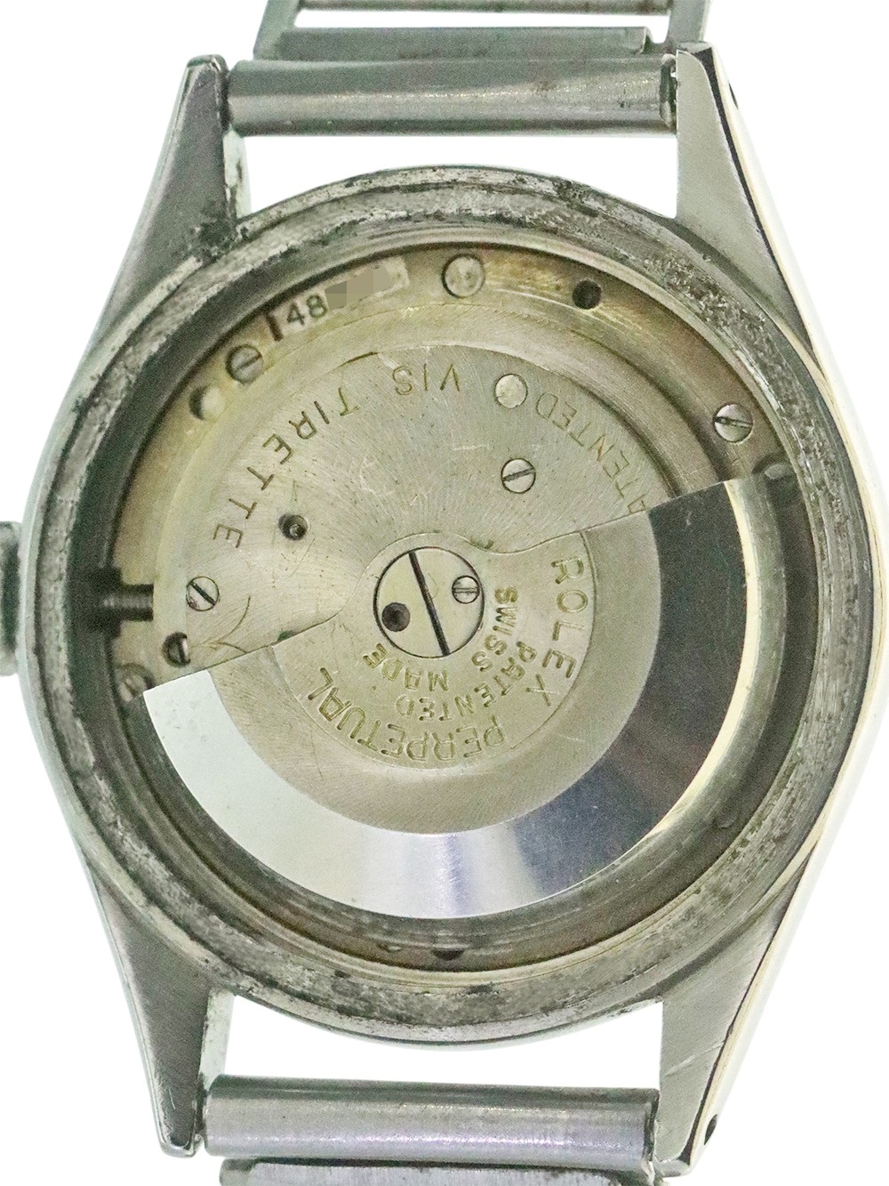 ロレックス社の時計はおおよそ紳士用と婦人用の間にボーイズサイズと呼ばれる中間サイズ(ミッドサイズ)が存在します。 もちろん製造個数はかなり絞られていた為、各モデルのミッドサイズは希少性は高いものとなります。 この時計はロレックス社初の自動巻きモデル、バブルバックモデルの中間サイズモデルとなります。 バブルバック製造時の1940年代はロレックス社の年間製造個数がおおよそ3万個から6万個であったので、この時期の中間サイズは多く作られていない珍しいモデルでした。 キャリバー8.75(8.75リーニュ)ARというキャリバーだった為、コレクター間ではARバブルバックと通称で呼ばれています。 このサイズの代表モデルとしてはカバードモデルのシェルフーテッド、ライフセーバーと呼ばれましたボーイズサイズのエンジンターンドベゼルモデル等ありますが、ボーイズサイズにおいてもケースデザインを変化させ、当時のロレックス社はアグレッシブに沢山の新たなデザインモデルを積極的に作っていました。 このモデルの文字盤はアップライドのトライアングルインデックスと12時いちのみアップライドの数字のインデックスとなっており針はアルファ型針の組み合わせとなっており、ロレックス社の代表的ダイヤルデザインの一つとなります。 ロレックス社のモデル別仕様書に因りますと当初ねじ込み式ではない50年代に開発されたスーパーオイスタークラウン仕様となっておりますがこの時計は5.3mmリューズの次世代のねじ込み式クラウンとなっており、スーパーオイスタークラウンが防水性に問題があった為後にロレックスサービスセンターで希望によってはその当時の新しいリューズ形式に交換をしていた様で恐らくこの時計も交換されたものと思われます。 ブレスレットはバンブータイプの社外品ですが古いブレスレットが付いております。ケースエッジが残ったとても良いコンディションとなっております。