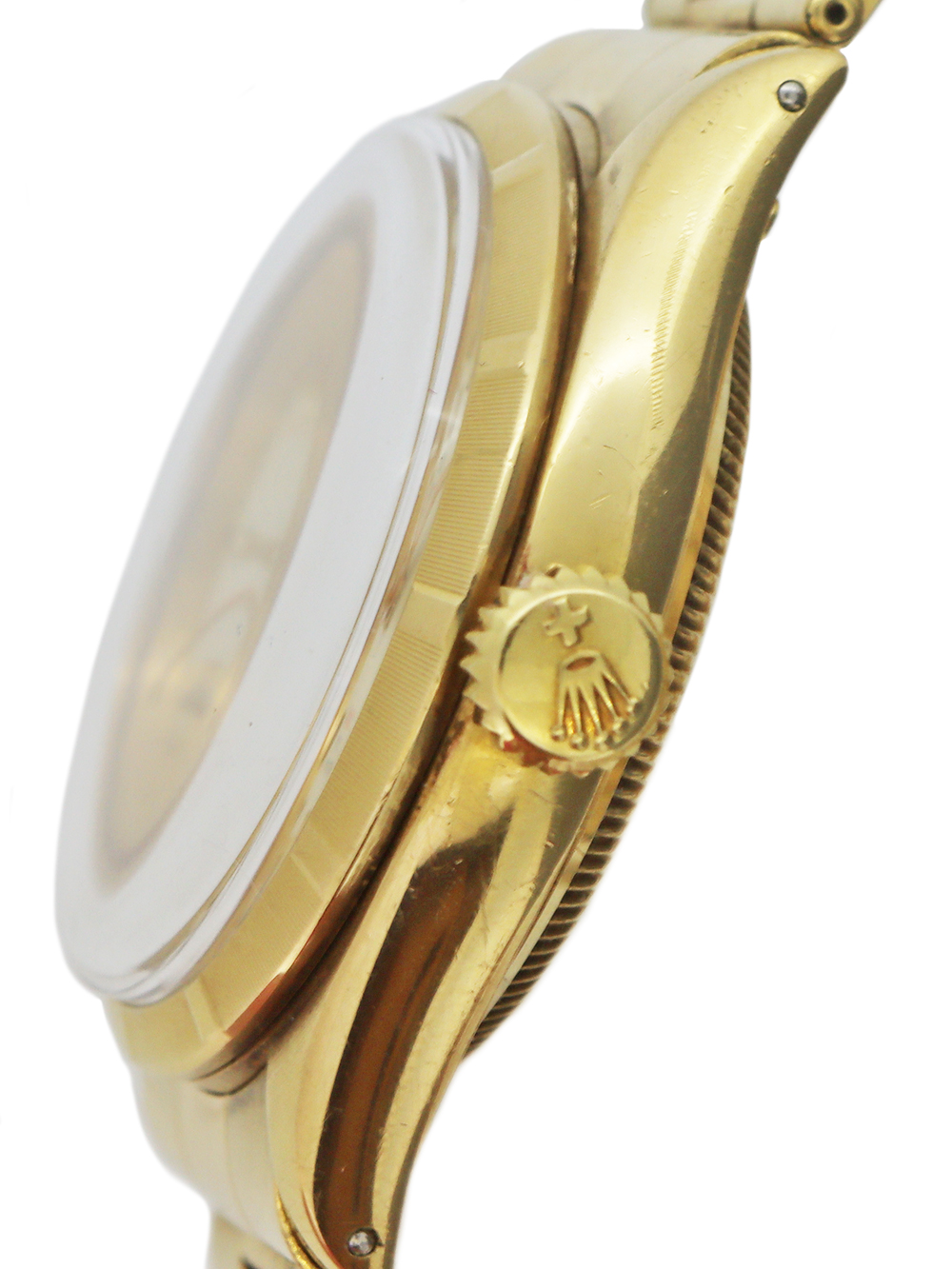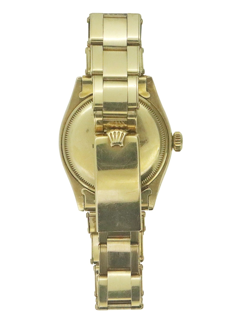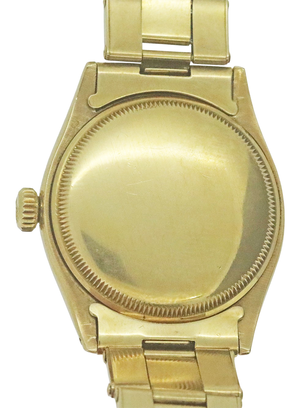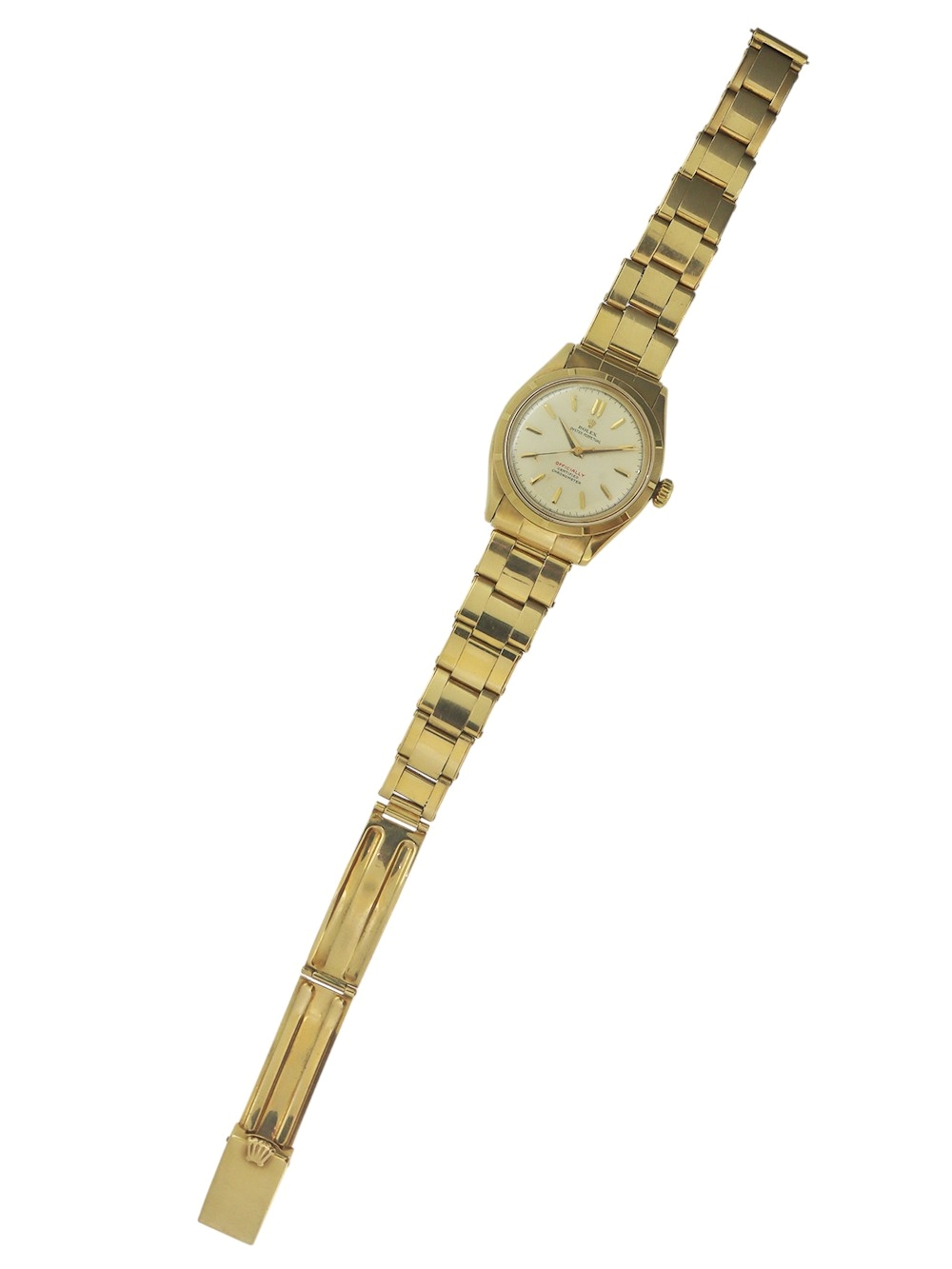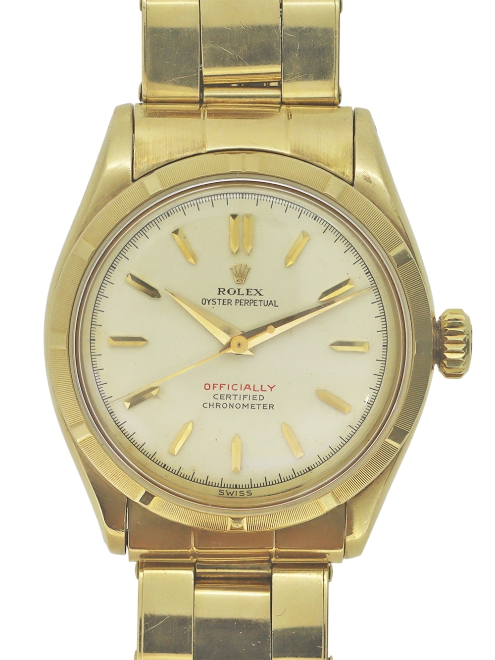 この時計は1953年~1954年製造に1製造された18金ケースのエンジンターンドベゼル仕様のセミバブルバックモデルとなります。 文字盤はロレックス社のものとしては意外と珍しい夜光塗料の使用の無いパテック社のカラトラバデザインと同じゴールドのアップライドのポインテッドバトン型インデックスにゴールドダウフィン型針の組み合わせとなります。 クリームマット仕上げの文字盤で当時ロレックス社の精度の特徴としてクロノメーター検査済みキャリバーであることを強調したいが故か公式を意味しますOFFICIALLYがレッドプリントとなっております。 当時ロレックス社は防水性も一つの特徴であった為防水表記もレッドプリントとなったものも見受けられます。文字盤の状態としましても鮮明にプリントも残っておりやや焼けはあるかと思いますが汚れや変色、シミ等の見られないとても良い状態で且つ美しいヴィンテージテイスト感のある状態となっております。 また、ケースコンディションにおきましてもケースのオリジナルシェイプの厚みが残っておりベゼルエッジにも摩耗の見られないとても良いコンディションとなっております。18金のオイスターリベットエキスパンションブレスレットもフルコマでありブレスレットのバネも均一でとても良い状態です。全体に当時のままのとても良い状態が維持されております。この時計は僅かな使用傷はございますが、大きな傷はなく、使用者が丁寧に扱い、且つ丁寧にメンテナンスを重ねてきたが故のコンディションと窺い知れます。