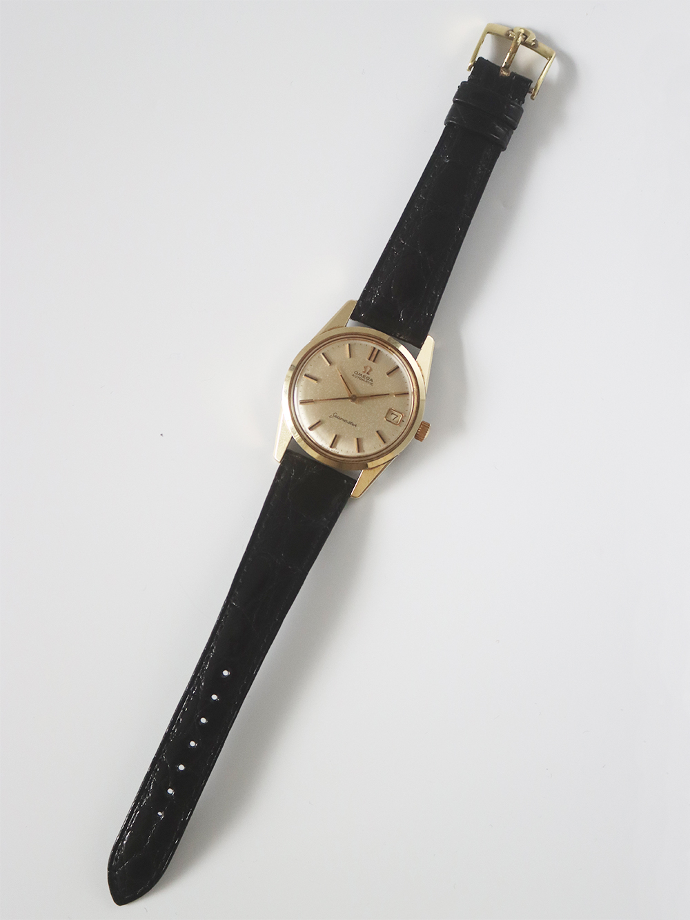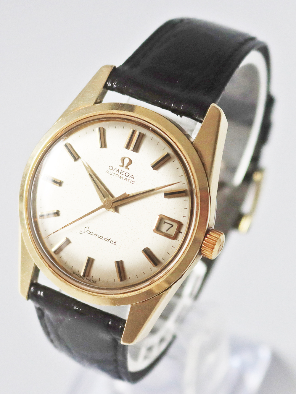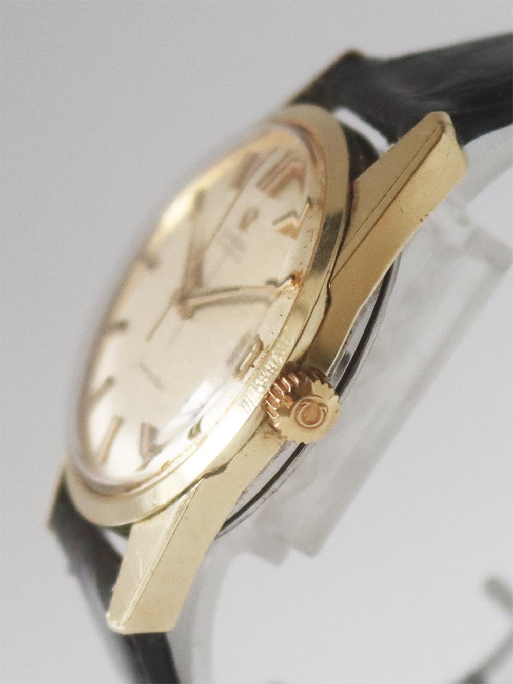 1948年に誕生しましたSeamasterシリーズは30m防水が担保された日常生活防水自動巻きモデルとしてスタートを切りました。その後オメガ社はクロノメーター仕様モデルとそれ以外の自動巻きを並行して製造を続け、1950年代の初頭に初めてのコンステレーションモデルの製造に着手し、1960年初頭にはクロノメーターモデルのコンステレーションが安定的に供給可能となりました。 クロノメーター仕様以外のキャリバーはSeamasterモデルとして製造が続けられました。この時計はノンクロノメーターのSeamasterモデルとなります。 この時計はロールゴールドフィルドステンレスバックケースのSeamasterカレンダーモデルとなります。キャリバーは自動巻き500系の後を受けて作られたバランスホイールにチラネジが外され平テンプ仕様の550系派生キャリバー562搭載のノンクロノメーターモデルとなります。 文字盤はシンプルなゴールドのカット仕上げバトン型ブラックマーカーインデックスにダウフィン型ブラックマーカー針の組み合わせで、文字盤及び針に夜光塗料の無い仕様のダイヤルとなっております。ケースも若干使用傷はありますが、大きなダメージ傷の無いとても良いコンディションとなっておりゴールドフィルドですがオリジナルのバックル付きとなっております。全て当時のままのオリジナルコンディションとなっております。