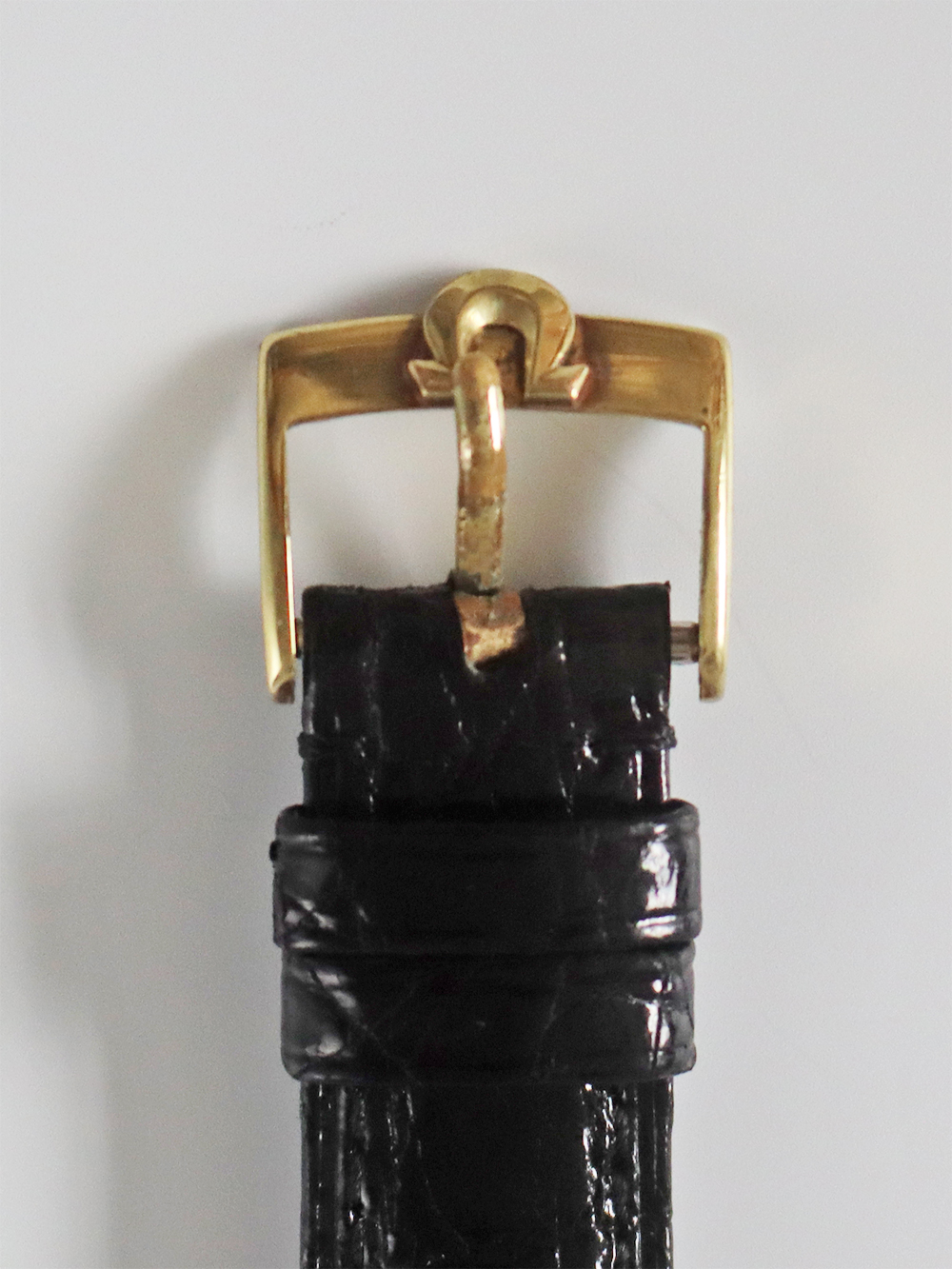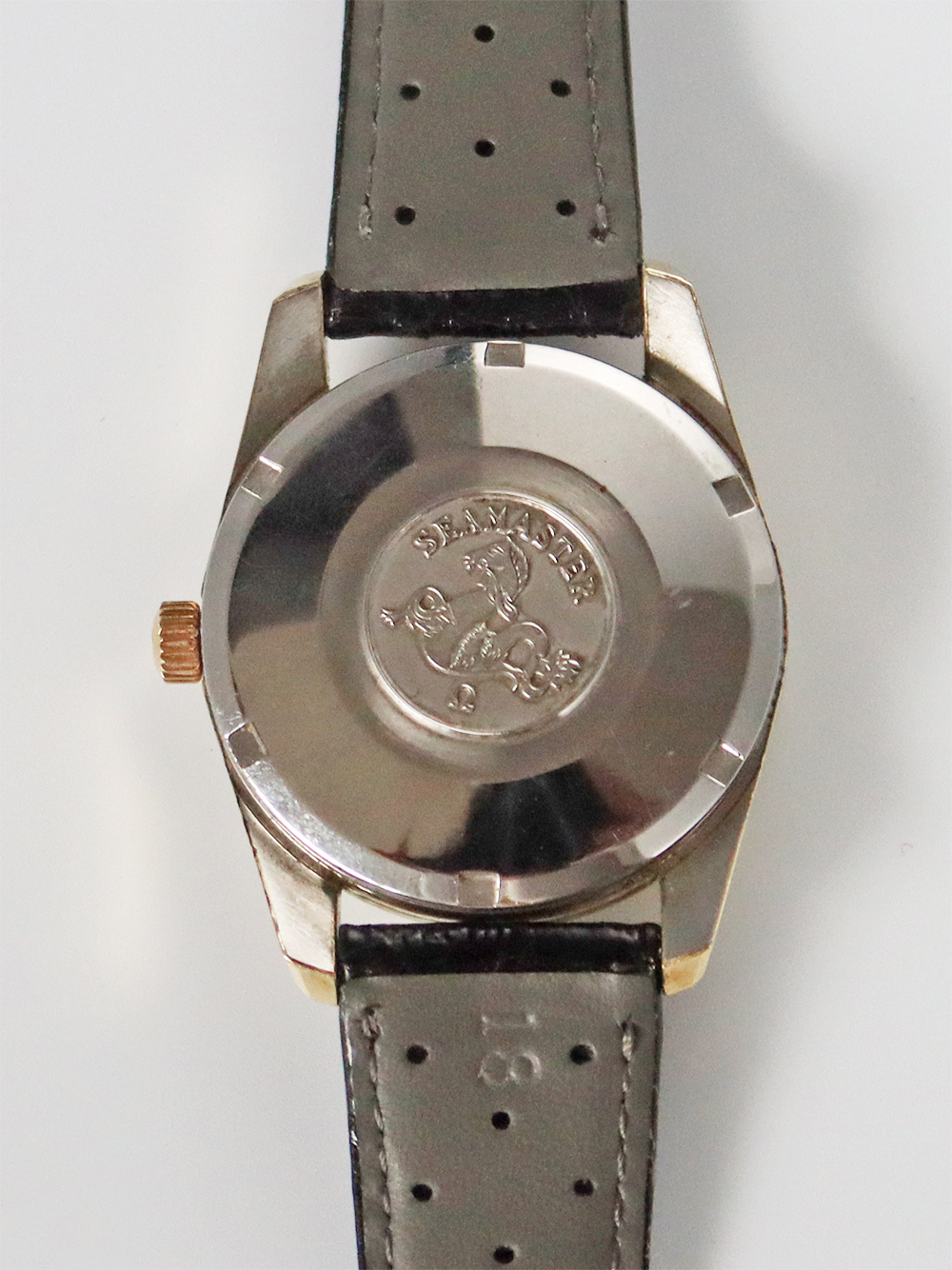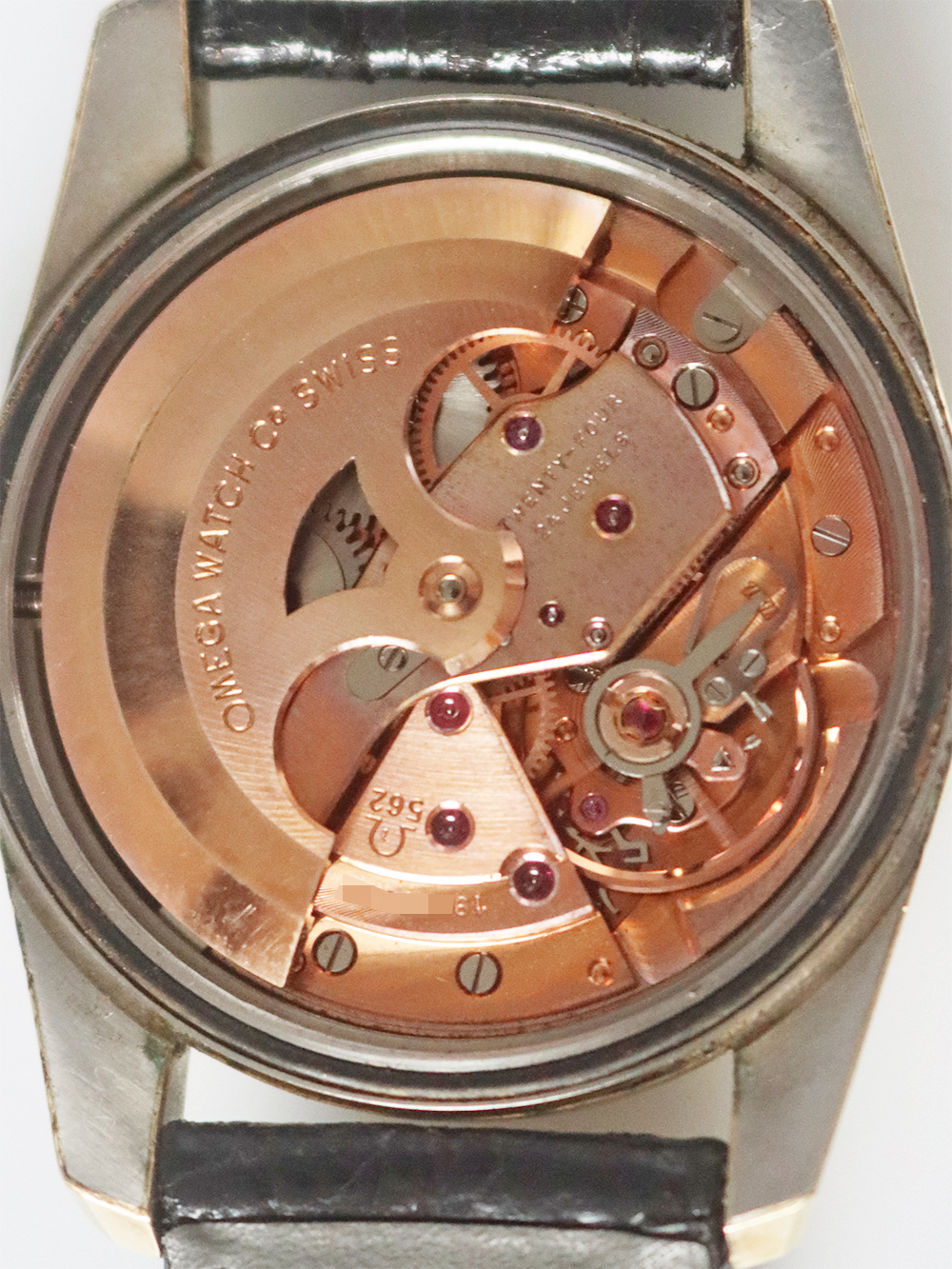 1948年に誕生しましたSeamasterシリーズは30m防水が担保された日常生活防水自動巻きモデルとしてスタートを切りました。その後オメガ社はクロノメーター仕様モデルとそれ以外の自動巻きを並行して製造を続け、1950年代の初頭に初めてのコンステレーションモデルの製造に着手し、1960年初頭にはクロノメーターモデルのコンステレーションが安定的に供給可能となりました。 クロノメーター仕様以外のキャリバーはSeamasterモデルとして製造が続けられました。この時計はノンクロノメーターのSeamasterモデルとなります。 この時計はロールゴールドフィルドステンレスバックケースのSeamasterカレンダーモデルとなります。キャリバーは自動巻き500系の後を受けて作られたバランスホイールにチラネジが外され平テンプ仕様の550系派生キャリバー562搭載のノンクロノメーターモデルとなります。 文字盤はシンプルなゴールドのカット仕上げバトン型ブラックマーカーインデックスにダウフィン型ブラックマーカー針の組み合わせで、文字盤及び針に夜光塗料の無い仕様のダイヤルとなっております。ケースも若干使用傷はありますが、大きなダメージ傷の無いとても良いコンディションとなっておりゴールドフィルドですがオリジナルのバックル付きとなっております。全て当時のままのオリジナルコンディションとなっております。