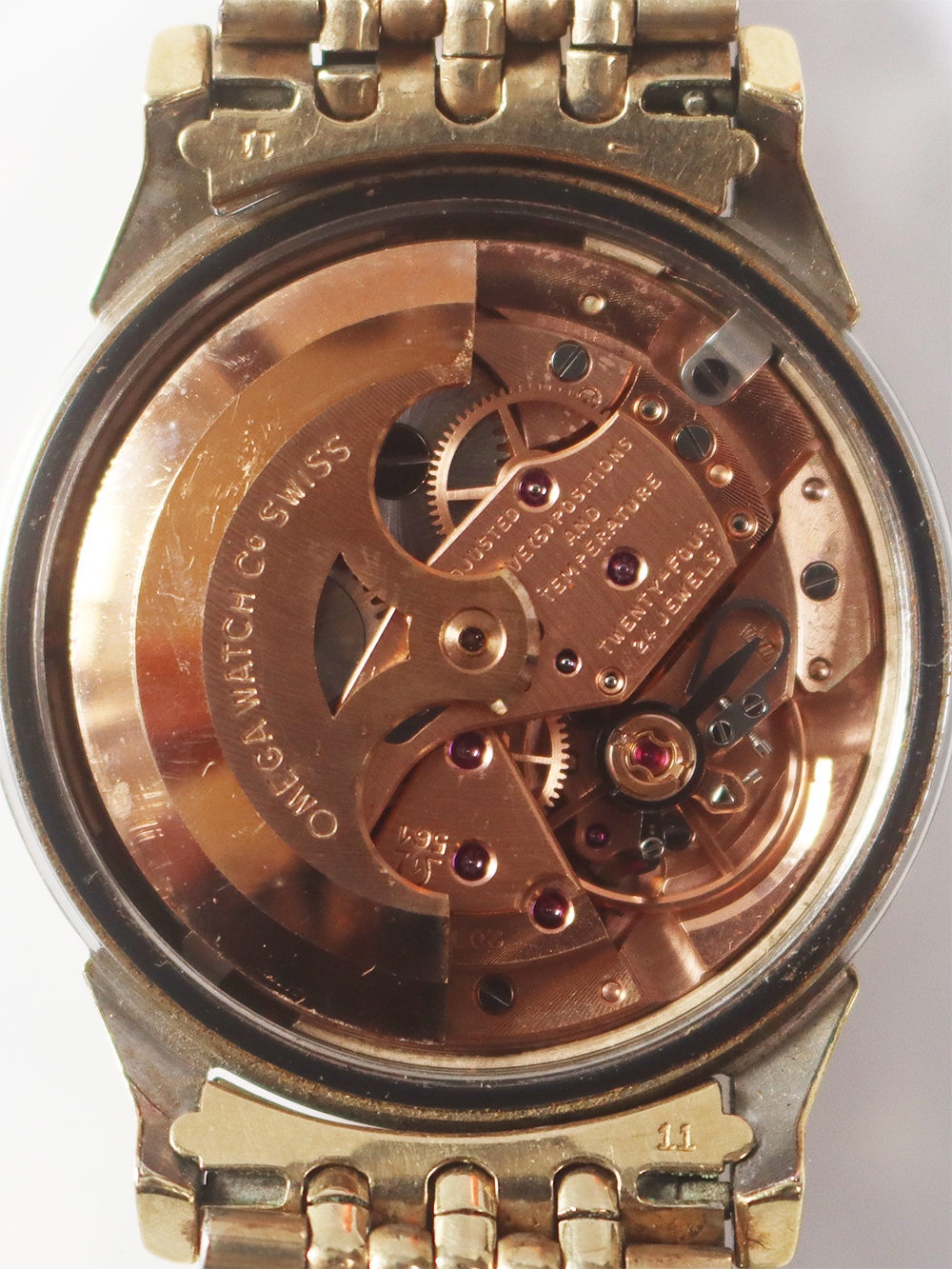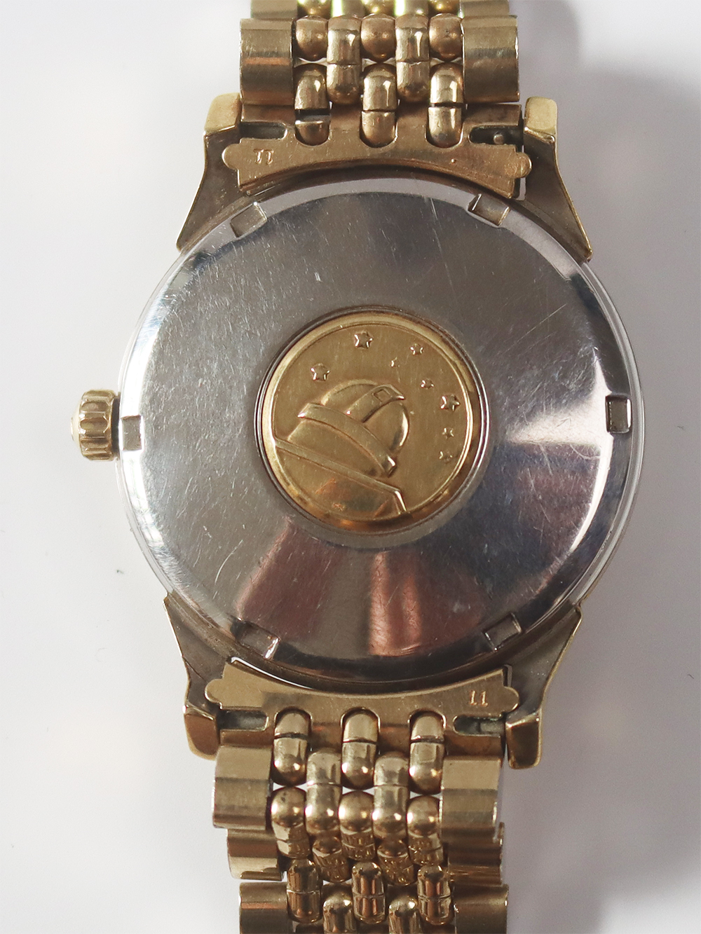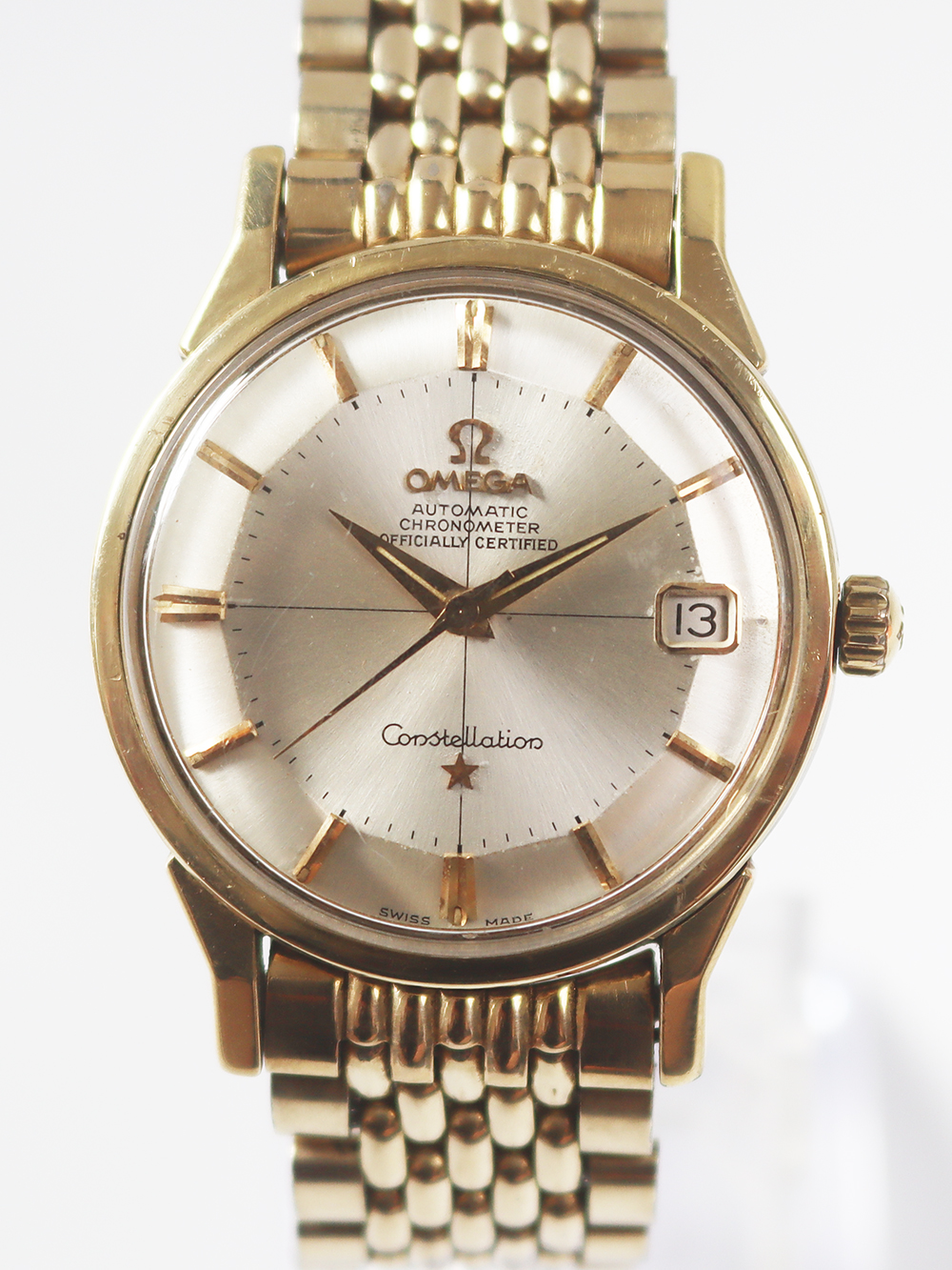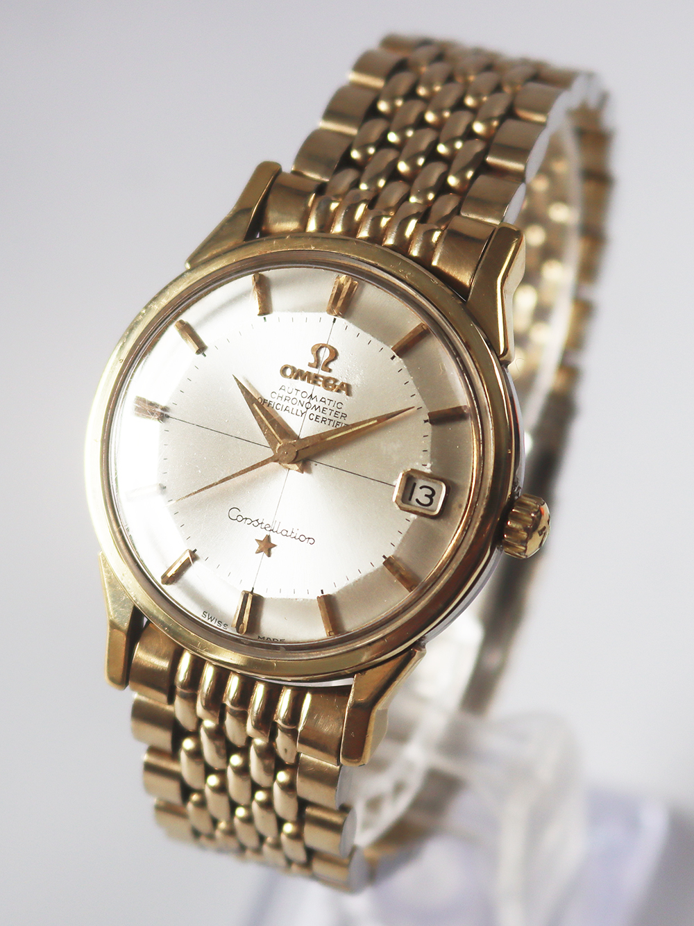 このモデルは1963年製造のゴールドフィルドケースのクロノメーターコンステレーションカレンダーモデルとなります。 文字盤もオメガ社が多用しましたアップライドブラックマーカー付きバトン型インデックス仕様にブラックマーカー付きダウフィン型針の組み合わせの通称“パイパンダイヤル”と呼ばれる文字盤中央が12角形となったコンステレーションモデル独自のダイヤル仕様となっております。 ブレスレットは同じくゴールドフィルド仕様のライスボールリンクブレスレットと呼ばれますオメガ社の代表的ブレスレットとなっております。全て当時のままのとても良いオリジナルコンディションとなっております。