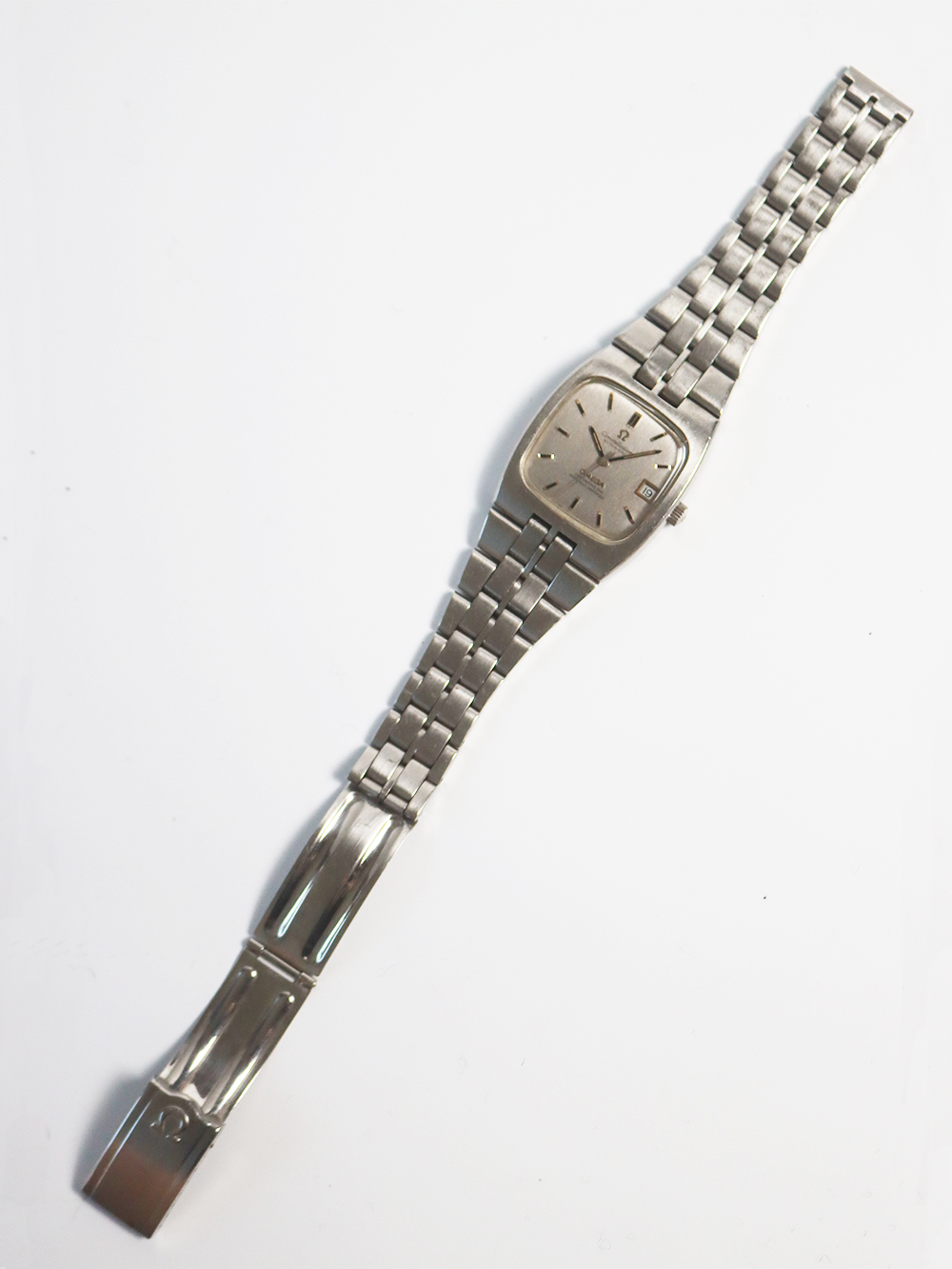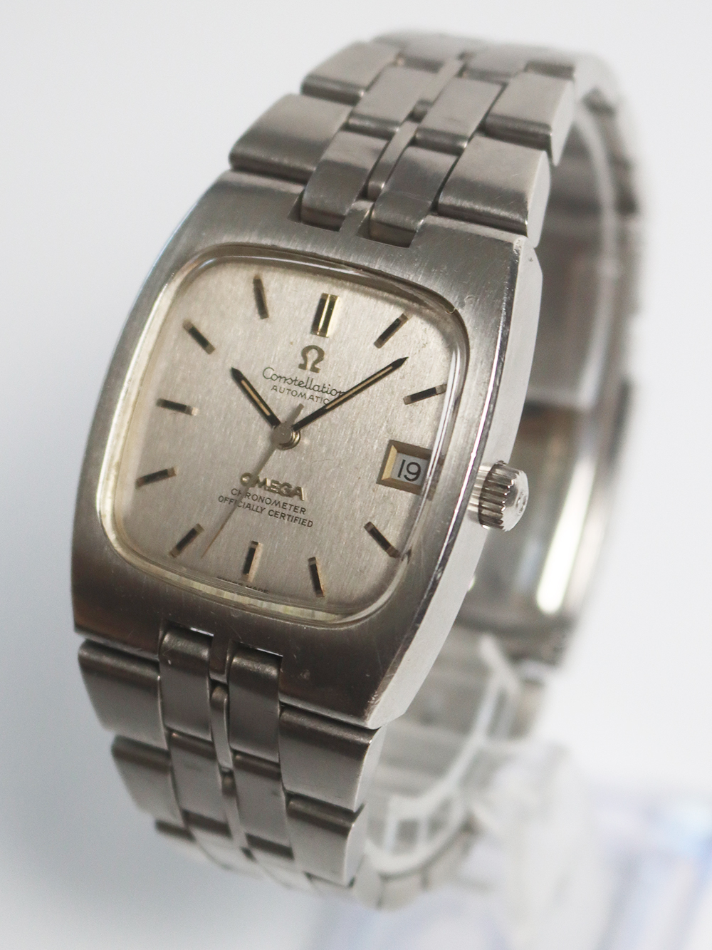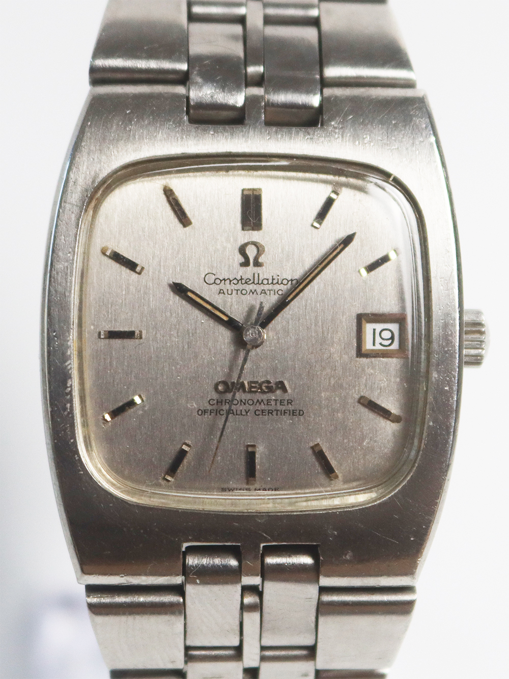 このモデルは1972年製造のクロノメーターコンステレーションカレンダーモデルの大型ケース仕様となります。薄型オートマチックキャリバー1000系モデルとなりますが、この当時機械的にはかなり薄型の高精度クロノメーターキャリバーが誇るべく完成しておりましたが、同時期にクォーツショックと呼ばれる電池時計が今後主流になる大きなうねりがスイス時計業界に襲い掛かっていた為、敢えて大型の少し奇抜なデザイン、配色(主に文字盤)を加え存続を図った時期が窺えるモデル構成となっております。このモデルも時代の写し鏡的モデル構成となっており大型の2ピースクッション型防水ケースに太めのブレスレット一体型となっております。文字盤もオメガ社が多用しましたアップライドブラックマーカー付きバトン型インデックスにブラックマーカー付きポインテッドバトン型針の組み合わせとなっております。 若干経年変化は見られますが当時のままのオリジナルコンディションとなっております。