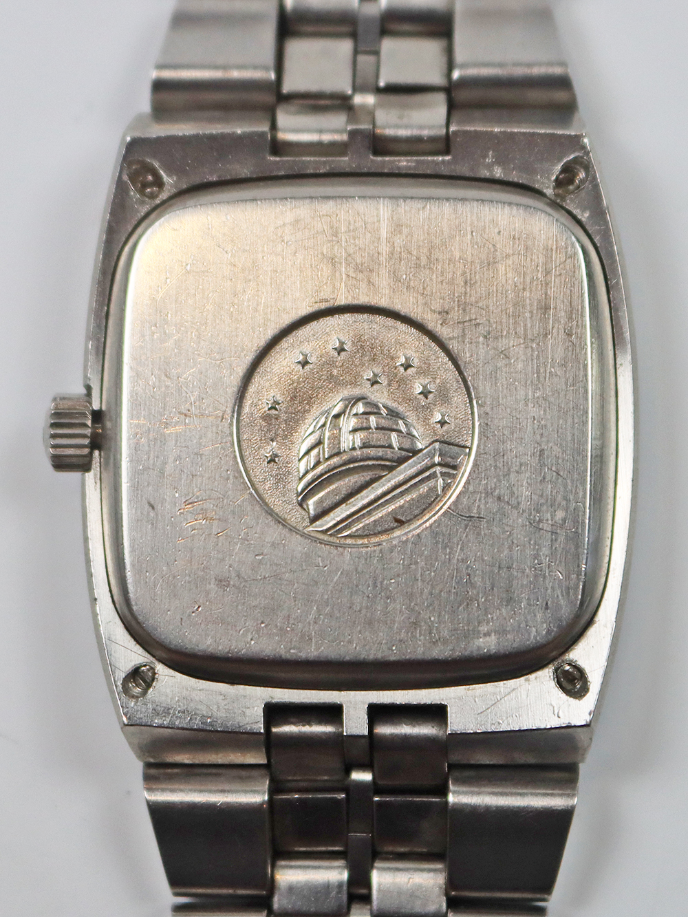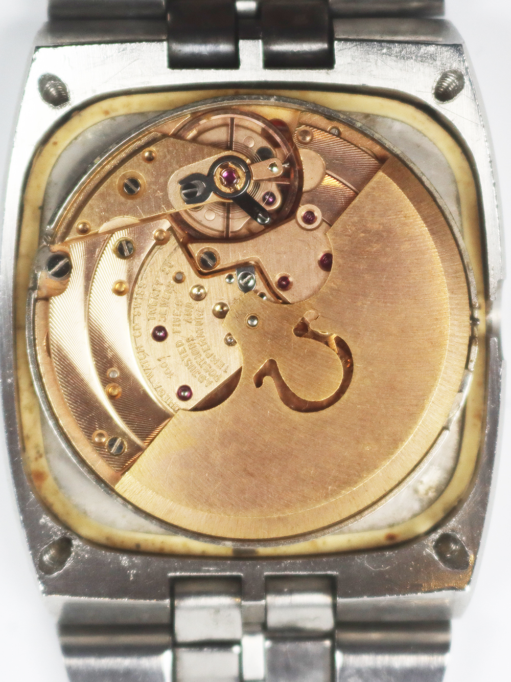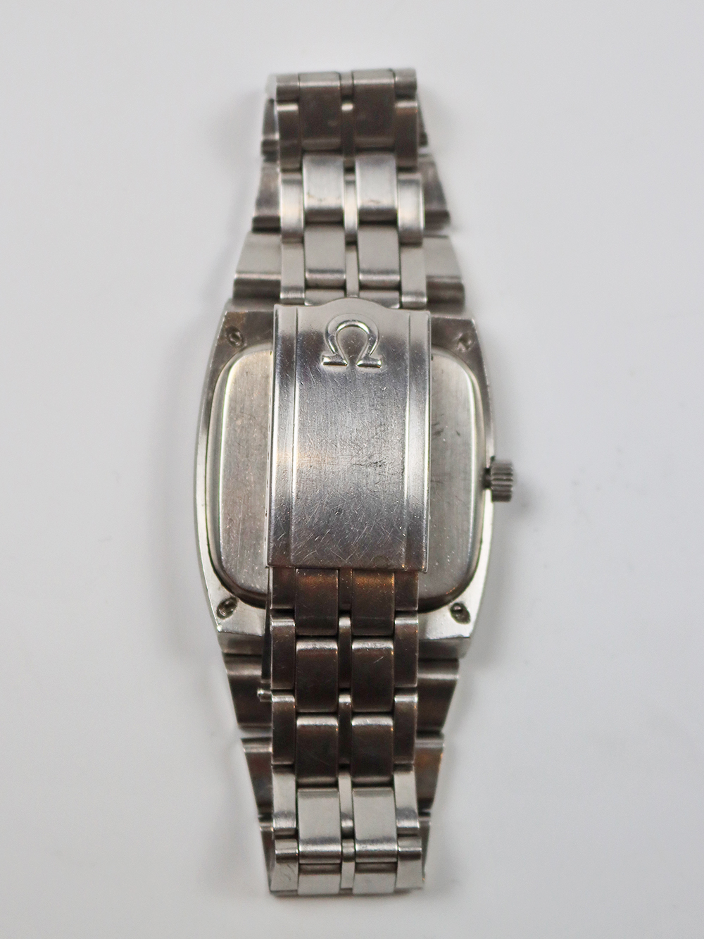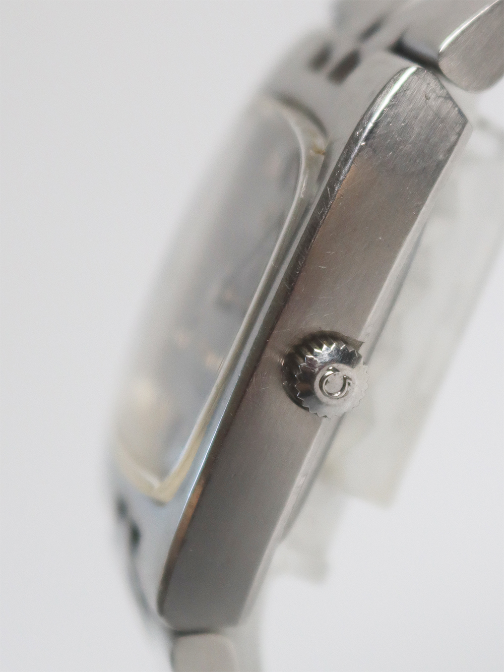 このモデルは1972年製造のクロノメーターコンステレーションカレンダーモデルの大型ケース仕様となります。薄型オートマチックキャリバー1000系モデルとなりますが、この当時機械的にはかなり薄型の高精度クロノメーターキャリバーが誇るべく完成しておりましたが、同時期にクォーツショックと呼ばれる電池時計が今後主流になる大きなうねりがスイス時計業界に襲い掛かっていた為、敢えて大型の少し奇抜なデザイン、配色(主に文字盤)を加え存続を図った時期が窺えるモデル構成となっております。このモデルも時代の写し鏡的モデル構成となっており大型の2ピースクッション型防水ケースに太めのブレスレット一体型となっております。文字盤もオメガ社が多用しましたアップライドブラックマーカー付きバトン型インデックスにブラックマーカー付きポインテッドバトン型針の組み合わせとなっております。 若干経年変化は見られますが当時のままのオリジナルコンディションとなっております。