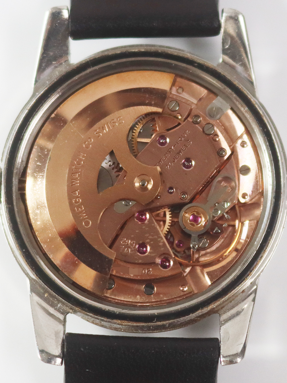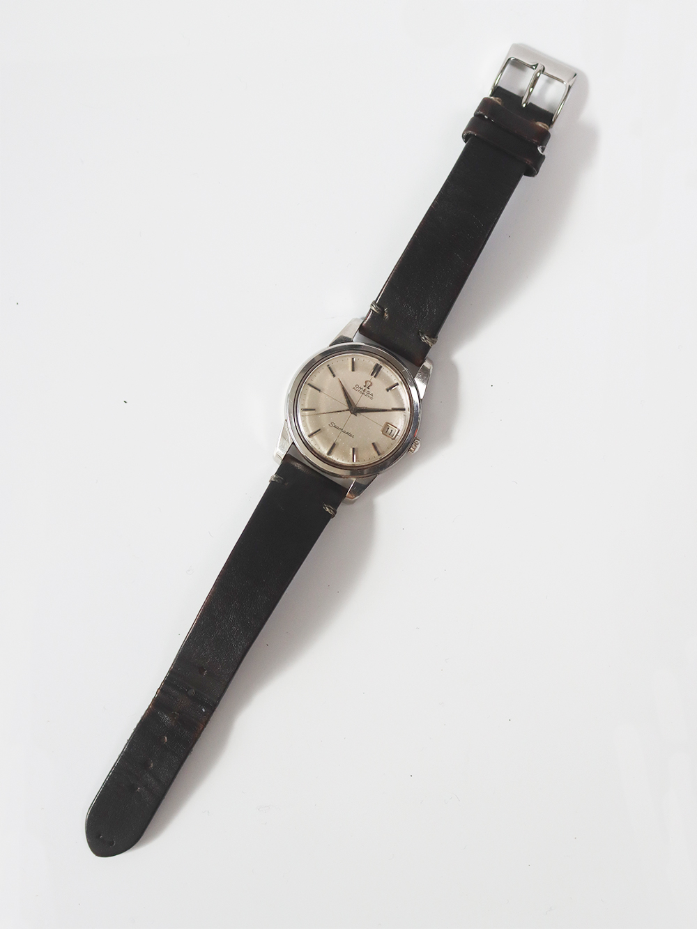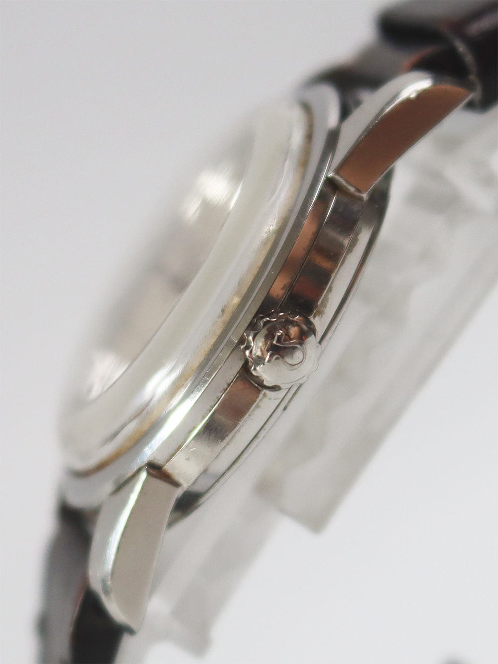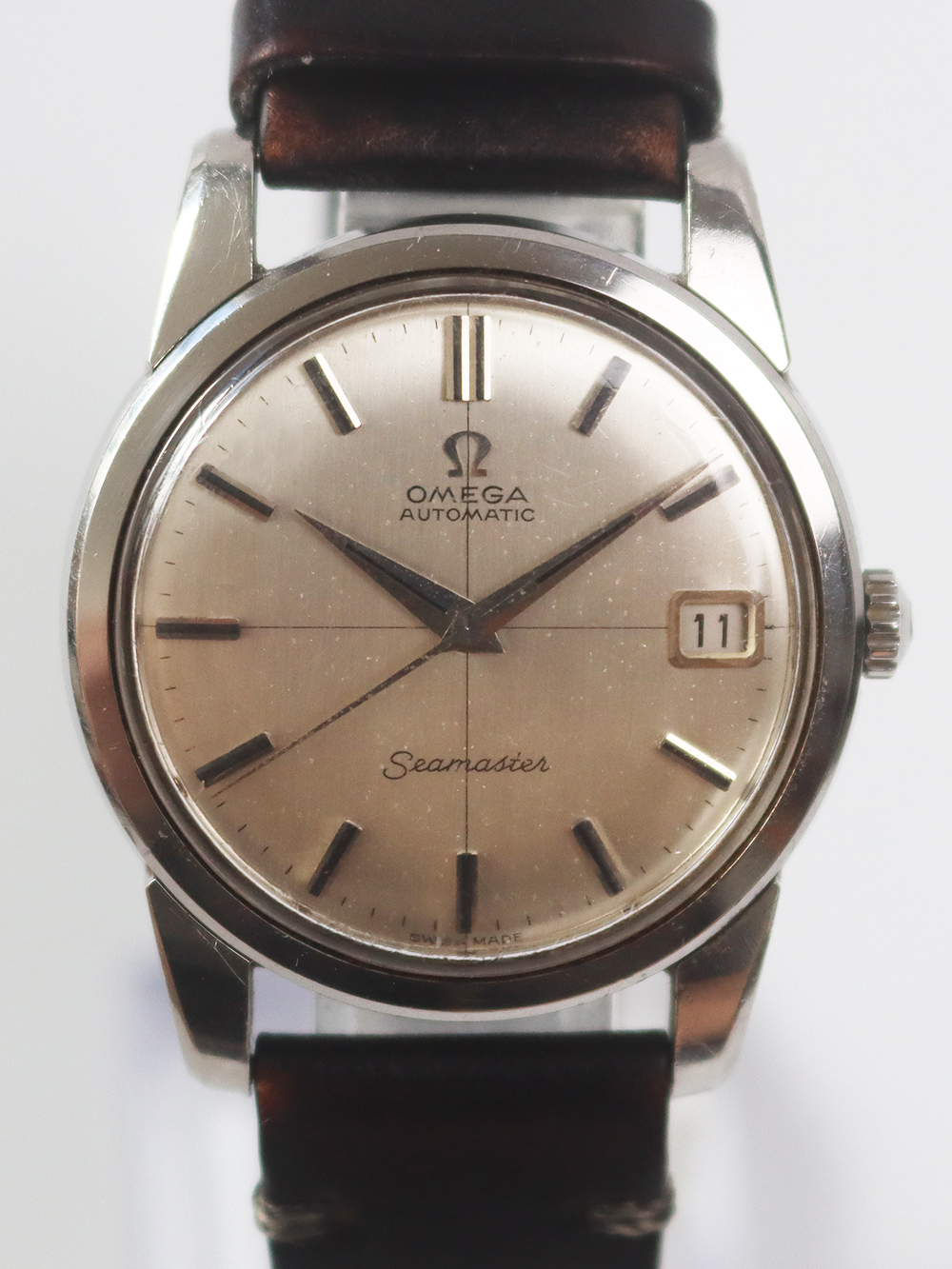 1948年に誕生しましたSeamasterシリーズは30m防水が担保された日常生活防水自動巻きモデルとしてスタートを切りました。その後オメガ社はクロノメーター仕様モデルとそれ以外の自動巻きを並行して製造を続け、1950年代の初頭に初めてのコンステレーションモデルの製造に着手し、1960年初頭にはクロノメーターモデルのコンステレーションが安定的に供給可能となりました。 クロノメーター仕様以外のキャリバーはSeamasterモデルとして製造が続けられました。この時計はノンクロノメーターのSeamasterカレンダーモデルとなります。 キャリバーは自動巻き500系の後を受けて作られたバランスホイールにチラネジが外され平テンプ仕様の550系派生キャリバー562搭載のノンクロノメーターモデルとなります。 このモデルは1963年製でケースはオメガ社伝統のヘビーラグラウンドケースで文字盤はシンプルなカット仕上げバトン型ブラックマーカーインデックスにダウフィン型ブラックマーカー針の組み合わせで、文字盤にクォータークロスのラインが施されたダイヤルとなっております。ケースも若干使用傷はありますが、大きなダメージ傷の無いとても良いコンディションとなっております。
