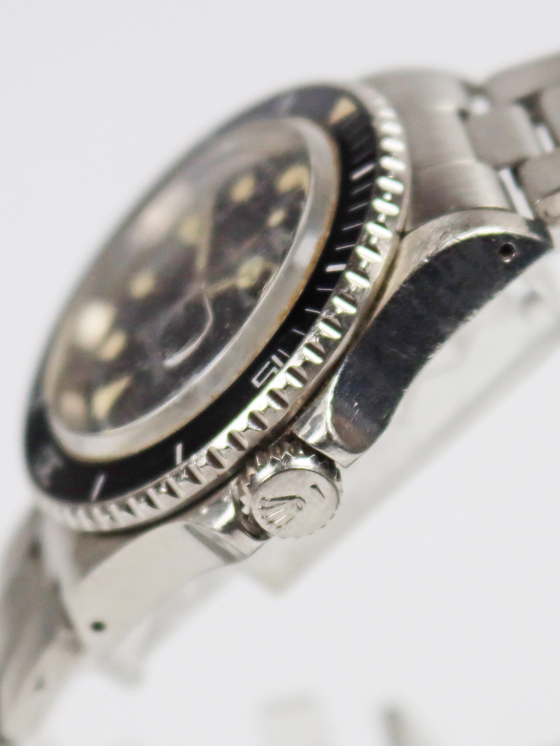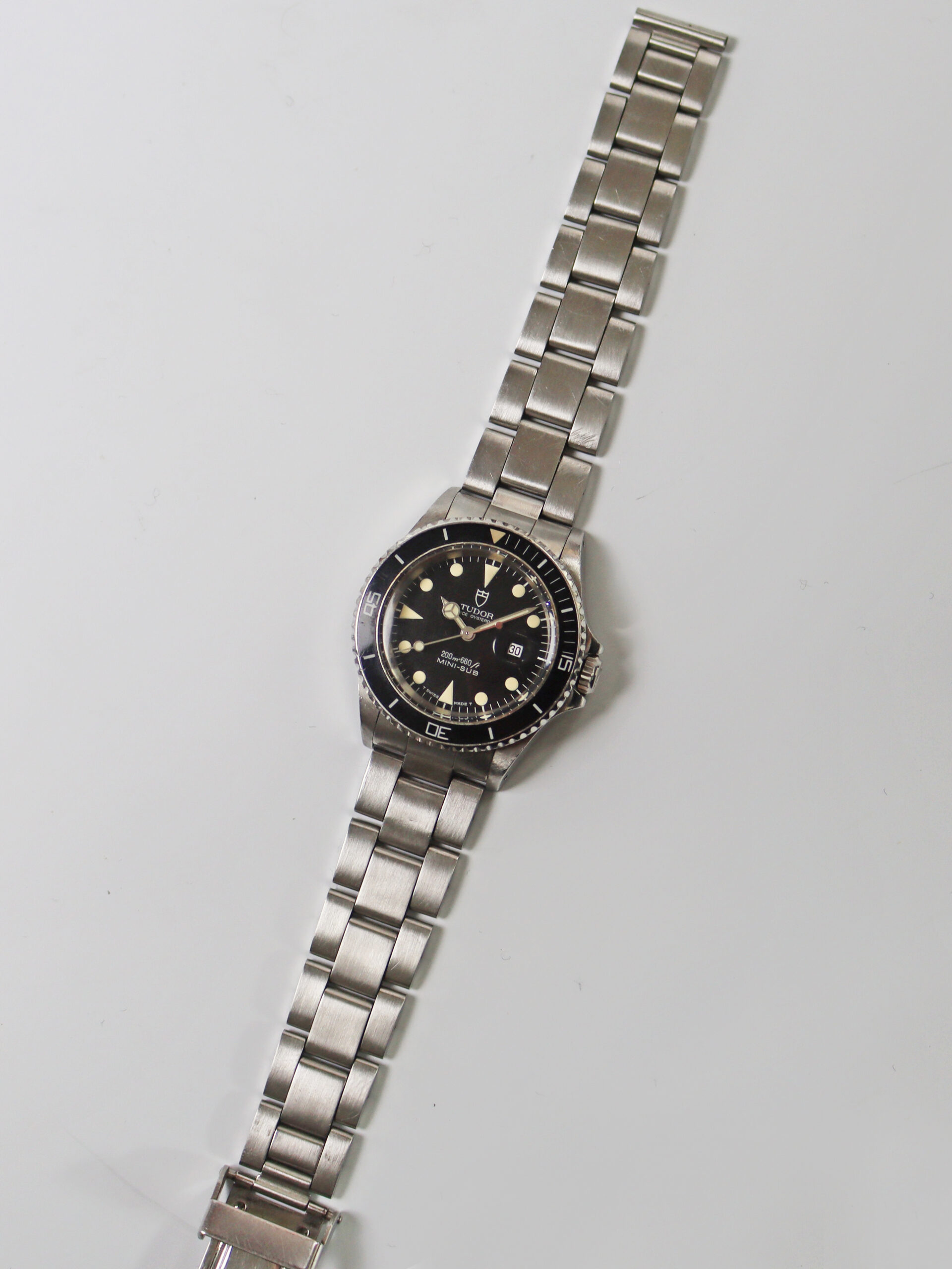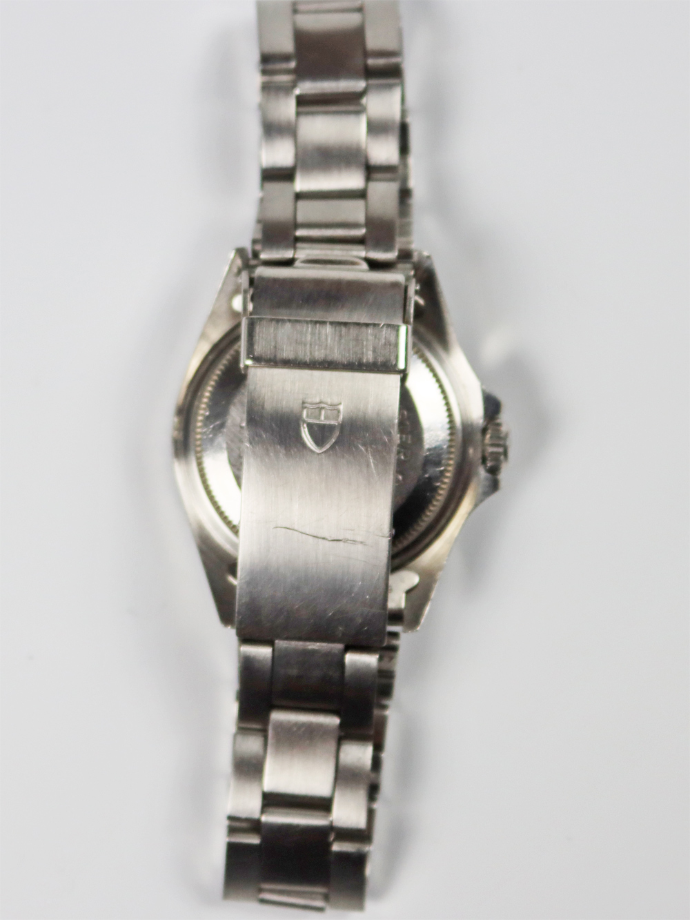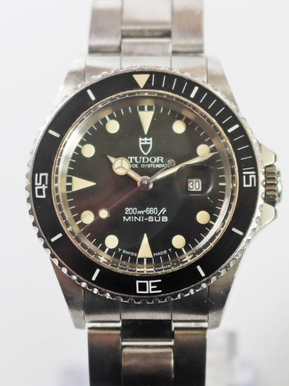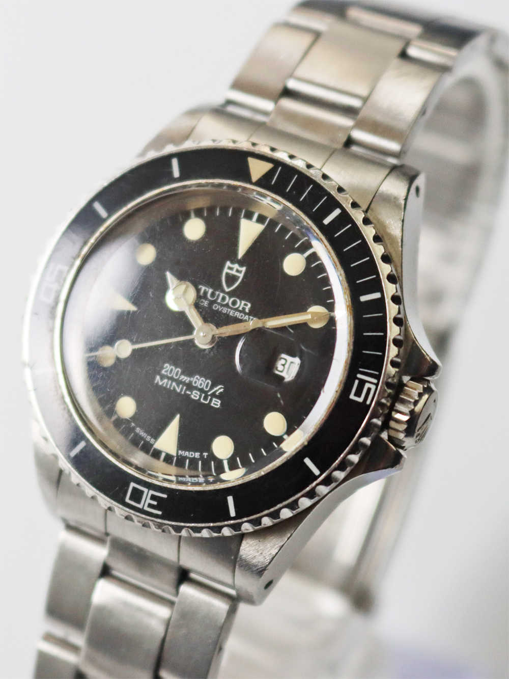 チュードル社はロレックスの傘下のメーカーで機械以外はロレックス社と同じ工程で作られますが、機械はエタ社のムーブメントを搭載し、価格的にもロレックス社の時計に比べると低価格帯ラインとして販売されておりました。 製造企画品としてはほぼロレックスと同ラインの安価版として企画されていましたが、その姉妹品の同型モデルだけではなくチュードル社ならではのデザインも見られます。中でもサブマリーナーラインではデザイン的に独自性が強いものがあり、人気があります。 このボーイズサイズのサブマリーナーモデルもロレックスラインにはない、独自性があり、スポーティーなボーイズ及び女性用ラインとして"MINI-SUB”の名前で人気モデルとなっております。文字盤の夜光塗料も均一に焼け針の夜光塗料と均一でとても良い状態で、全体に使用感はありますが当時のままのとても良いコンディションとなっております。