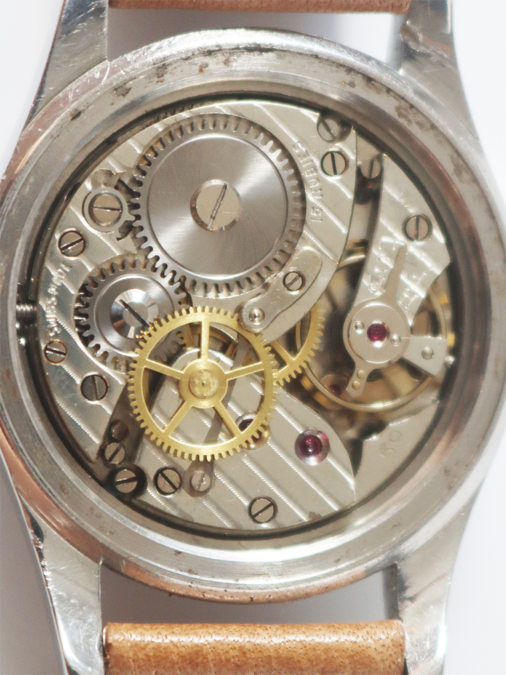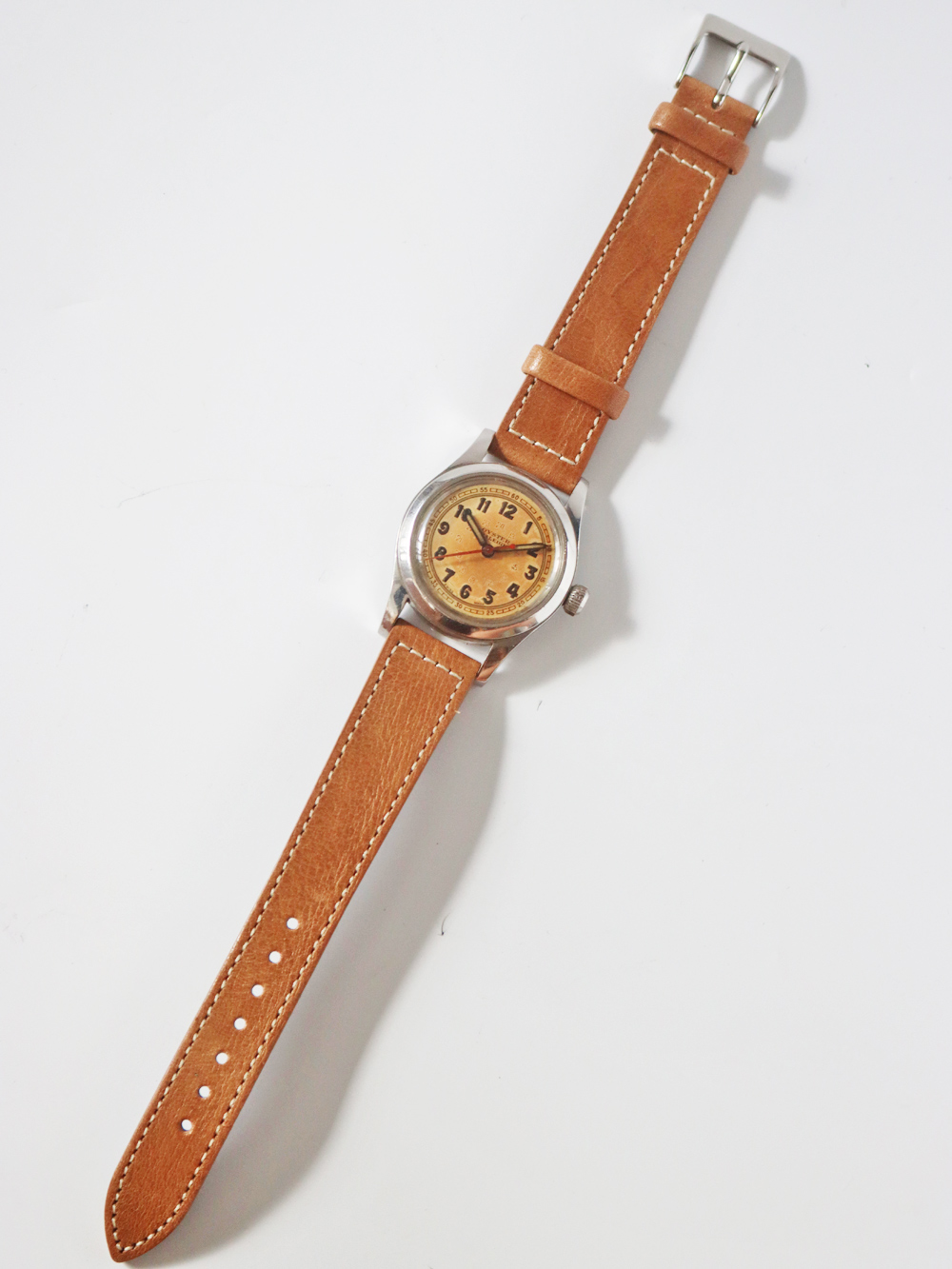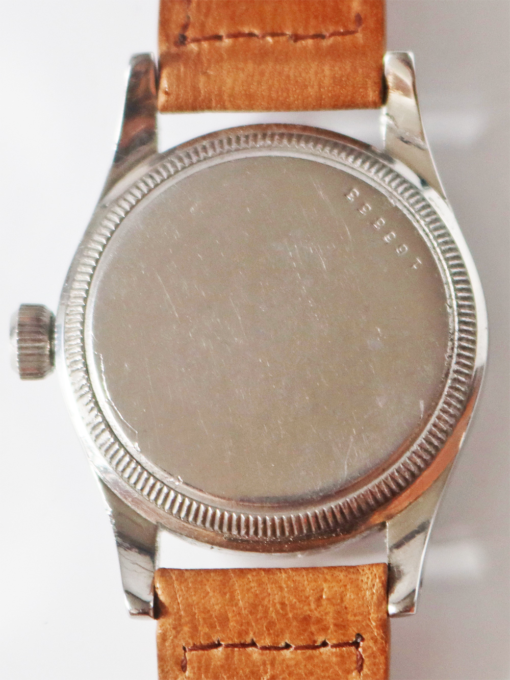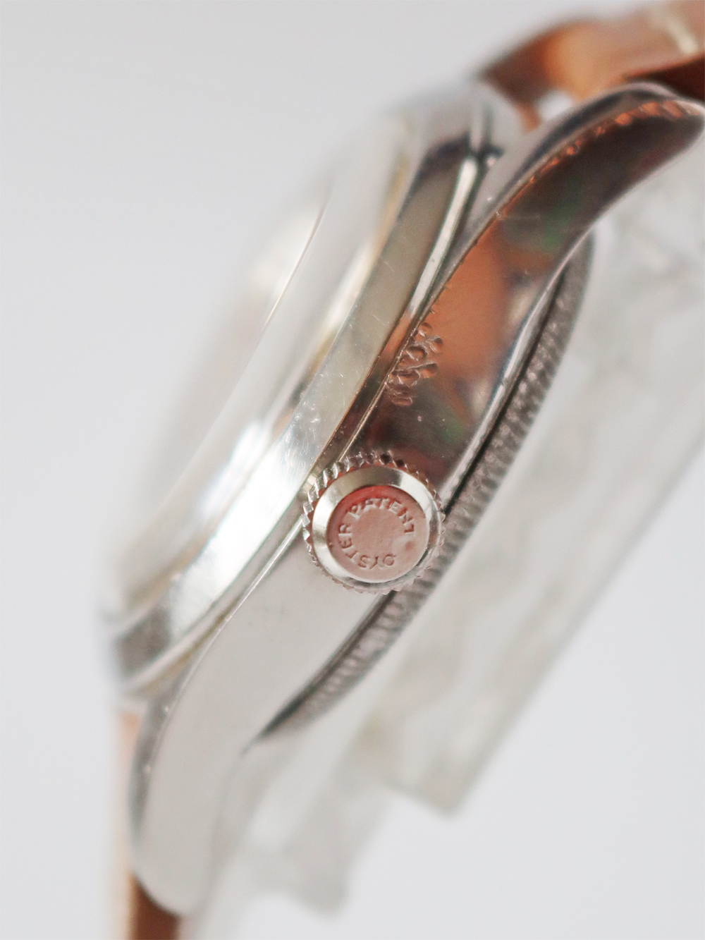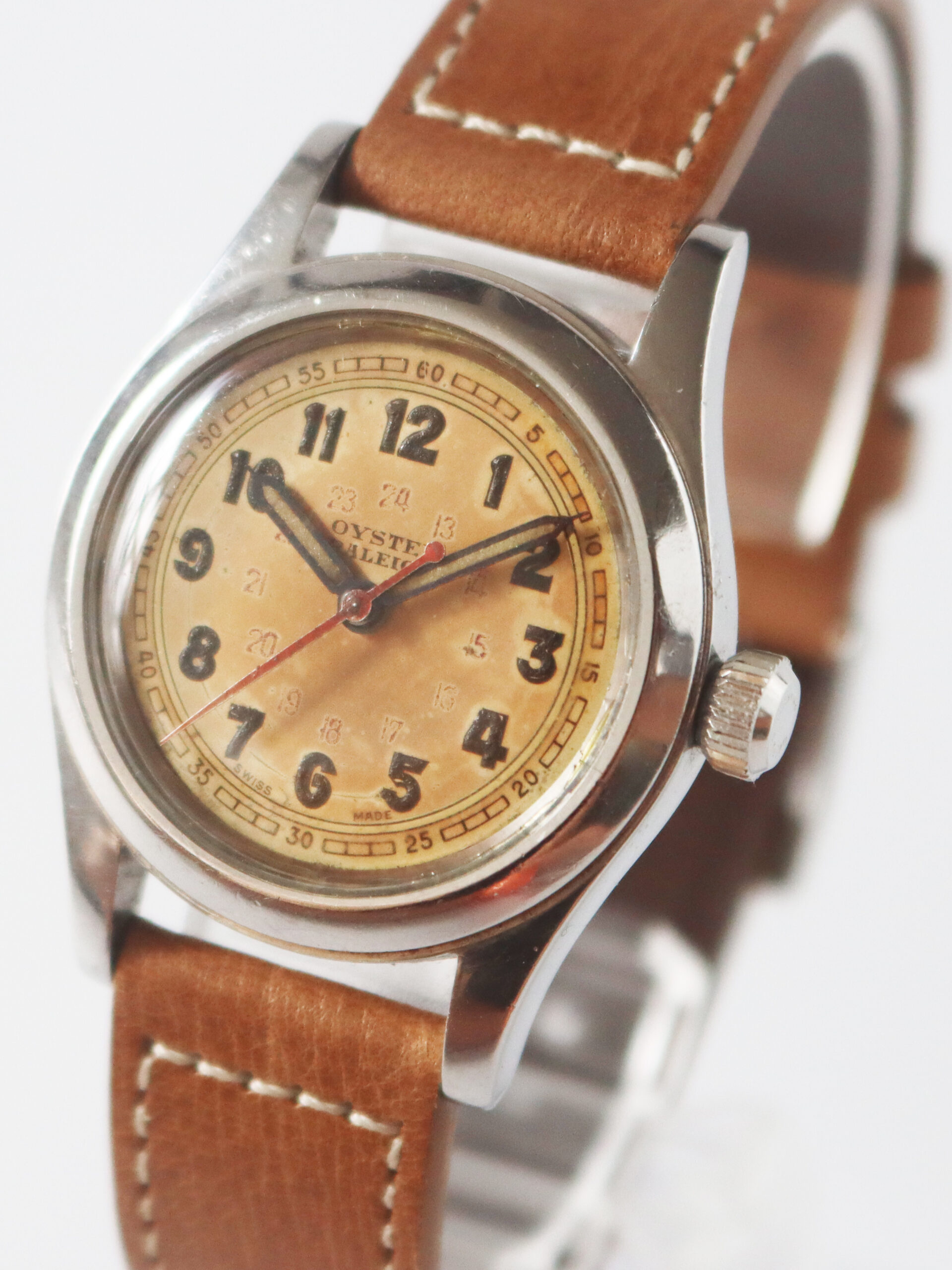 OYSTER WATCH Co.(オイスターウォッチカンパニー)とROLEX S.A. (ロレックス)との関係ははっきりこうであったという資料はなかなか見つかっていません。 オイスターウォッチ社が先に在りきで、ロレックス社が傘下に収めたのでは?という説が一番妥当であるかのように思われますが、殆どのOYSTER WATCH Co.社の時計はスイス・フォンテンメロン社のキャリバー59が搭載されており、あたかもオイスターウォッチ社が独自路線で製造していたという根拠と一見思えますが、その機械の文字盤側、文字盤を外して機械の文字盤側のいわゆる地板には必ずROLEX・GENEVEと刻印が見らます。 恐らくTUDOR社同様創始者のハンスウィルスドルフが出資し傘下に収めた歴史があると思われます。文字盤はアウターにミニッツマーカー及びレイルウェイトラックに夜光塗料のアラビア数字に夜光ポインテッドバトン型インデックスでレッドセンターセコンド針に文字盤中央に24時間のレッドマーカー付きダイヤルと全体の焼けも含みとても良いヴィンテージ感のあるコンディションとなっております。