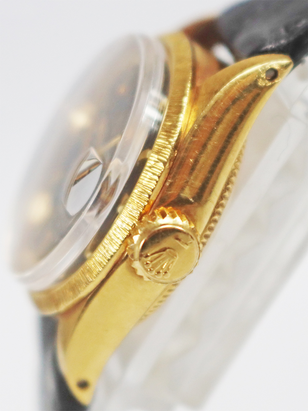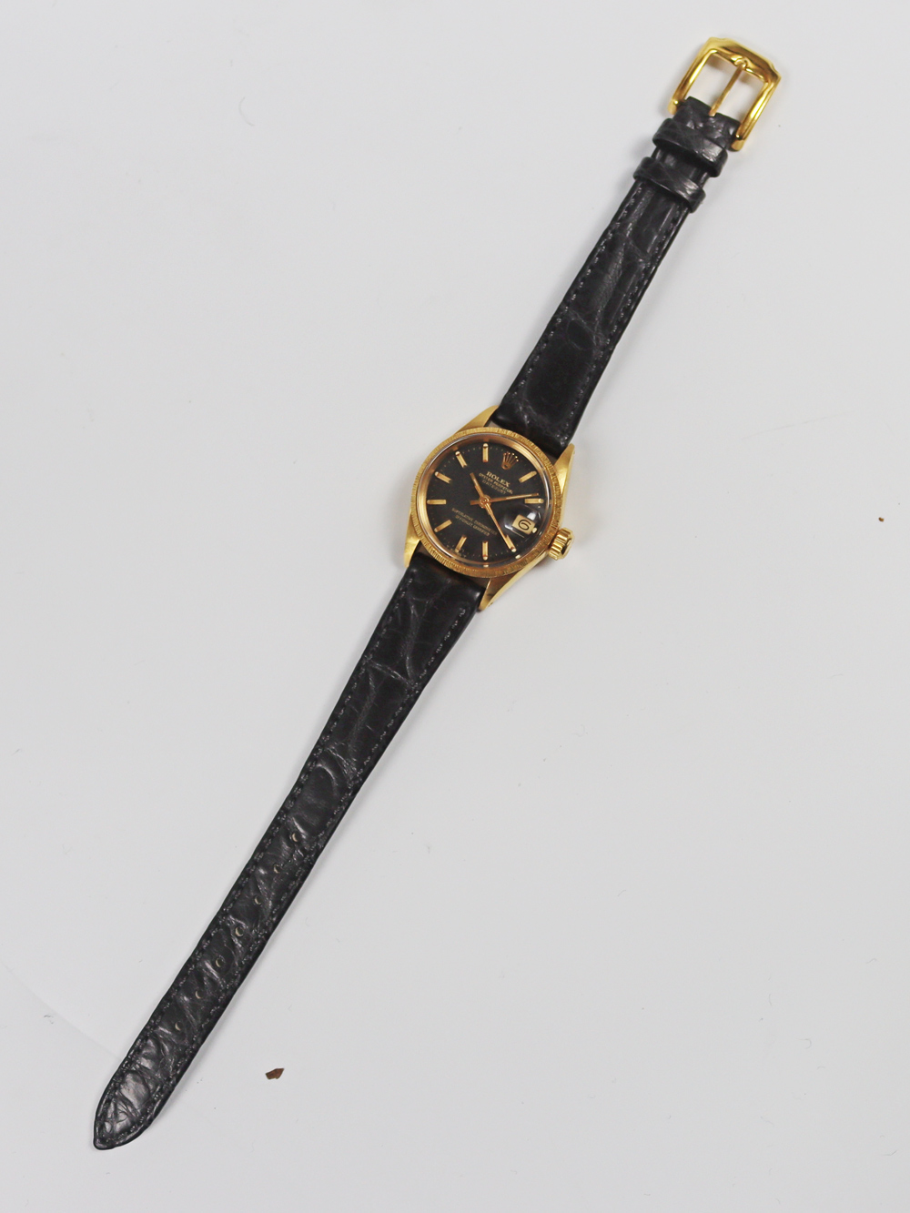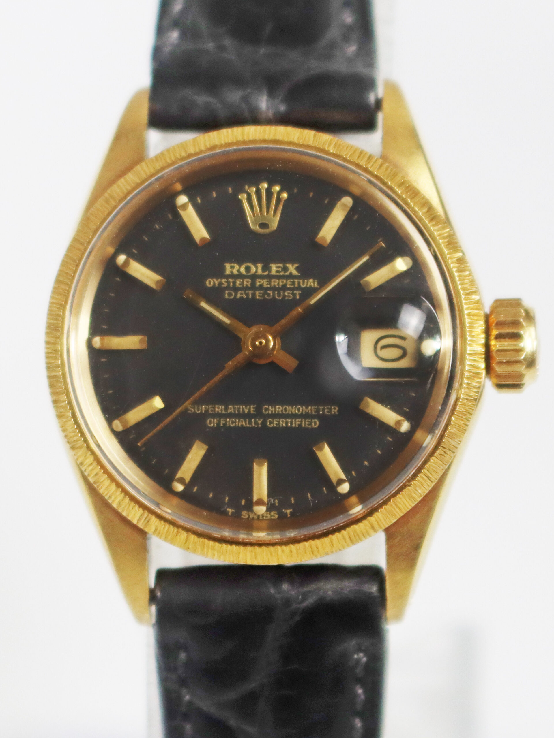 このモデルは1970年に製造された18金仕様でバーク仕上げの珍しいベゼル仕様の自動巻きキャリバー1161搭載の「DATEJUST」モデルとなります。恐らくキャリバー1161の最終期の女性用自動巻きモデルとなります。ブラックマットダイヤルにゴールドプリント仕様となっており、少し太めのバトン型インデックス仕様の文字盤で経年変化のダメージの無いとても良いコンディションとなっております。