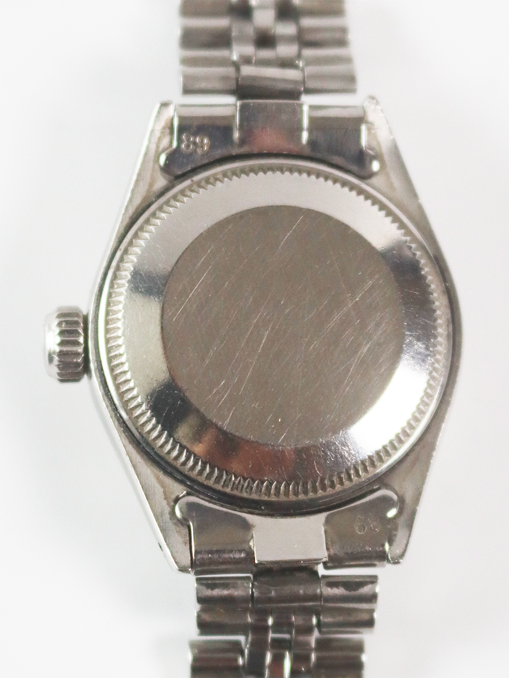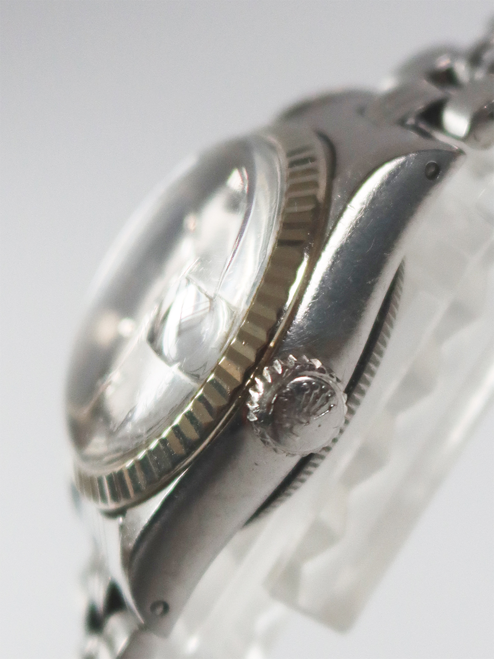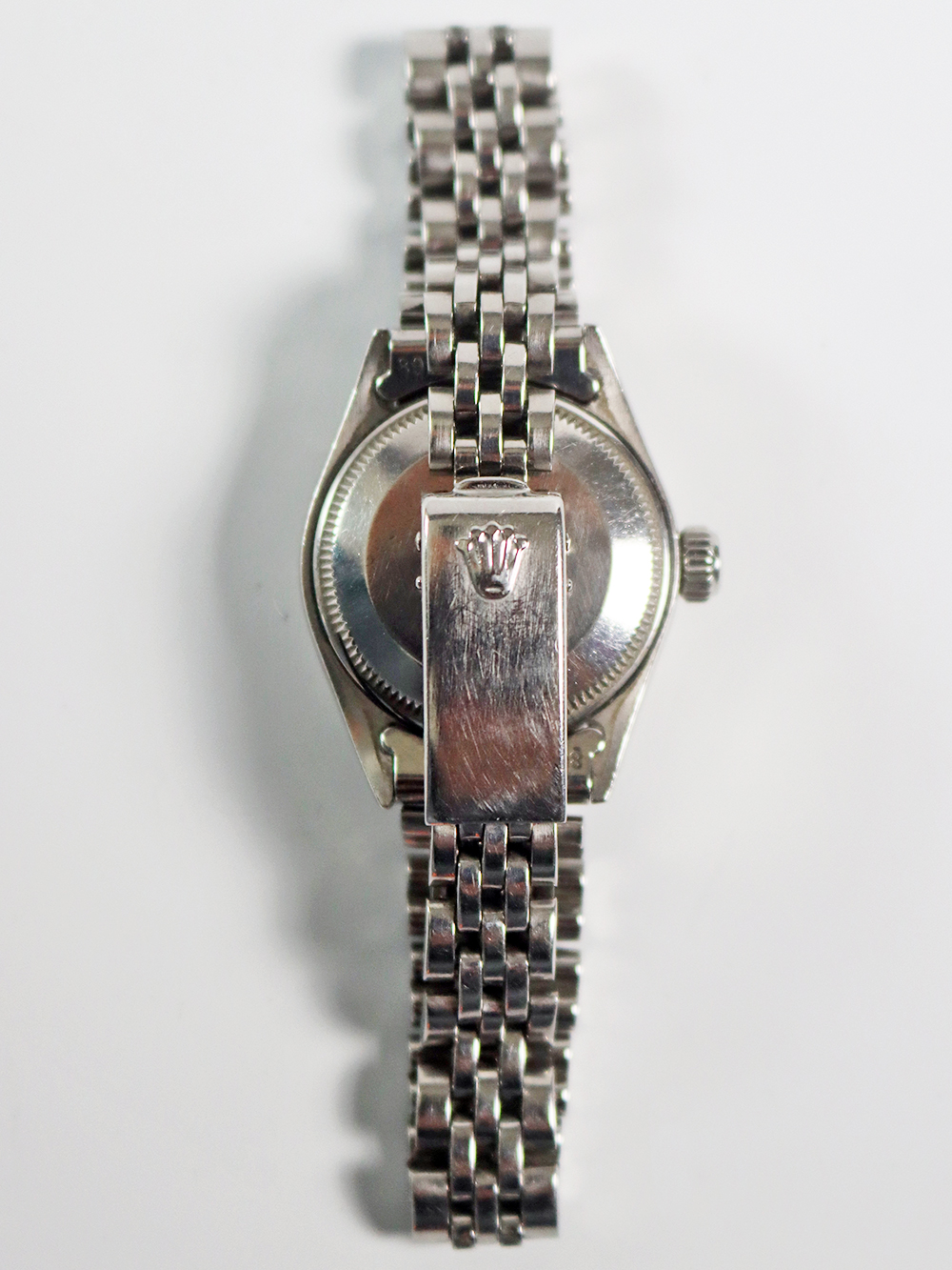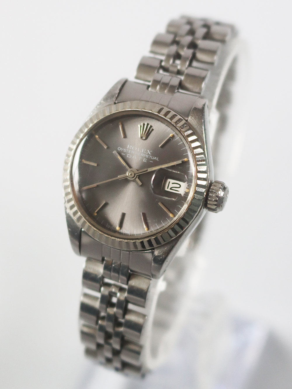この時計は1960年代後期のカレンダー機能付き女性用自動巻きです。 ステンレススチールにホワイトゴールドのフルーテッドベゼル仕様で文字盤は濃いめのグレーにホワイトプリントでバトン型インデックスにバトン型針の組み合わせで大き目なオイスターケースの雰囲気を出来る限り上品な見た目に仕上げ、古いフォルデッドジュビリーブレスレットに因り更にアンティークテイストも感じられるとても良い状態となっております。 ケースは使用傷はありますが、当時のままのとても良いオリジナルコンディションとなっております。