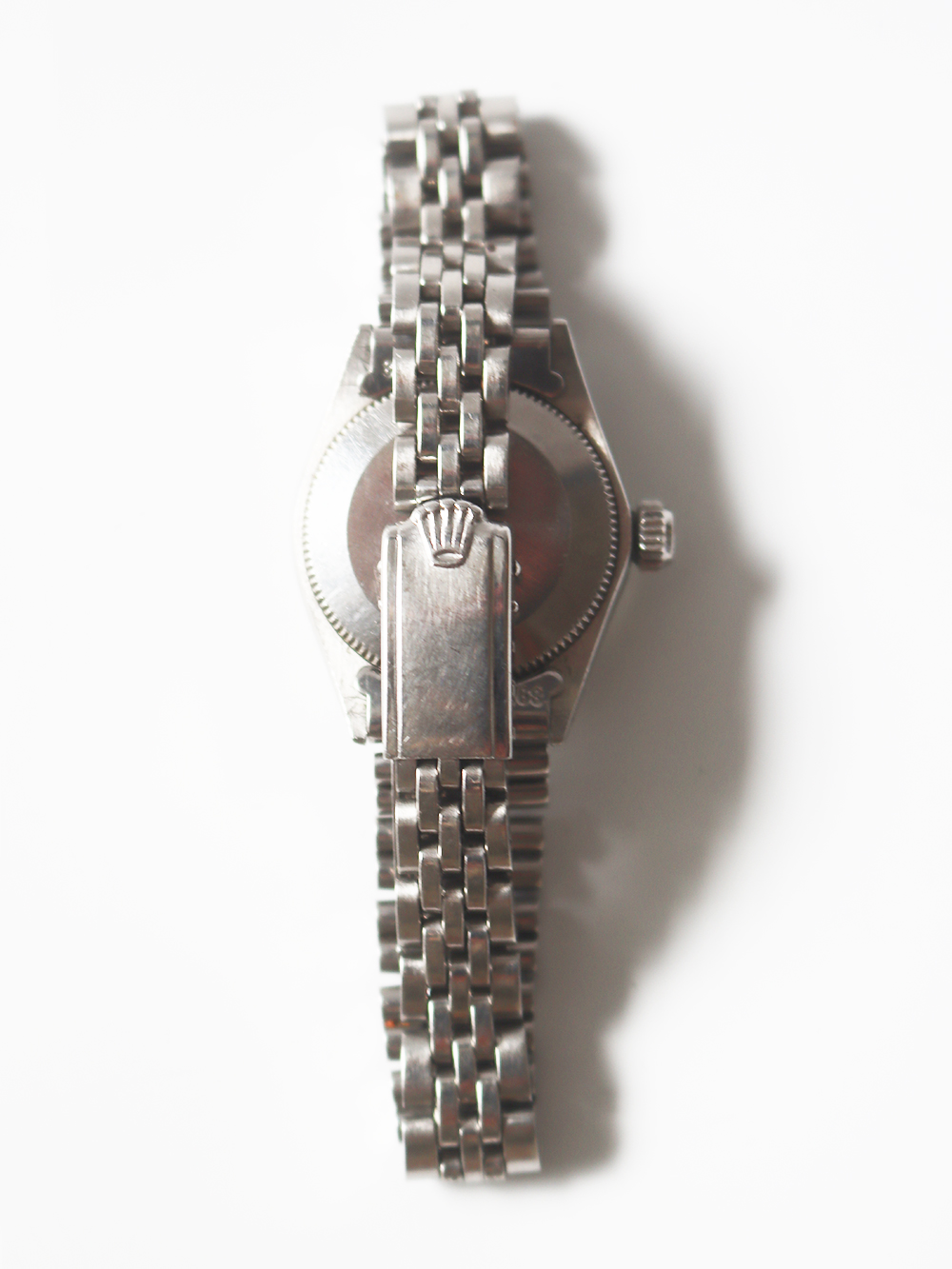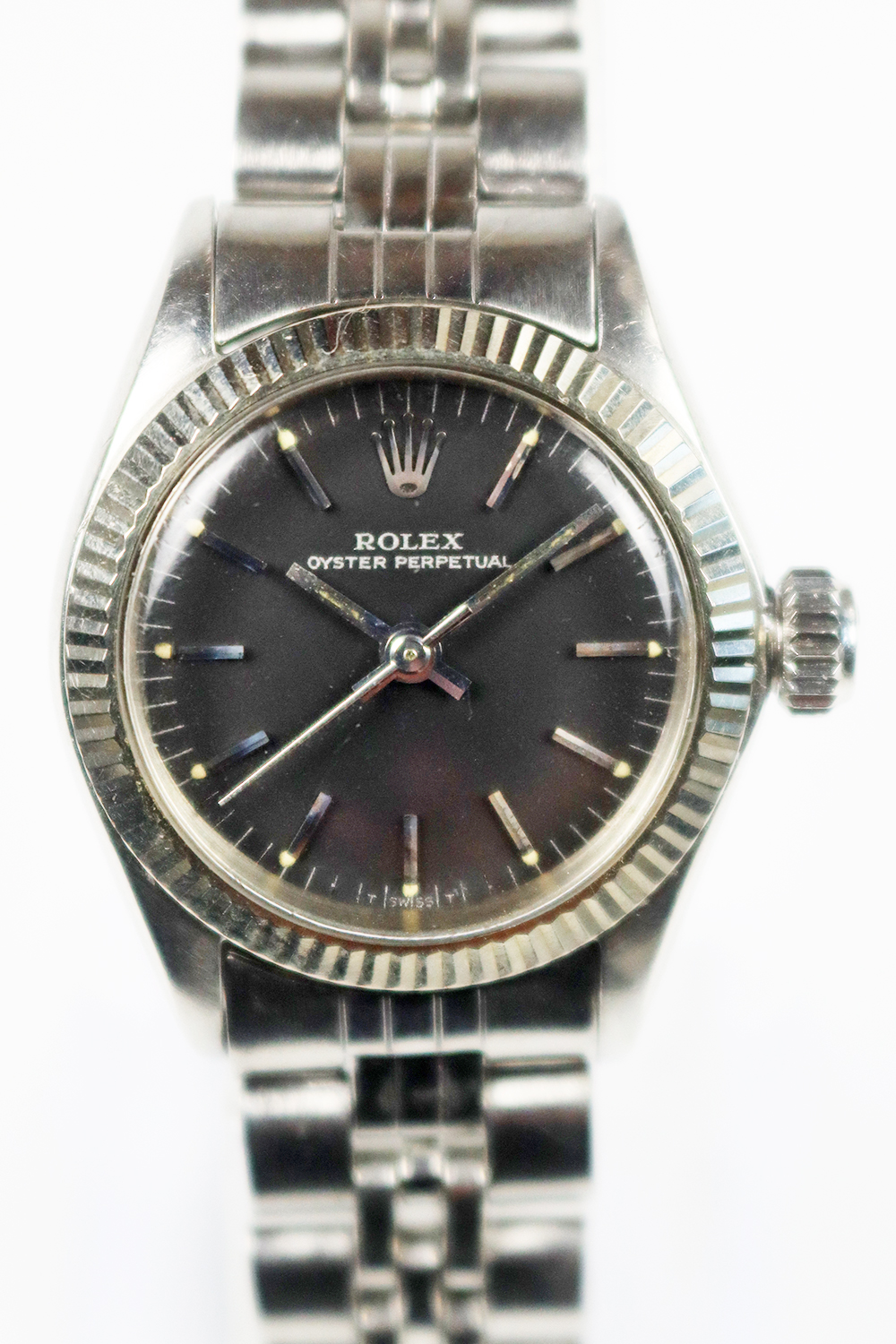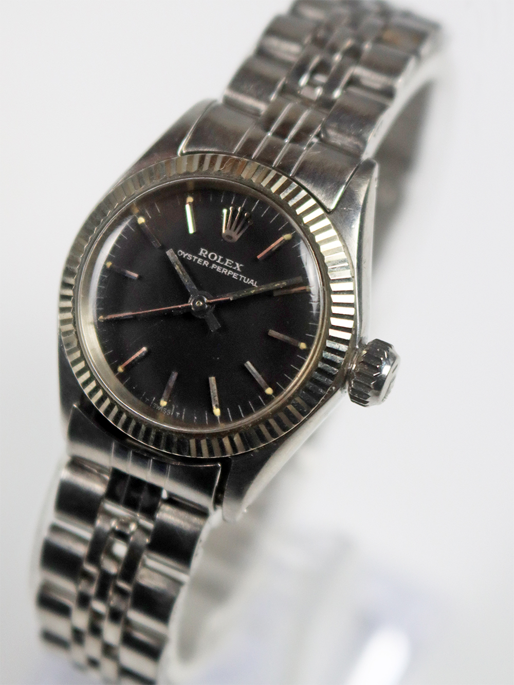この時計はステンレススチールケースにホワイトゴールドフルーテッドベゼル仕様の1968年製女性用自動巻きとなっております。文字盤はブラックマットサテン仕上げでシルバープリントでアウター夜光ポインテッドアップライドバトン型インデックス仕様に夜光バトン型針の組み合わせとなっております。ケースは使用傷はありますが、当時のままのとても良いオリジナルコンディションとなっております。ブレスレットはフォルデッドジュビリーブレスレットで駒間の伸びの無いとても良いコンディションとなっております。