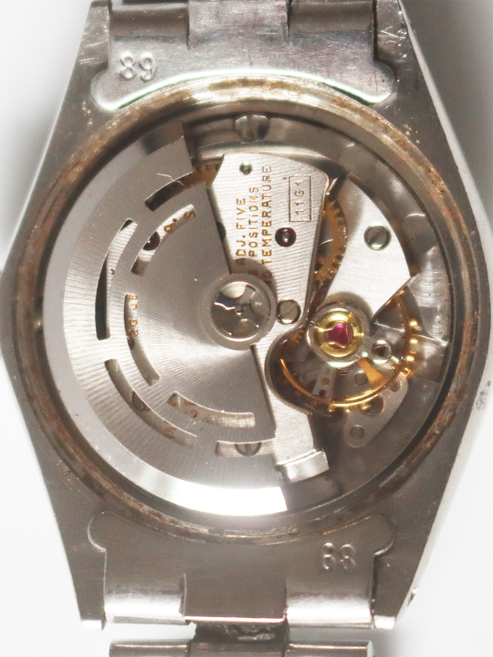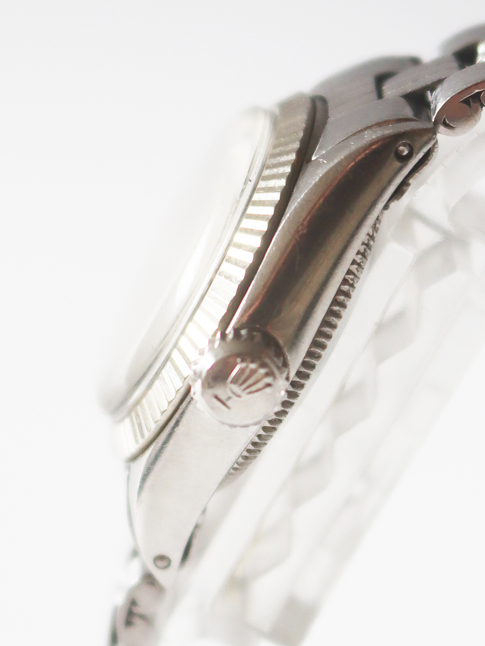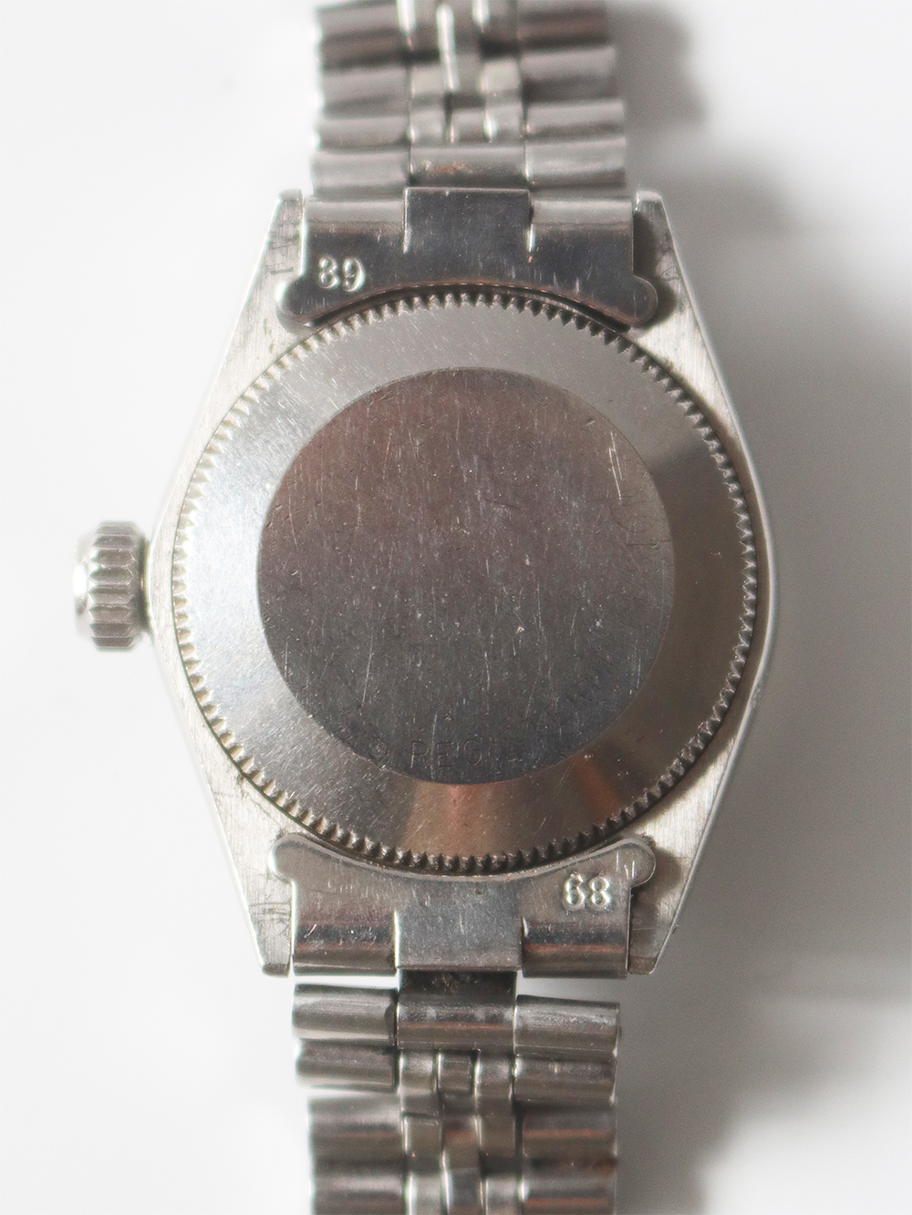 この時計はステンレススチールケースにホワイトゴールドフルーテッドベゼル仕様の1968年製女性用自動巻きとなっております。文字盤はブラックマットサテン仕上げでシルバープリントでアウター夜光ポインテッドアップライドバトン型インデックス仕様に夜光バトン型針の組み合わせとなっております。ケースは使用傷はありますが、当時のままのとても良いオリジナルコンディションとなっております。ブレスレットはフォルデッドジュビリーブレスレットで駒間の伸びの無いとても良いコンディションとなっております。