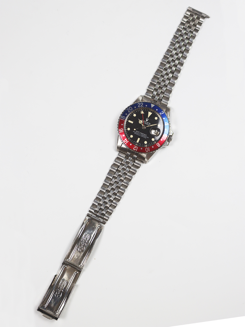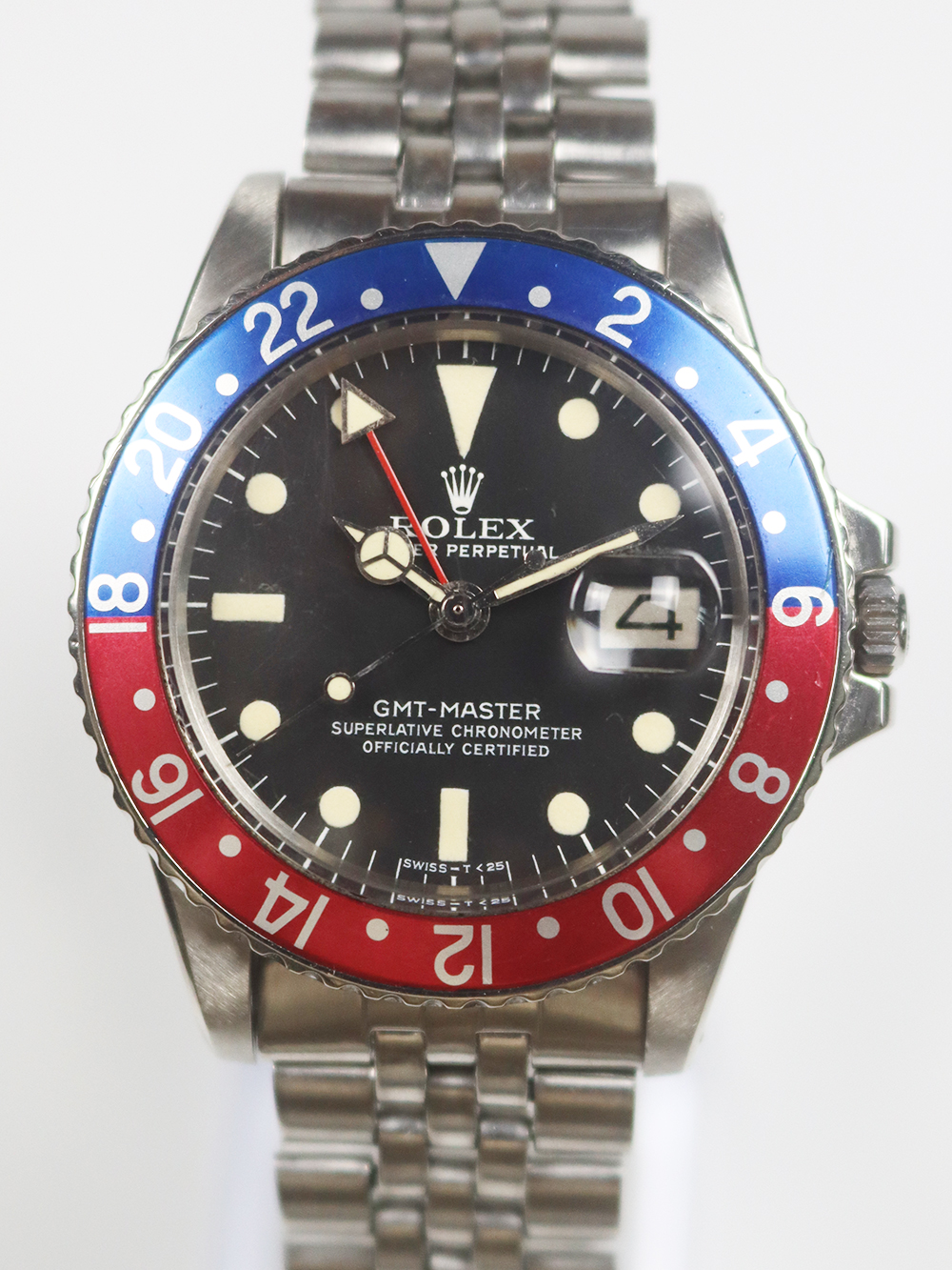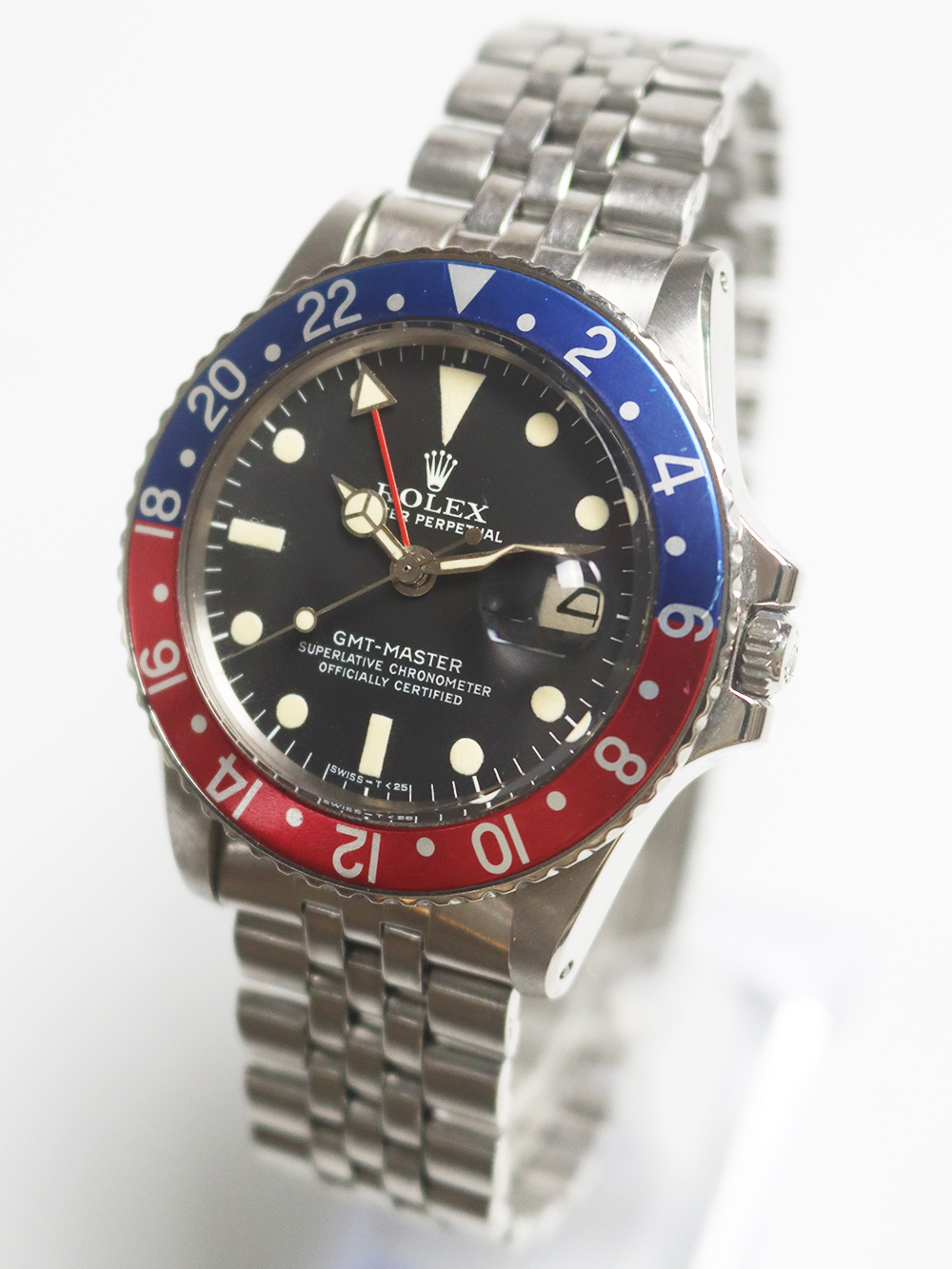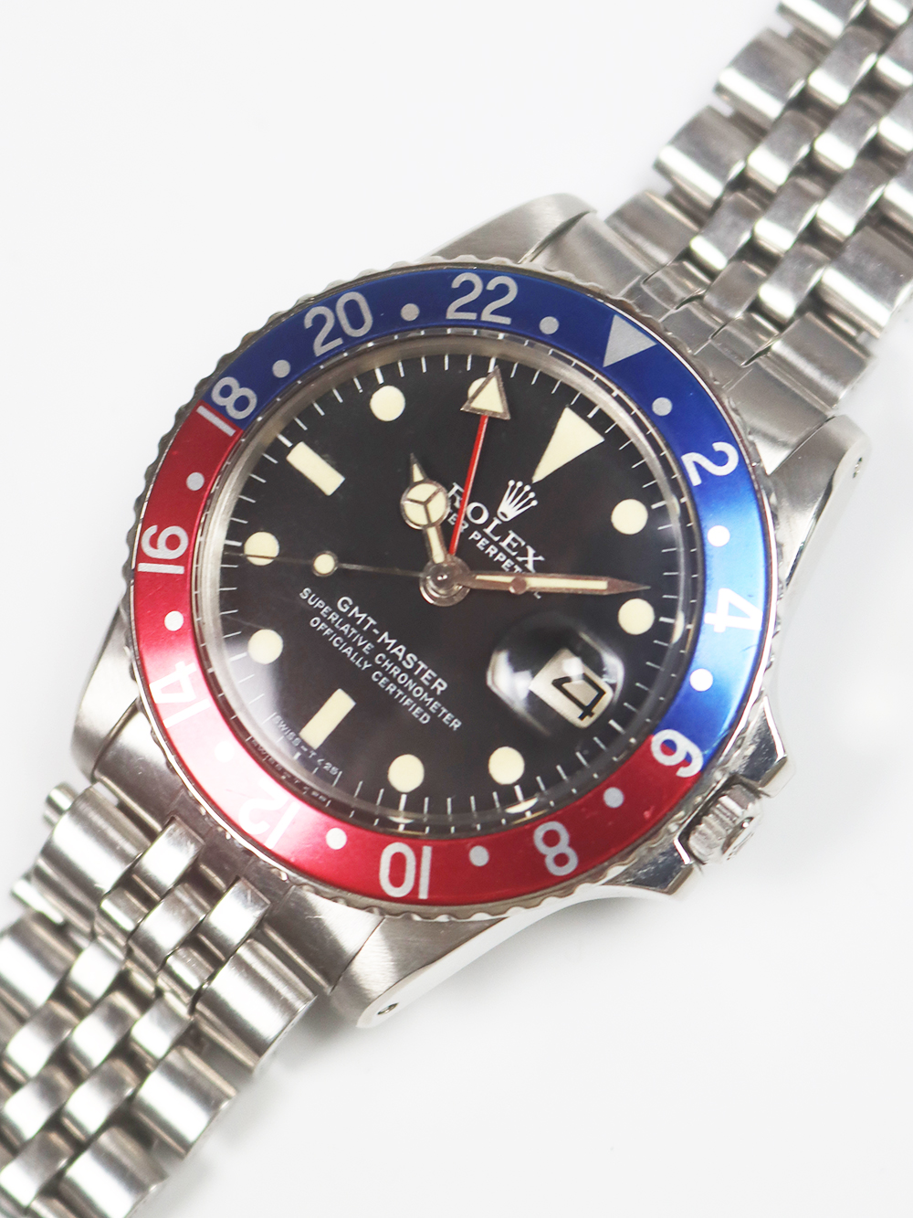 2か国の任意の時間を知る事ができるハイスペック仕様の時計、GMTマスターは発売当時(1954年頃設計されほぼ2年後に出荷発売)アメリカの大手航空会社、パンアメリカン航空のパイロット達の要望に応えて製品化が進んだモデルで、同社のオフィシャルサプライヤーとなり、時代の変遷とともに国際間のビジネスが拡大していった背景を受けて、その後世界を飛び回るハイクラスのビジネスマン達にも、高い実用性を認識され使用されてゆきました。今日ではスポーツモデル枠となっておりますが、当時はスペシャルユーザー向けの高級モデルでした。 このモデルは1970年製造のものでベゼルが経年変化で退色変色が見られ、文字盤の夜光塗料が綺麗な均一の焼けが見られ、針の夜光塗料とほぼ同色の焼けとなっており、全体に長い年月使われてきた使用感がとても良いアンティークテイストとなっております。ケースも若干ポリッシュはされてると思いますが厚みの残ったとても良いコンディションです。ブレスレットはフォルデッドジュビリーブレスレットで僅かに駒間の伸びはありますがとても良いコンディションとなっております。