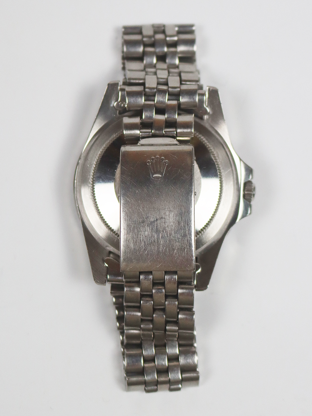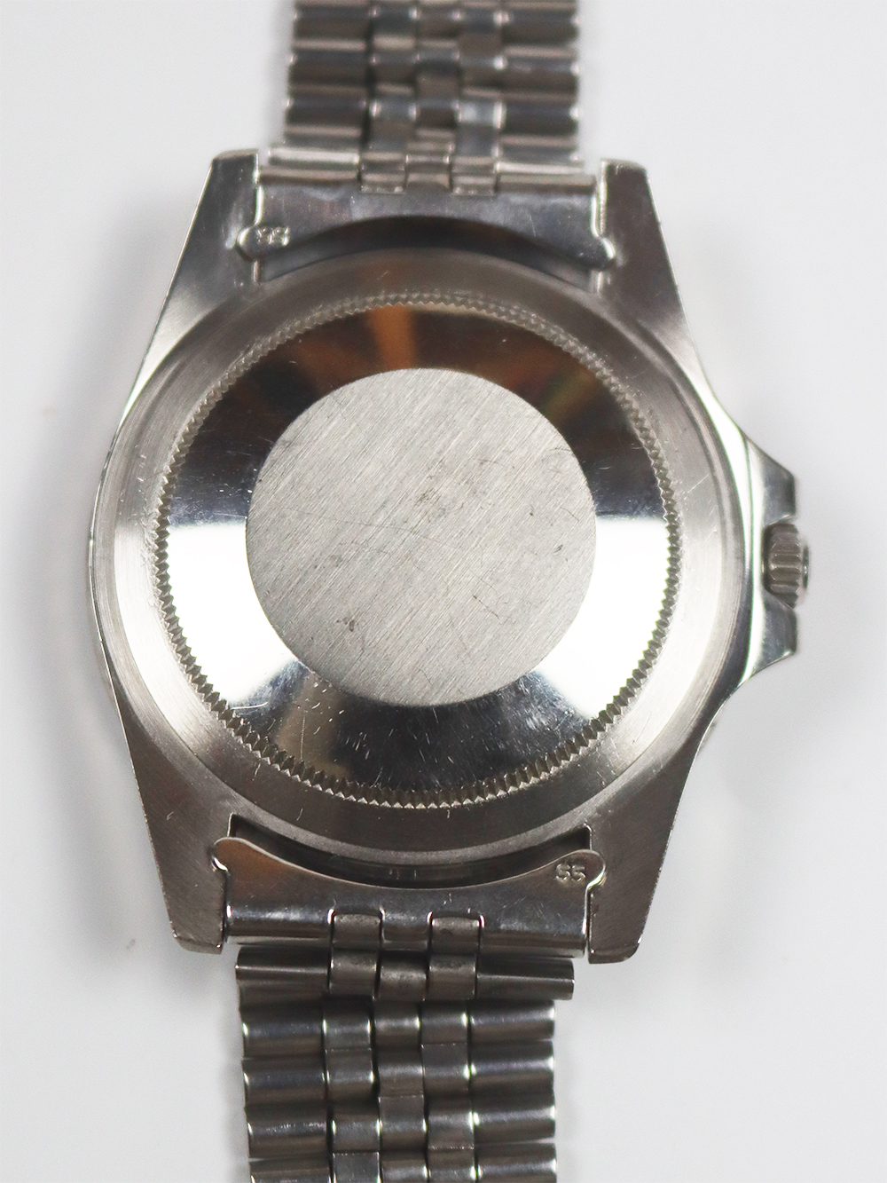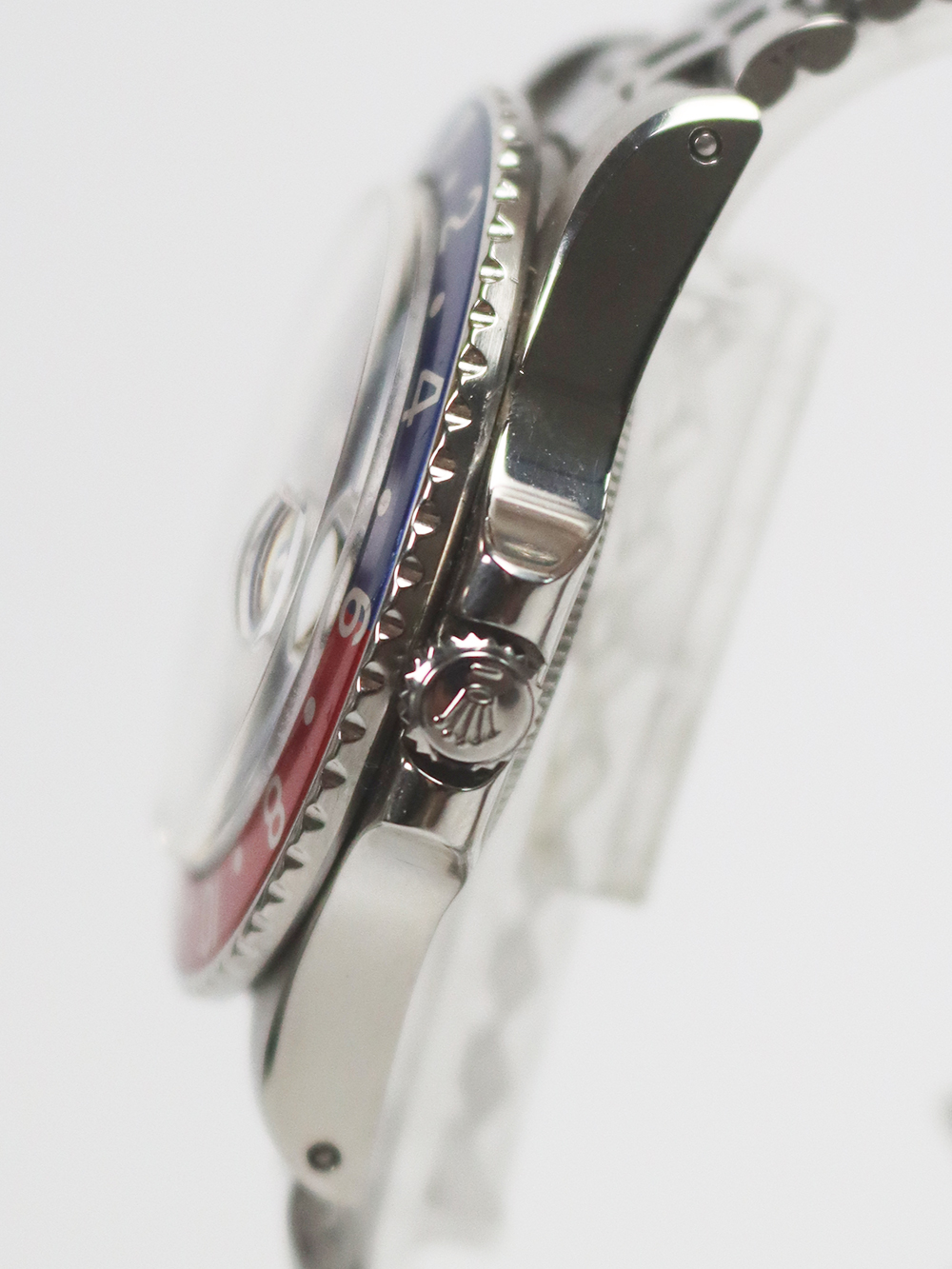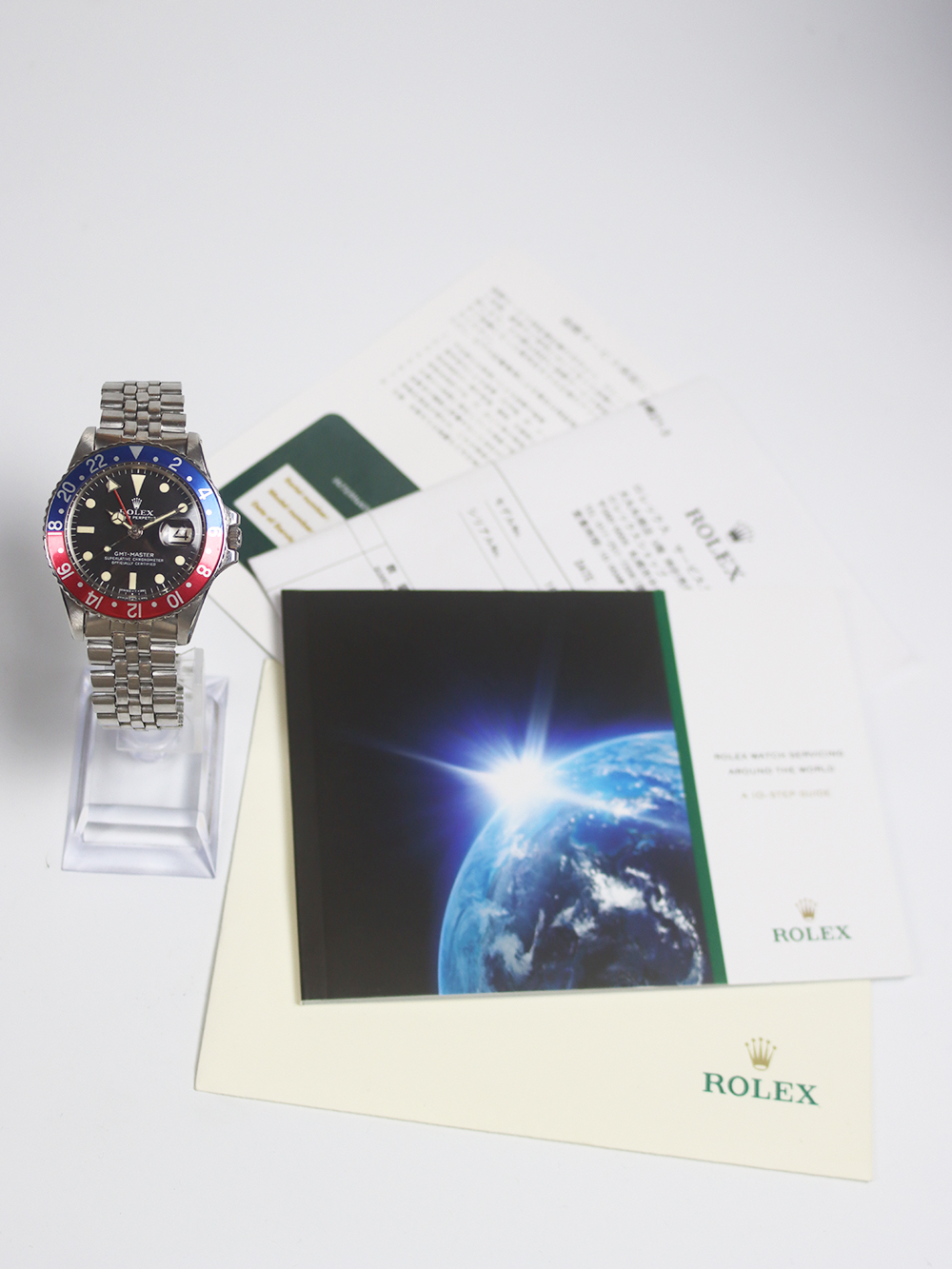 2か国の任意の時間を知る事ができるハイスペック仕様の時計、GMTマスターは発売当時(1954年頃設計されほぼ2年後に出荷発売)アメリカの大手航空会社、パンアメリカン航空のパイロット達の要望に応えて製品化が進んだモデルで、同社のオフィシャルサプライヤーとなり、時代の変遷とともに国際間のビジネスが拡大していった背景を受けて、その後世界を飛び回るハイクラスのビジネスマン達にも、高い実用性を認識され使用されてゆきました。今日ではスポーツモデル枠となっておりますが、当時はスペシャルユーザー向けの高級モデルでした。 このモデルは1970年製造のものでベゼルが経年変化で退色変色が見られ、文字盤の夜光塗料が綺麗な均一の焼けが見られ、針の夜光塗料とほぼ同色の焼けとなっており、全体に長い年月使われてきた使用感がとても良いアンティークテイストとなっております。ケースも若干ポリッシュはされてると思いますが厚みの残ったとても良いコンディションです。ブレスレットはフォルデッドジュビリーブレスレットで僅かに駒間の伸びはありますがとても良いコンディションとなっております。
