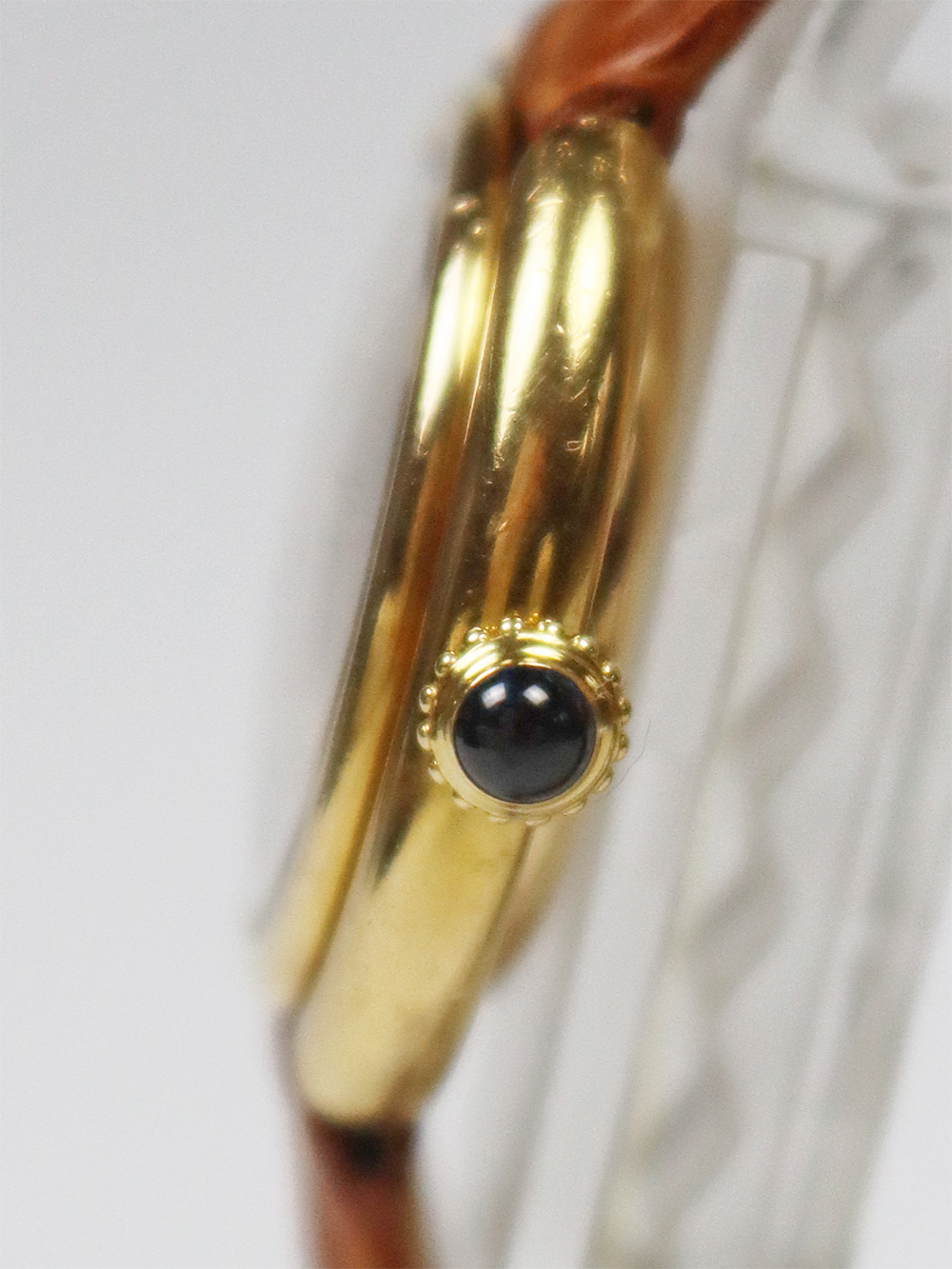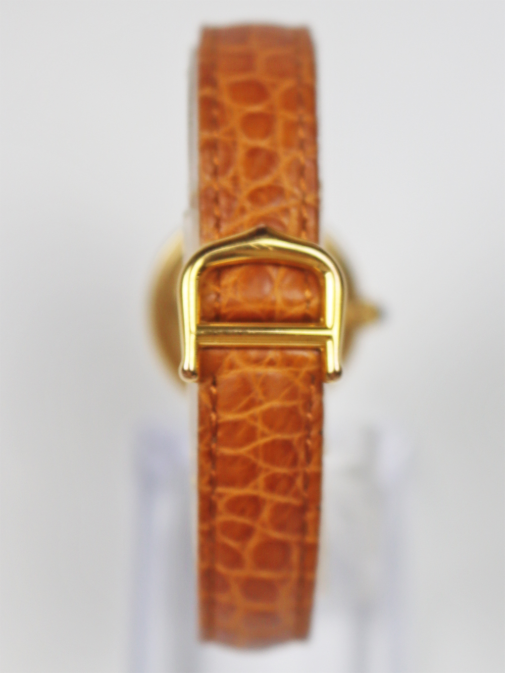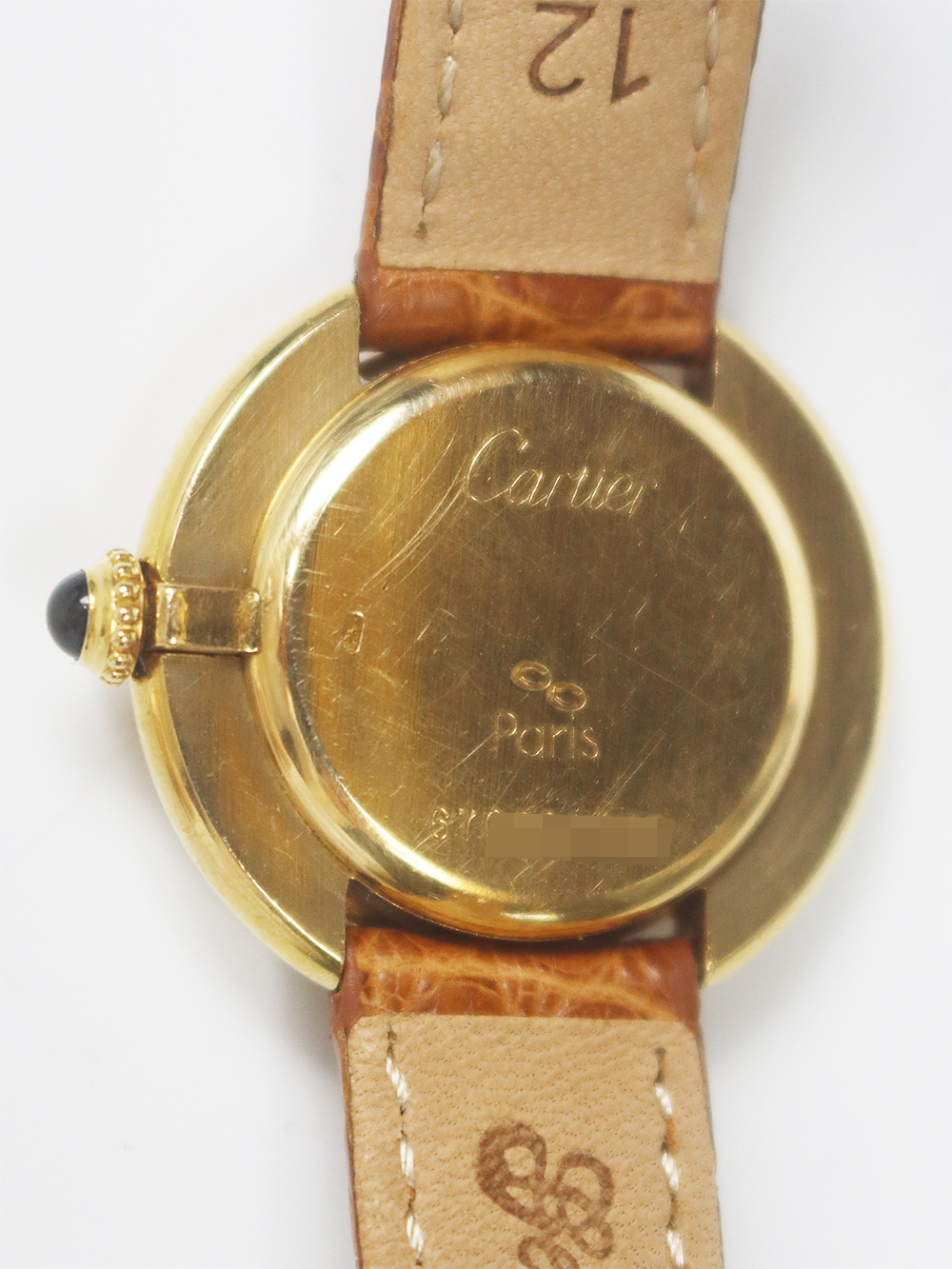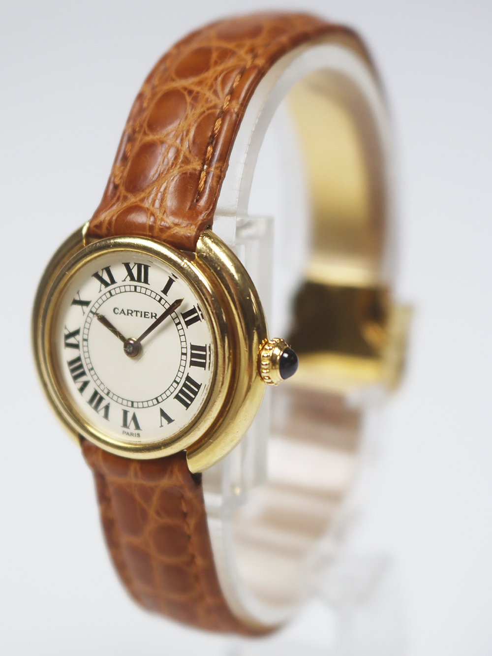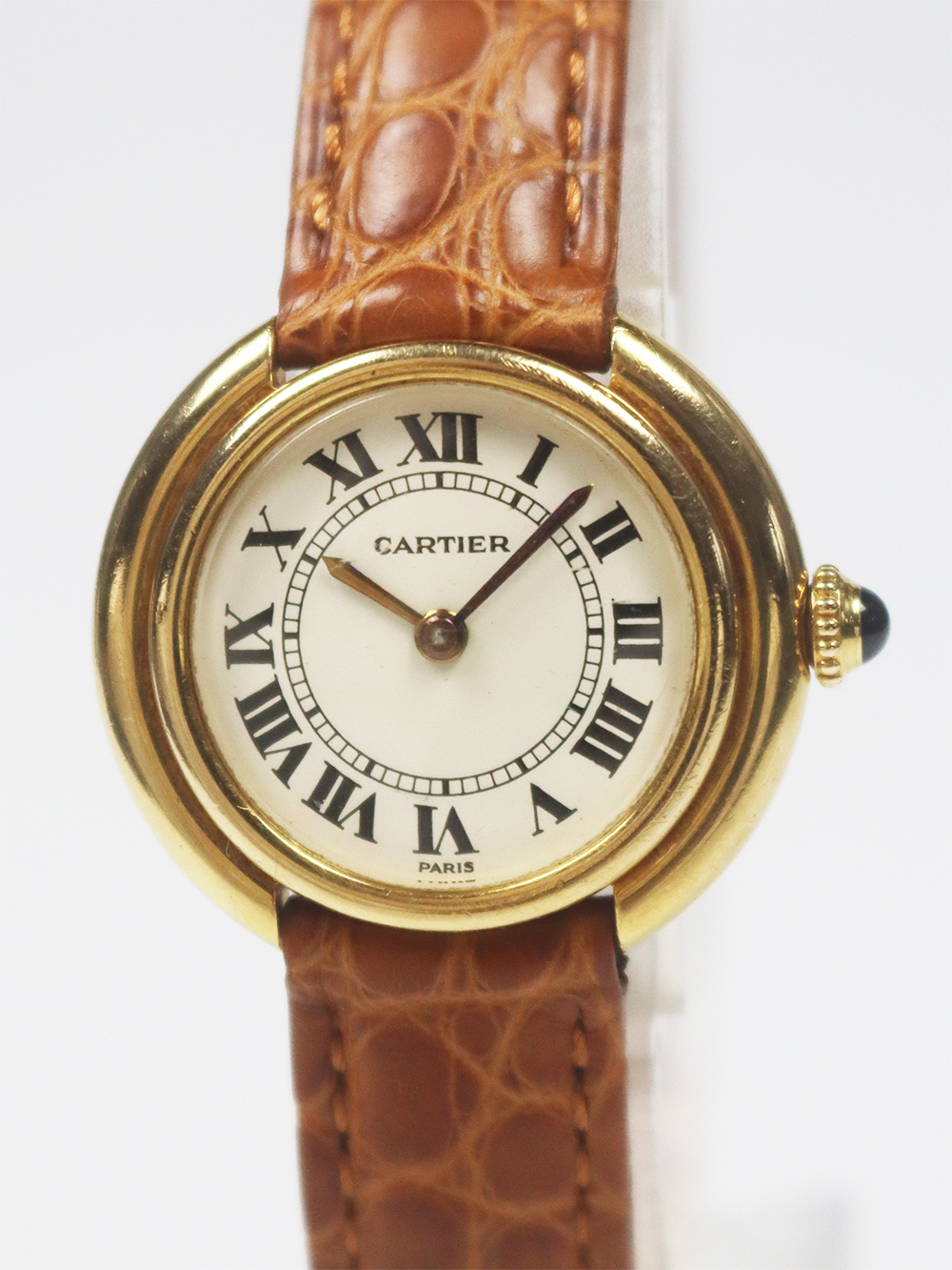 この時計はヴァンドーム広場に1899年に本店を移転した際にルイ・カルティエ自身が広場を行き来する馬車の車輪をヒントに構築されたモデルと言われております。 文字盤6時側ボトムにPARISとプリントが入れられた通称“パリスダイヤル”と呼ばれる1970年代の時計で文字盤に隠し文字が入れられる前の仕様となります。ダイヤルはかなり焼けが見られヴィンテージテイストが感じられるとても良いコンディションになっております。 バックルは近年のゴールドプレートのディプロイアントバックルとなっております。