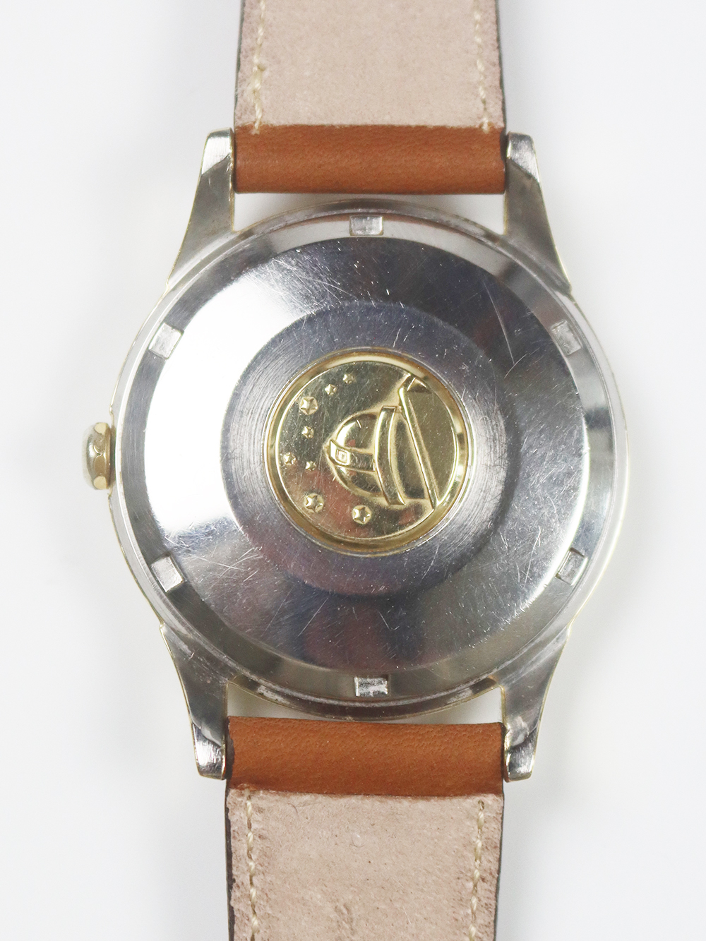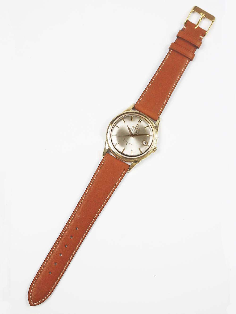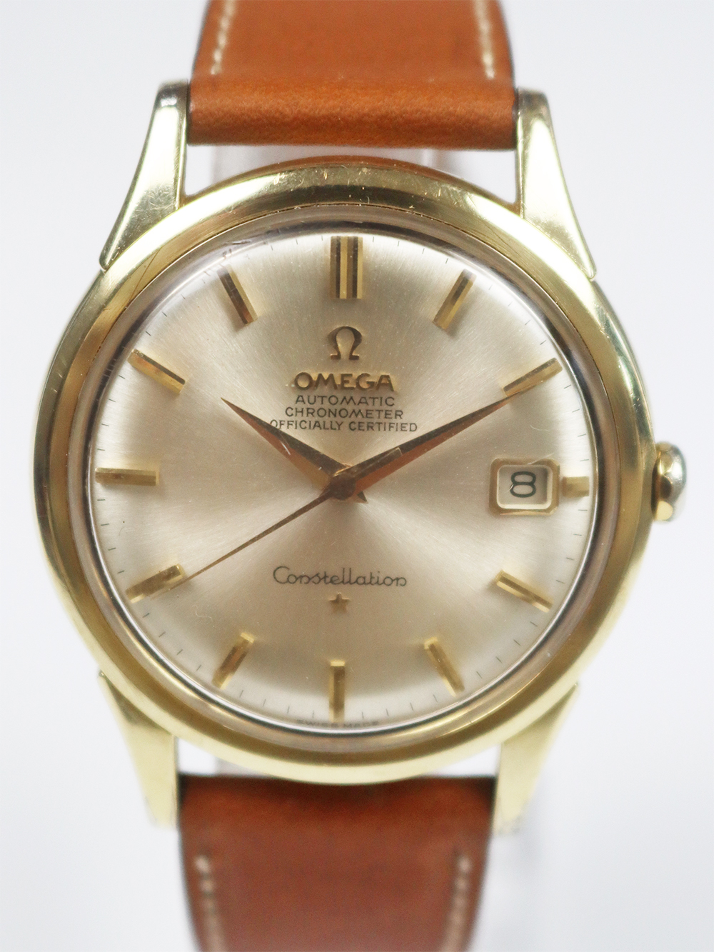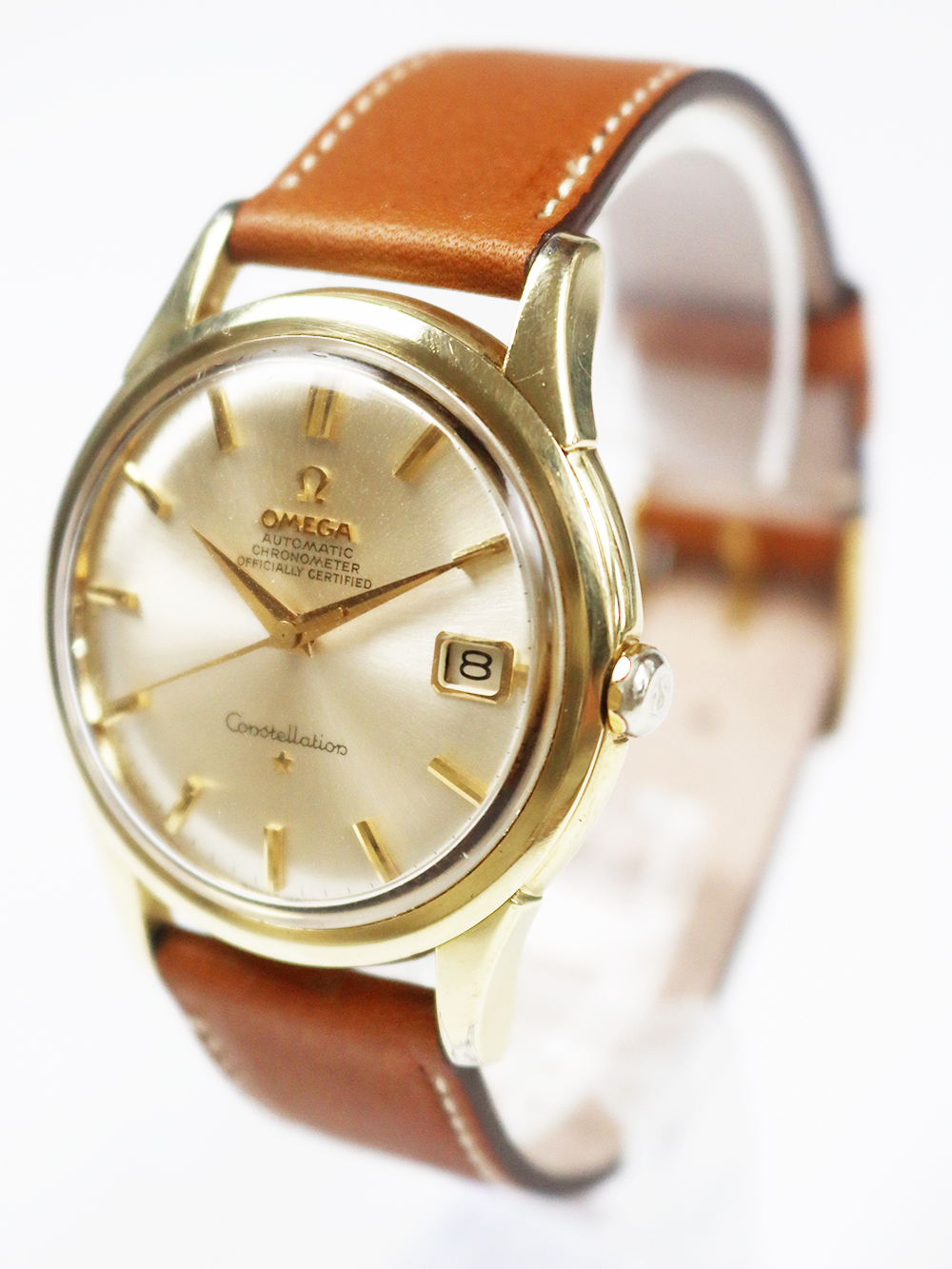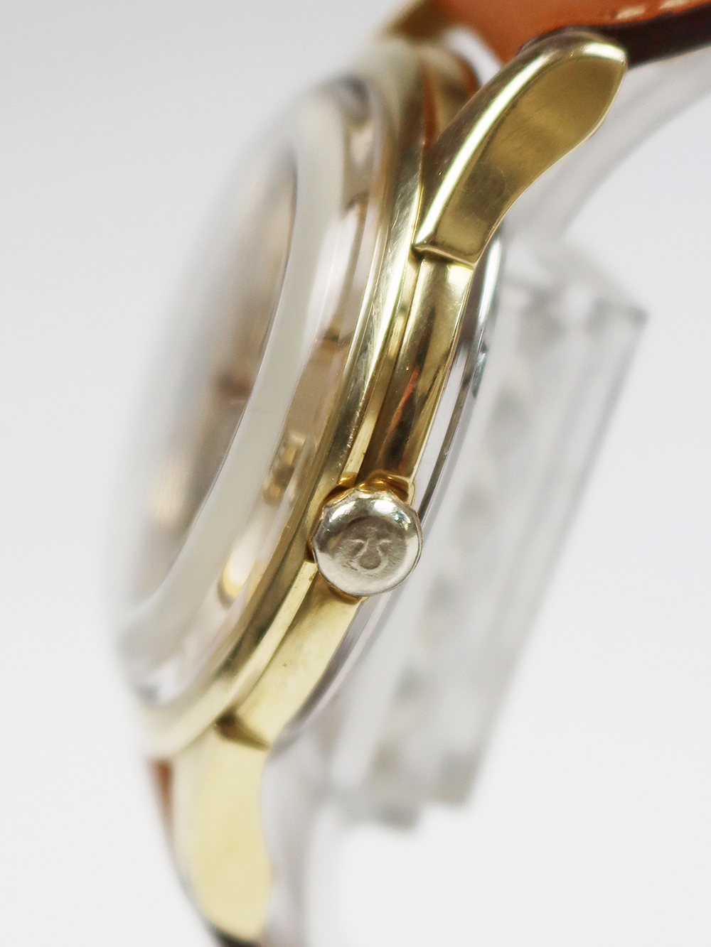 このモデルは1960年代前期のコンステレーションカレンダーモデルとなります。 オメガ社らしい形状のケースで全体に厚みのある大き目のケース仕様となります。文字盤もゴールドアップライドダイヤカットバトン型インデックスにゴールドダウフィン型針の組み合わせとなっております。 1958年~59年頃から作られたキャリバー550をベースにカレンダー機能を付けてクロノメーター用(コンステレーション用)として作られたキャリバー561搭載のモデルとなります。ロールゴールドプレートに裏側はステンレス仕様となっておりますがケースの重厚感とダイヤルの高級感によりヴィンテージオメガの味わい深いモデルの一つと云えます。