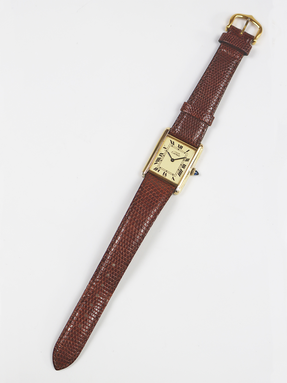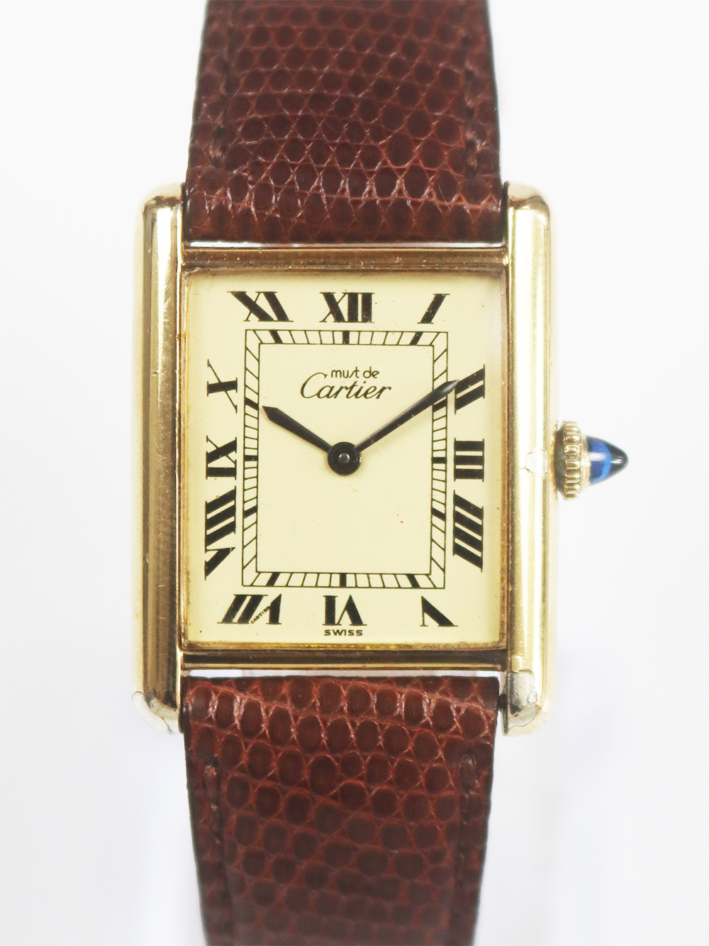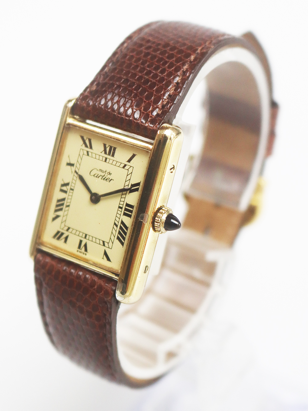 1970年代に入りますと、一度独自の時計制作から離れた事もあり、また、時代の移り変わりも相まって、消費需要の変化、販売戦略の見直し等が余儀なくされ、今までの高級志向を保ちつつもそれらのディフュージョンラインとしてスイスの機械供給メーカーの協力を経て、今までよりロープライスラインを拡充していきました。 その代表格がこのシルバーケースにゴールドプレート仕上げ(Vermeil=ヴェルメイユ)を施したタンクモデルのマストシリーズとなります。 然しながらその初期型のみ手巻きの機械式時計となり、1980年代頃より殆どが電池式(クォーツ)時計となりました。このモデルは初期型のケース固有番号付きの手巻きアイボリー光沢ローマ数字インデックスダイヤル仕様となります。 シルバーケースが故に経年変化が見られやすくゴールドプレートの剥離箇所等ございます。当時のままのオリジナルコンディションとなっております。