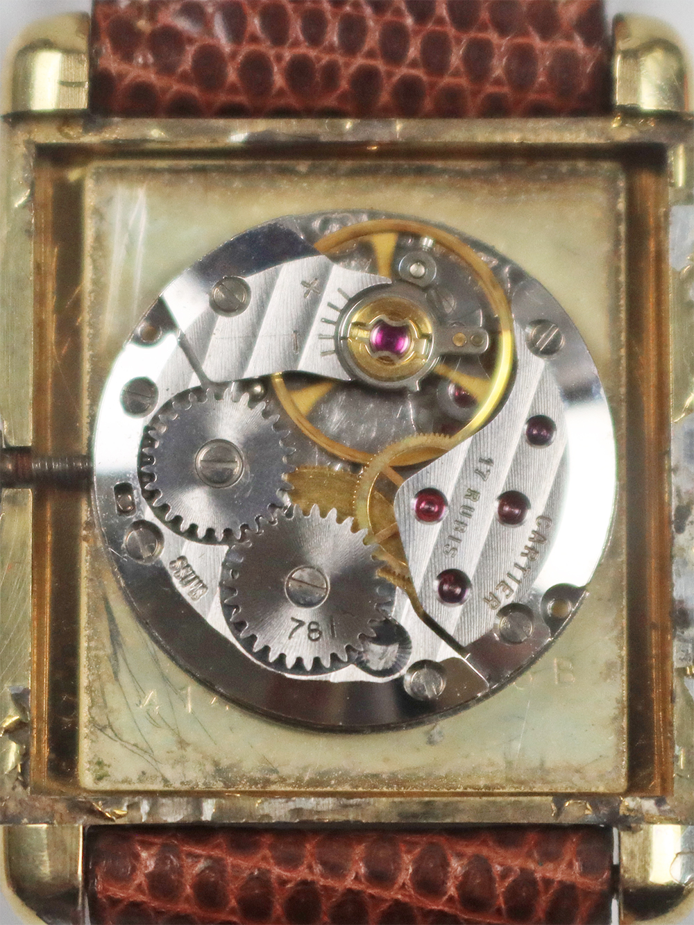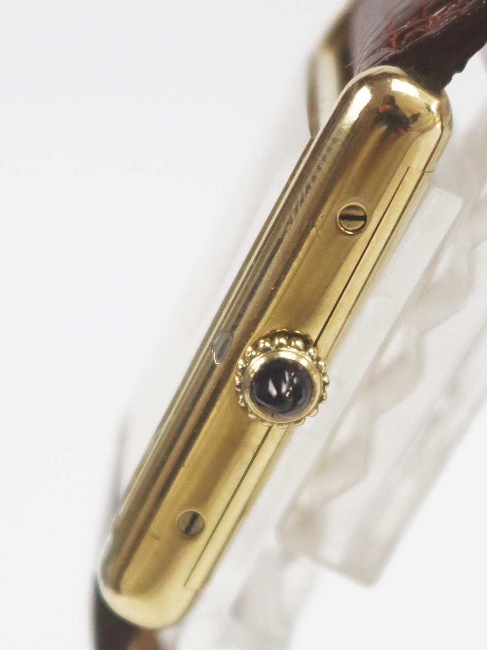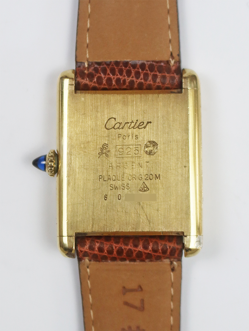 1970年代に入りますと、一度独自の時計制作から離れた事もあり、また、時代の移り変わりも相まって、消費需要の変化、販売戦略の見直し等が余儀なくされ、今までの高級志向を保ちつつもそれらのディフュージョンラインとしてスイスの機械供給メーカーの協力を経て、今までよりロープライスラインを拡充していきました。 その代表格がこのシルバーケースにゴールドプレート仕上げ(Vermeil=ヴェルメイユ)を施したタンクモデルのマストシリーズとなります。 然しながらその初期型のみ手巻きの機械式時計となり、1980年代頃より殆どが電池式(クォーツ)時計となりました。このモデルは初期型のケース固有番号付きの手巻きアイボリー光沢ローマ数字インデックスダイヤル仕様となります。 シルバーケースが故に経年変化が見られやすくゴールドプレートの剥離箇所等ございます。当時のままのオリジナルコンディションとなっております。