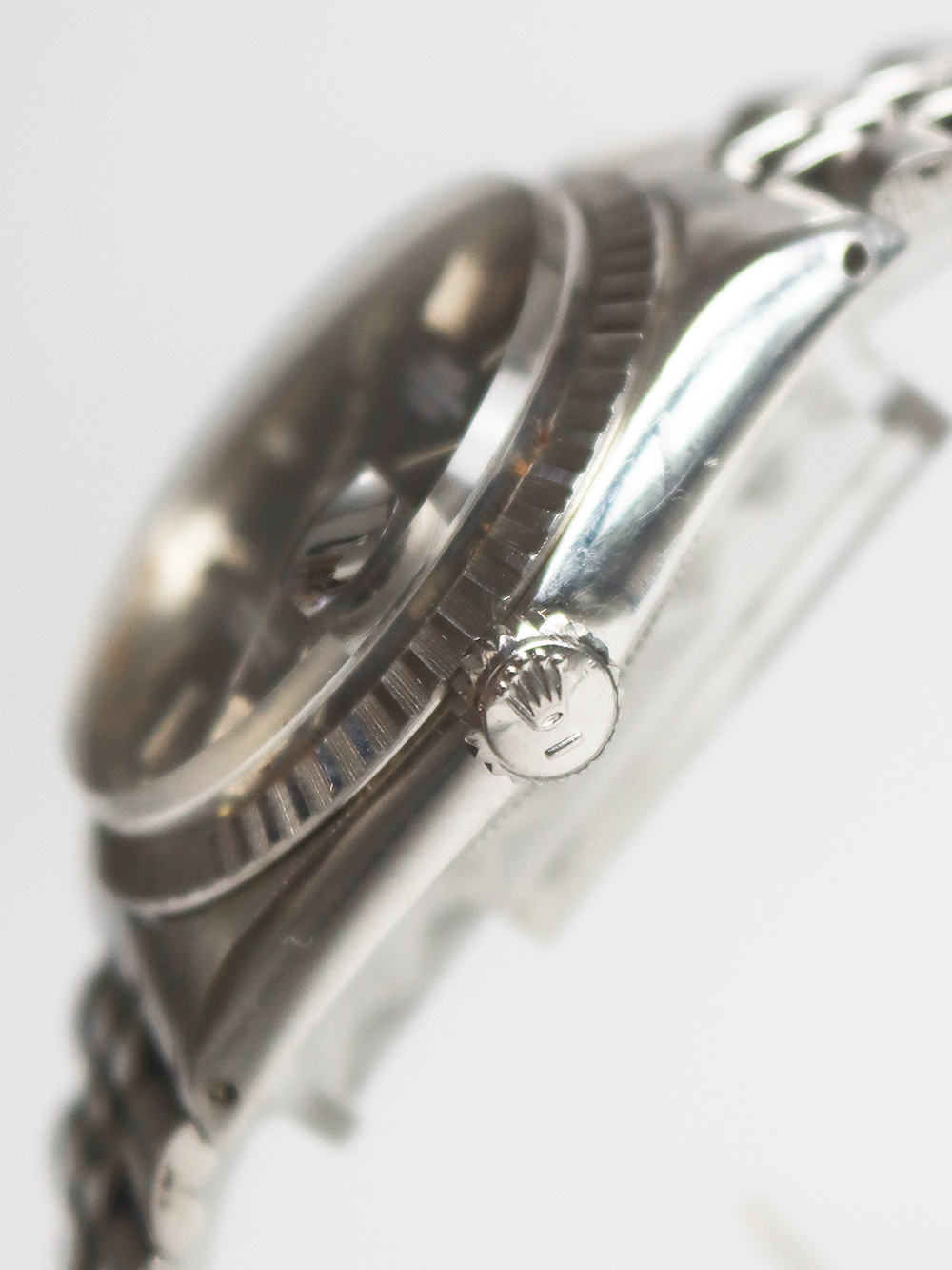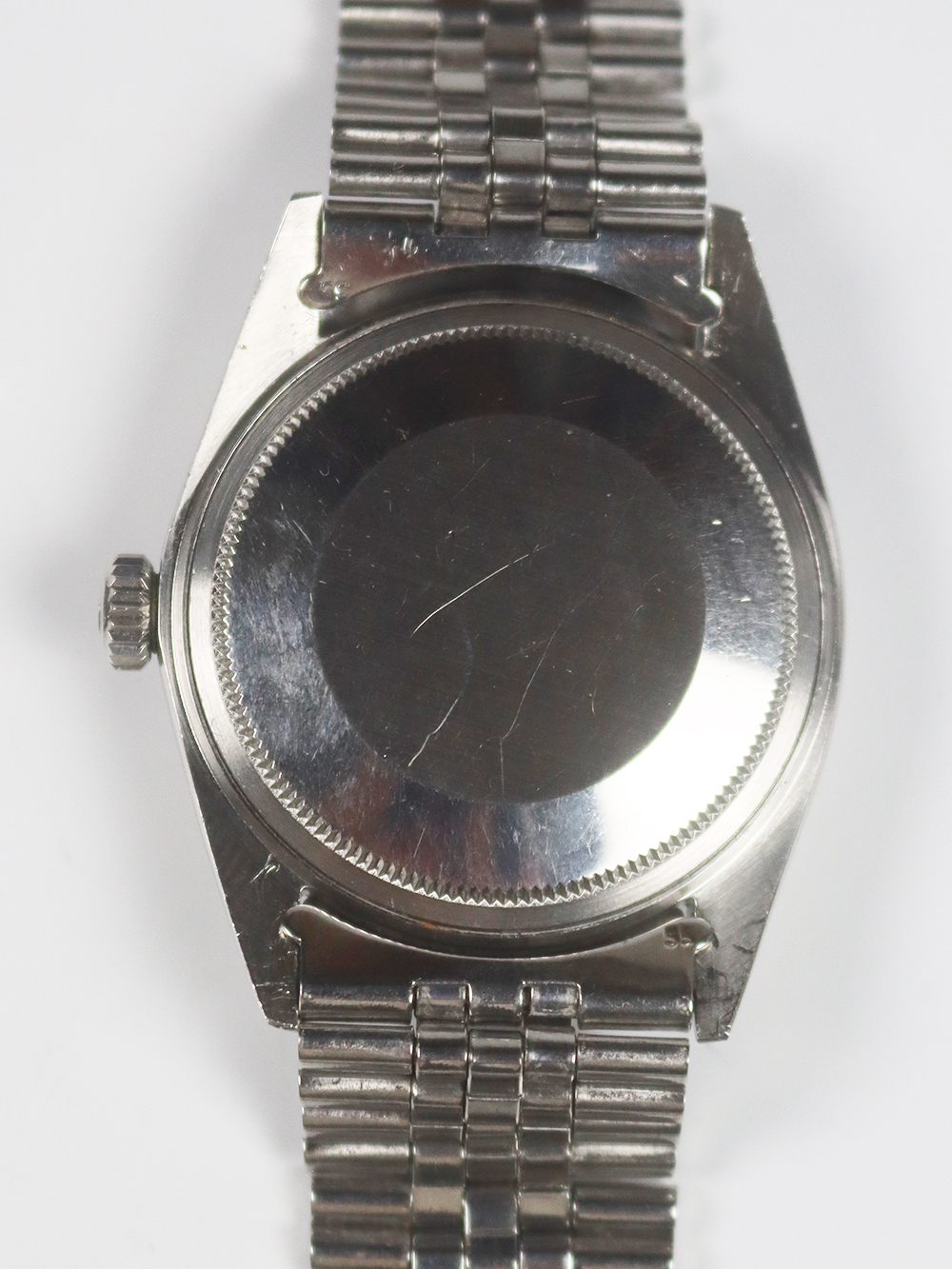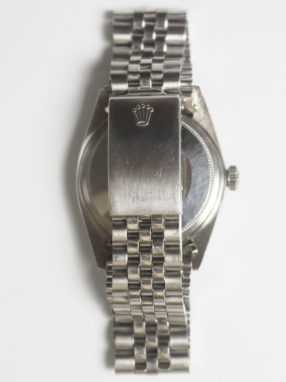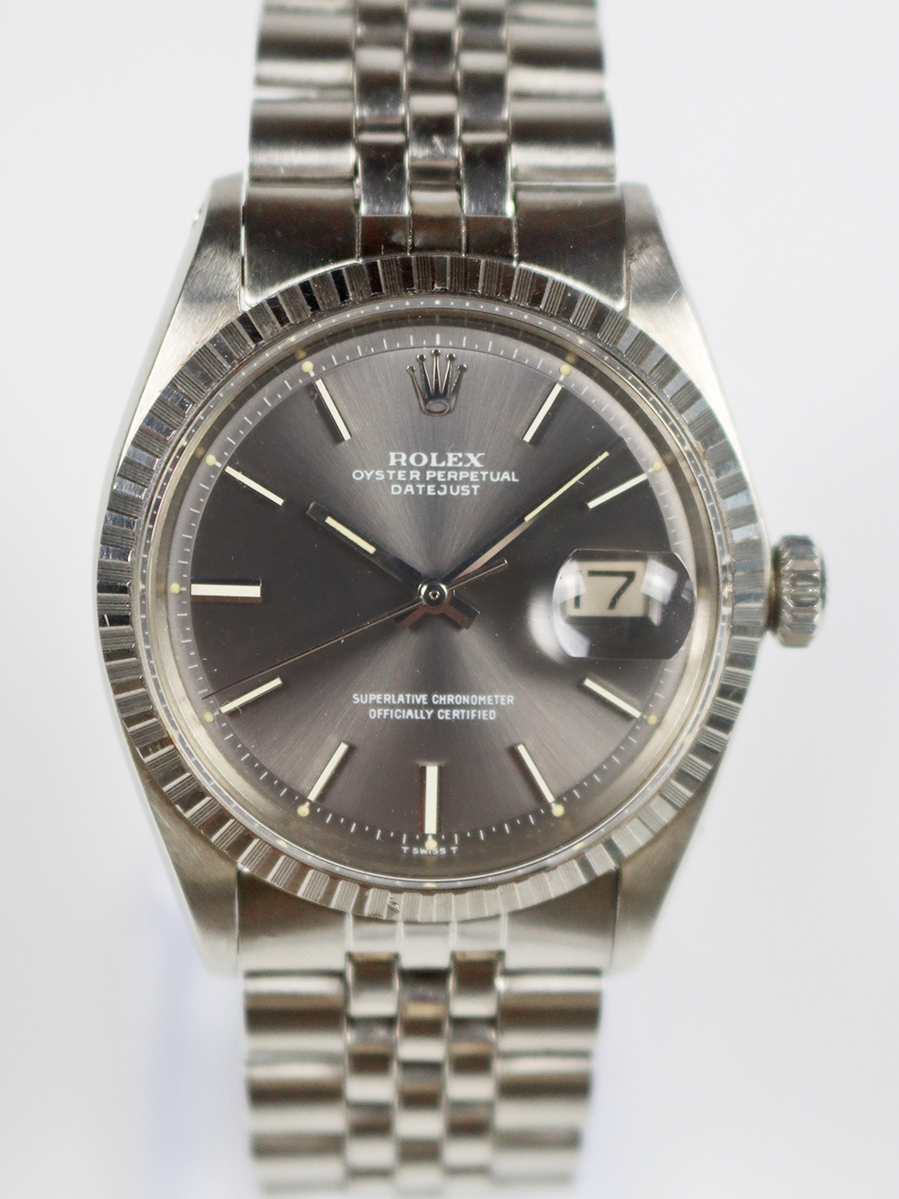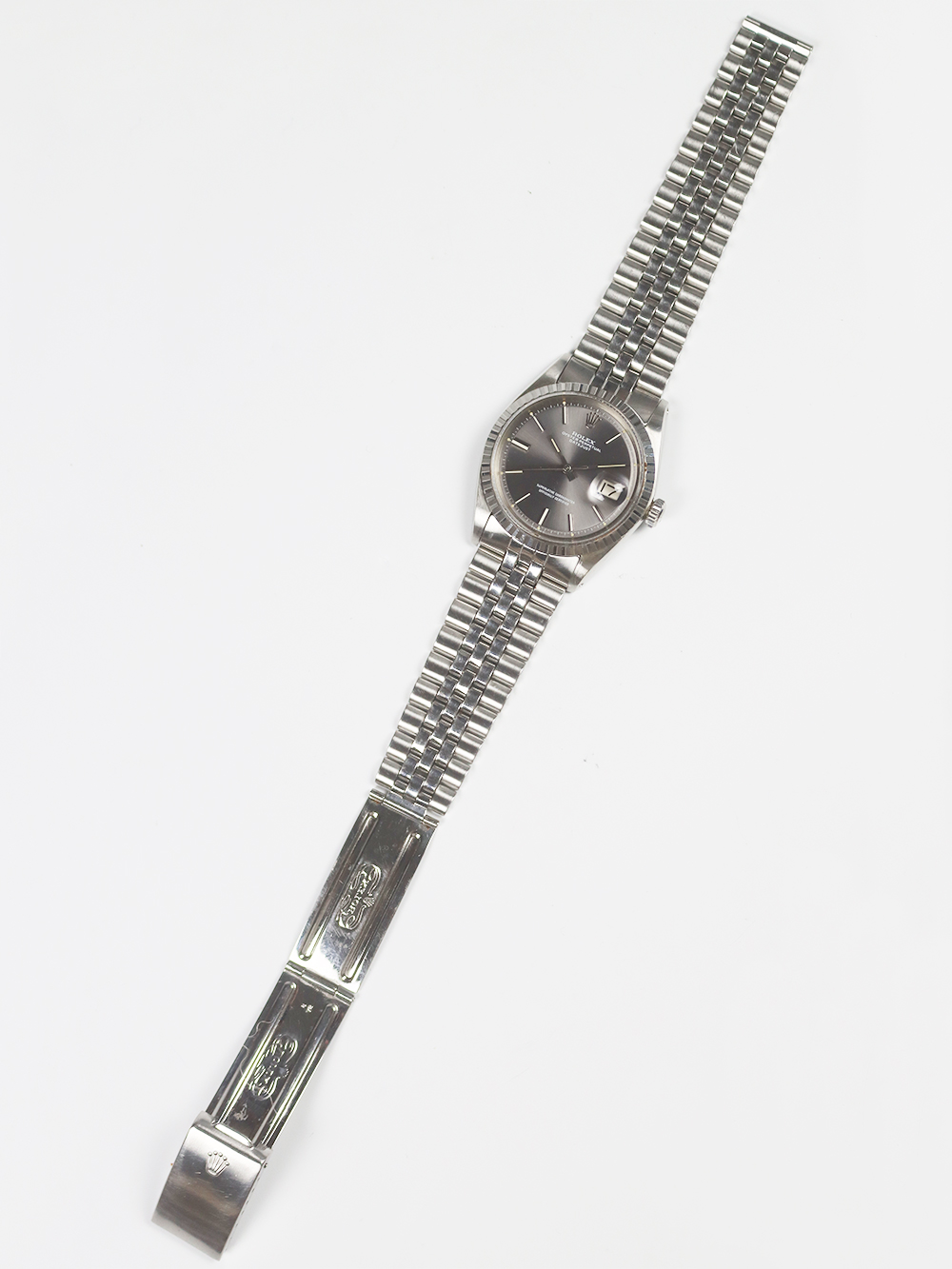 このREF.1603は1970年製のスンレススチールケースにステンレススチールベゼル仕様のデイトジャスト、クロノメーターモデルでは珍しいシャイニーライトグレーダイヤル仕様となります。ロレックス社は1965年以降に文字盤が今までのインデックスの装飾性や文字盤地板の変化に富んだ工法を排除し、極めてシンプルなデザイン(インデックスがバトン型、針もストレート針)になって行きましたがこのモデルは正にそのシンプルな仕様となったモデルで全て当時のままのオリジナルコンディションとなっております。ダイヤルは僅かな経年変化が見られますが、文字プリントが小さめの当時のままのオリジナル仕様となっております。ブレスレットはフォルデッドジュビリーブレスレットとなっており、コマ間は若干の緩みが見られますが全体に当時のままのとても良いオリジナルコンディションとなっております。
